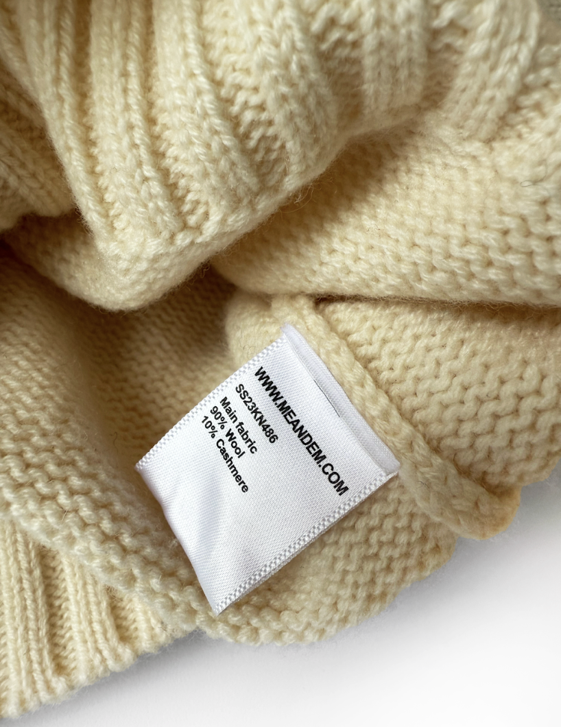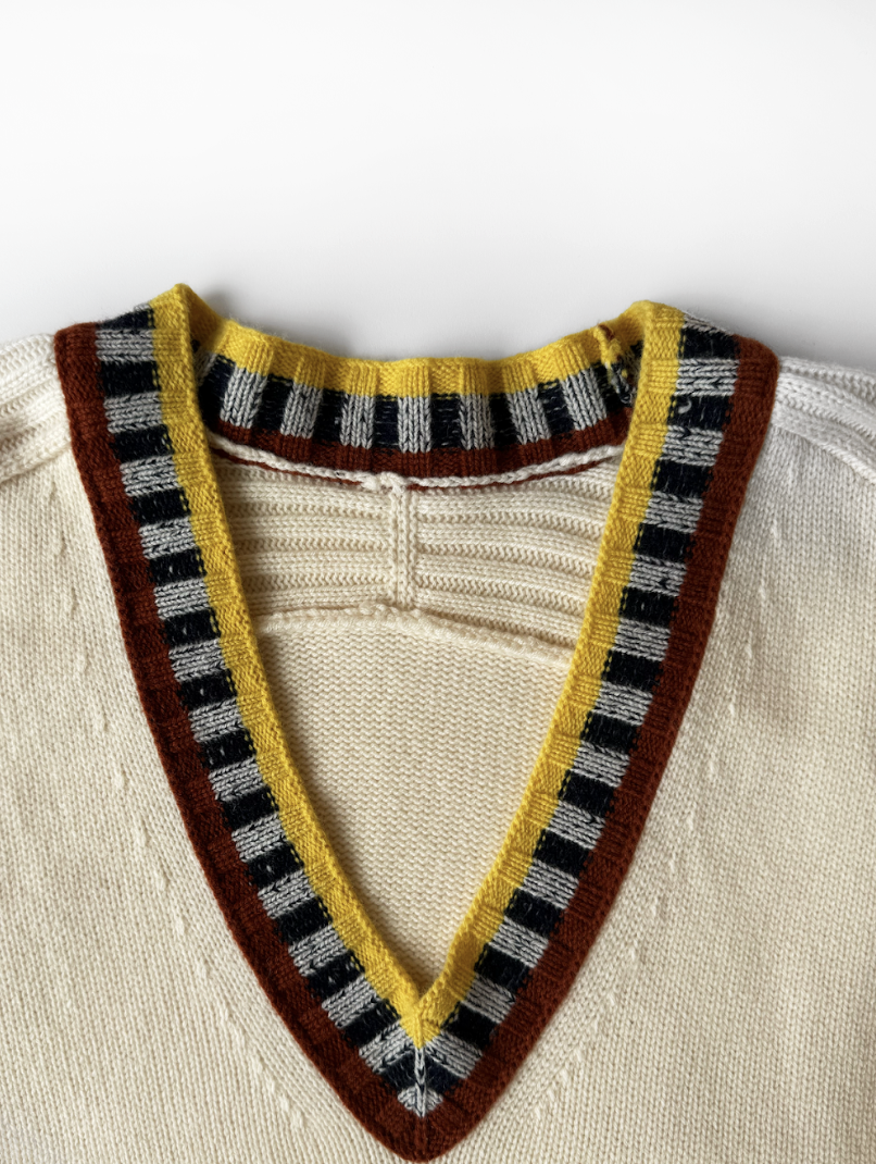 Cream wool and cashmere blend v-neck jumper in perfect, never worn condition, with contrasting trim at neckline and cuffs. Composition: 90% wool, 10% cashmere.