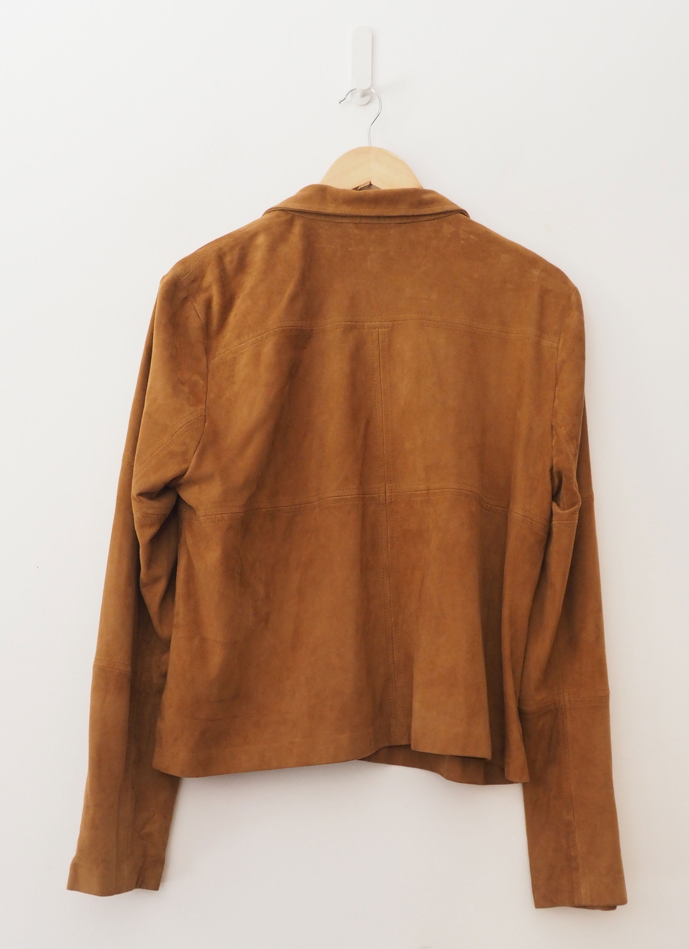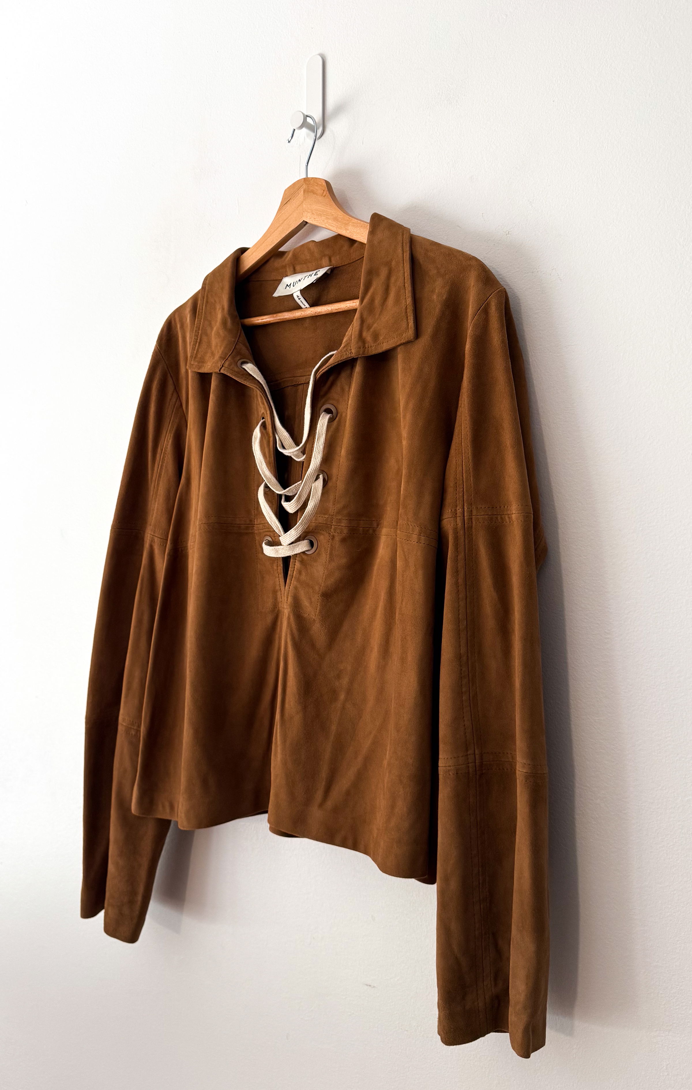 Elegant suede leather blouse, with a half-down opening and a beautiful tie detail. This blouse has long sleeves, and is made for a regular fit.