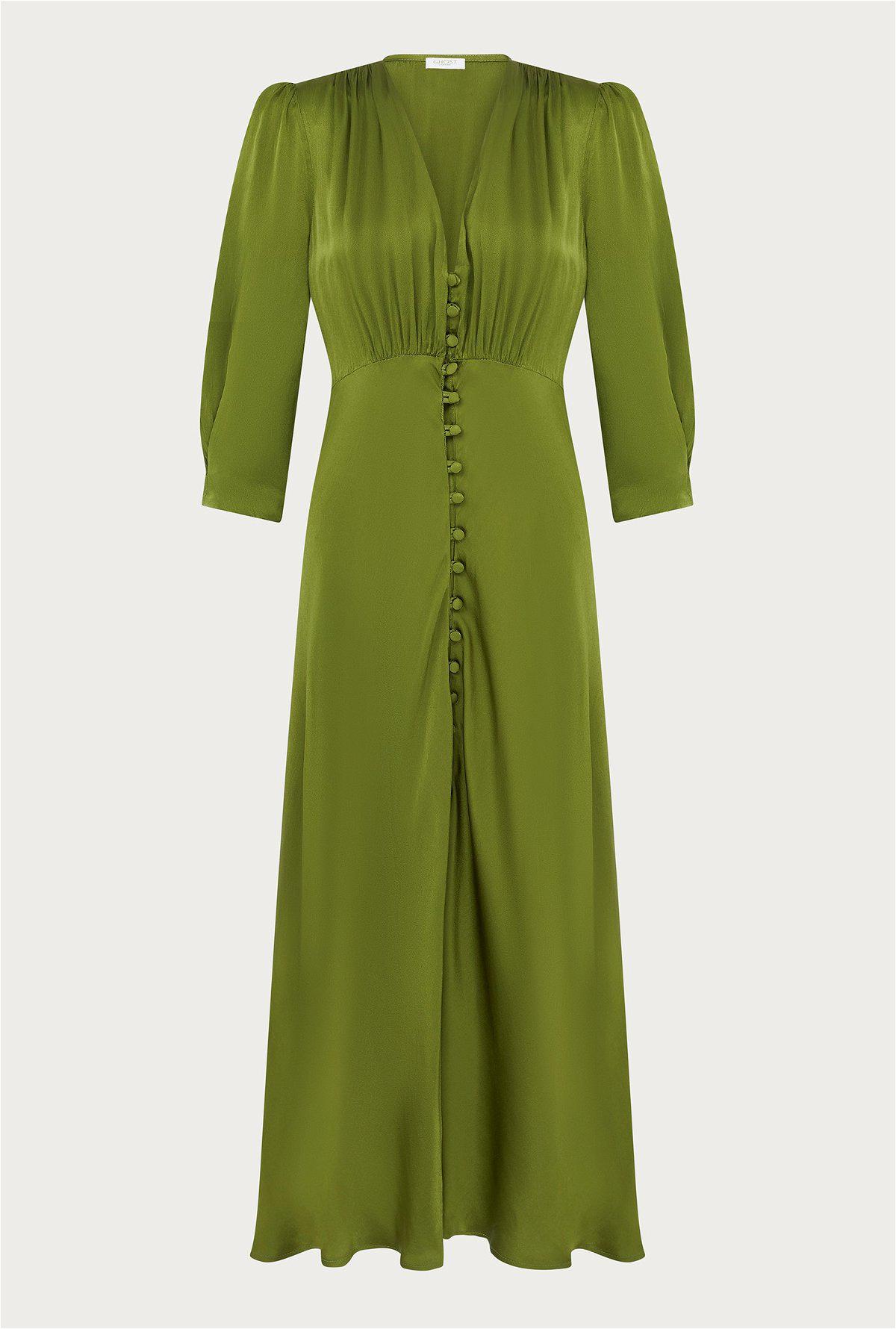 Fully lined in twill and a colourful additional to your Spring wardrobe, this playful printed dress is crafted from comfortable georgette. There's an added invisible side zip which helps fit the dress beautifully to your shape, and there’s a deep keyhole at the back with matching covered buttons. Ghost have gathered the bodice into a high collar and double frill, and repeated those frills on the short sleeve heads.