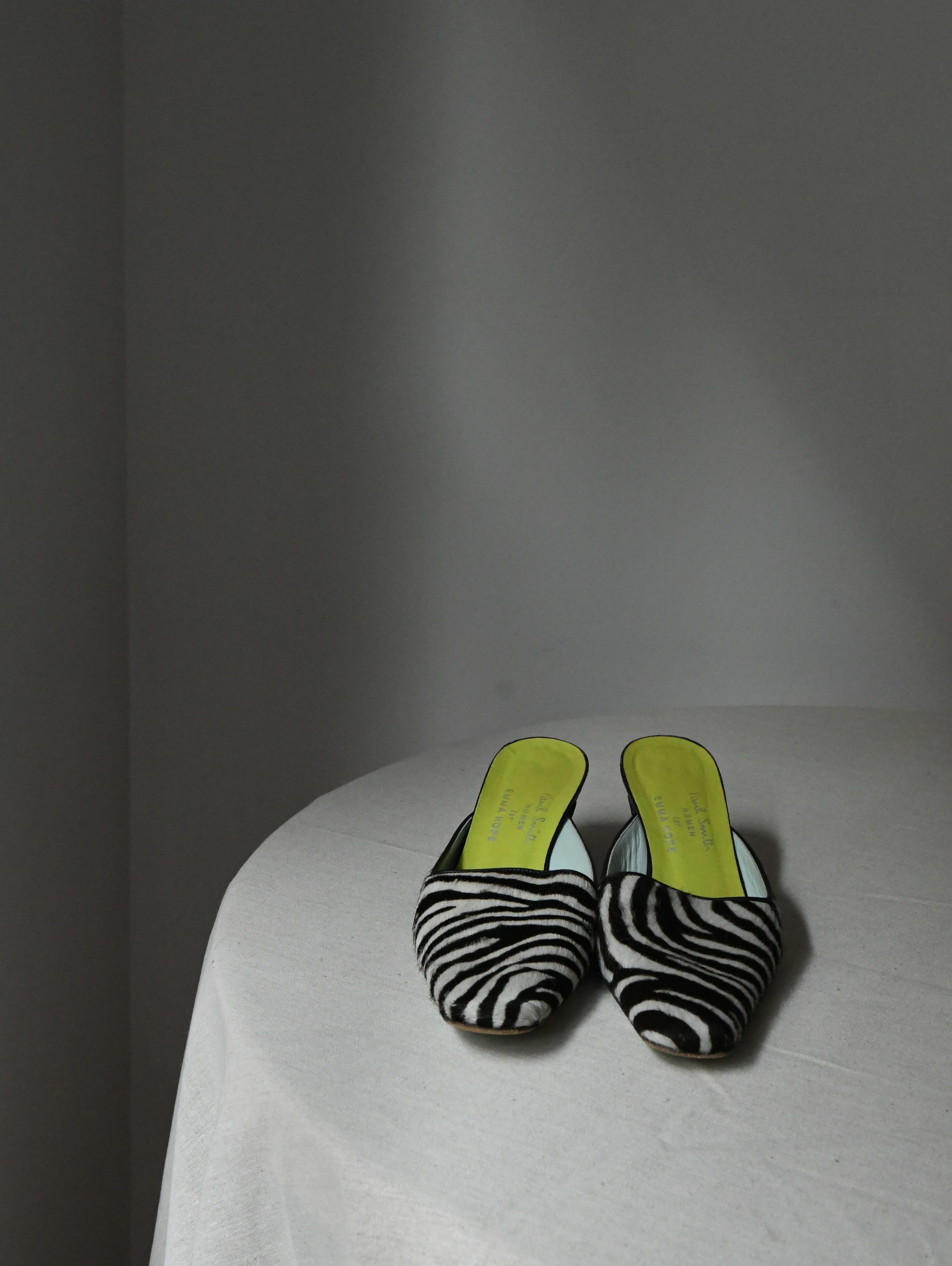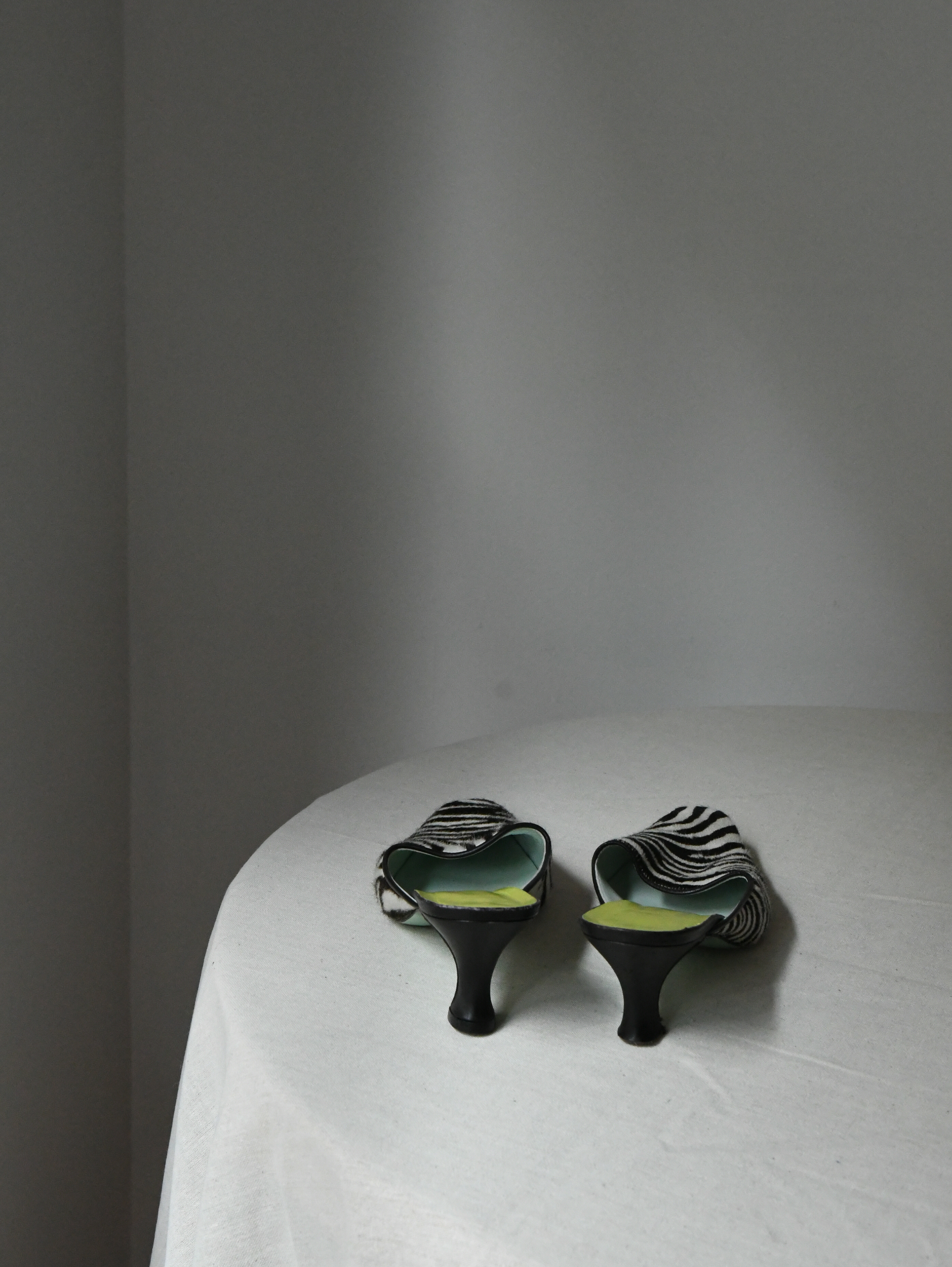 Zebra print, calf hair, kitten heel mules in really good condition.