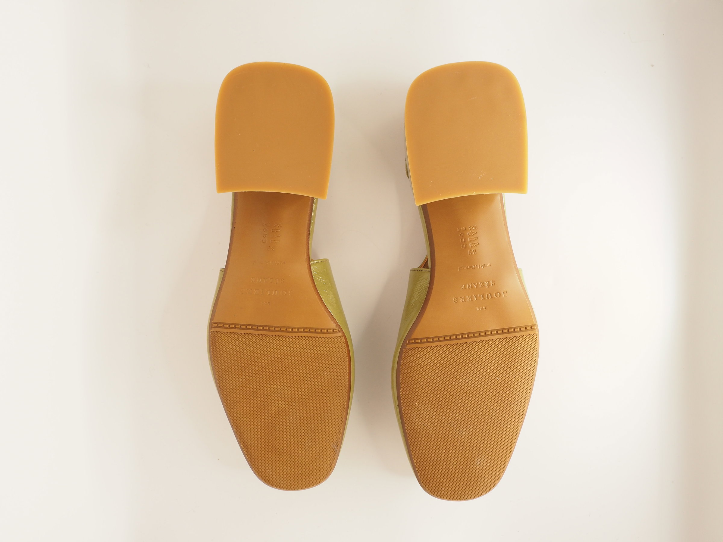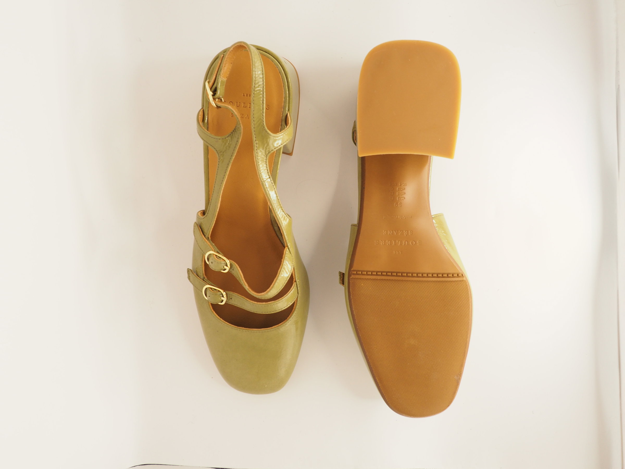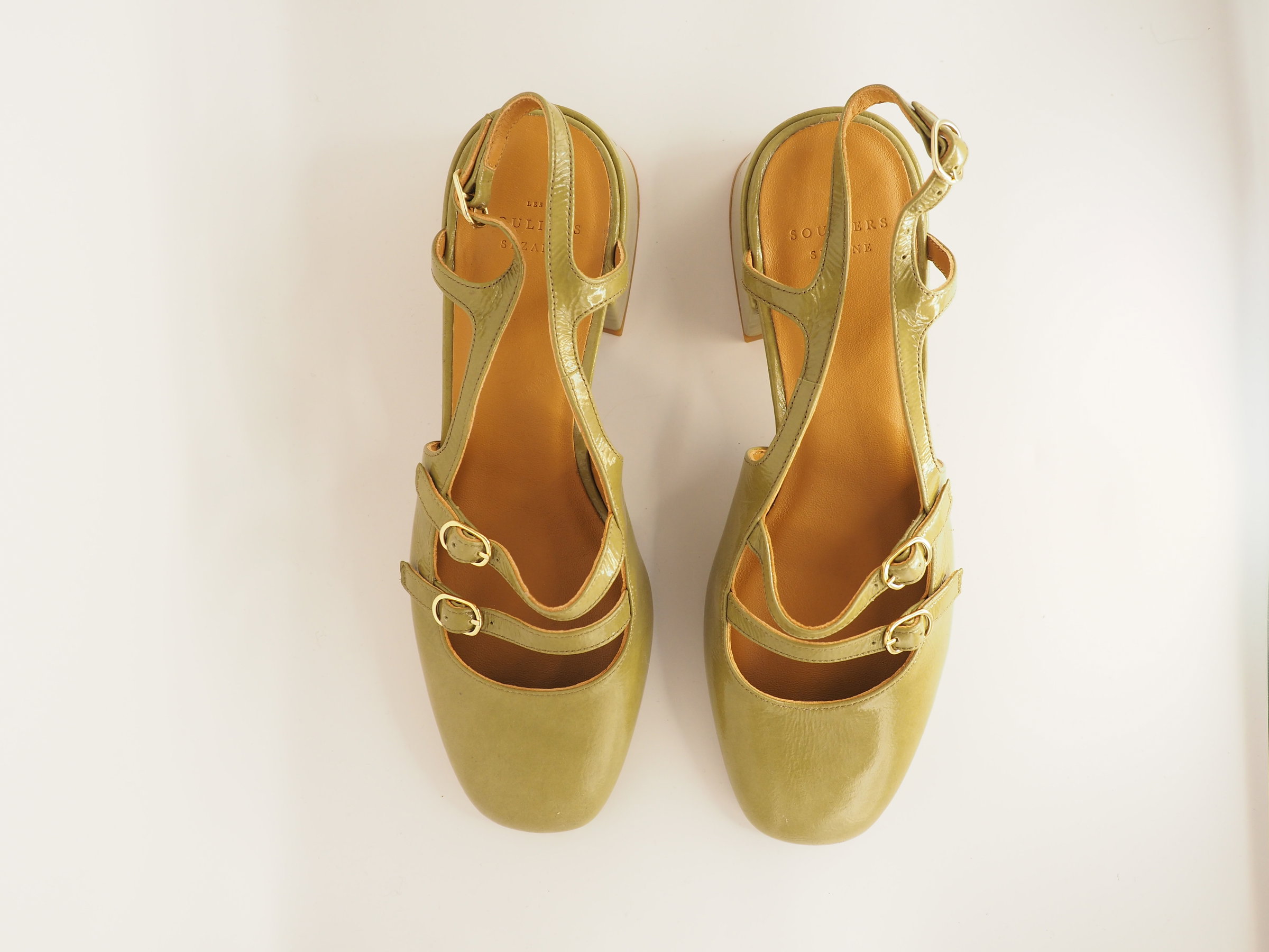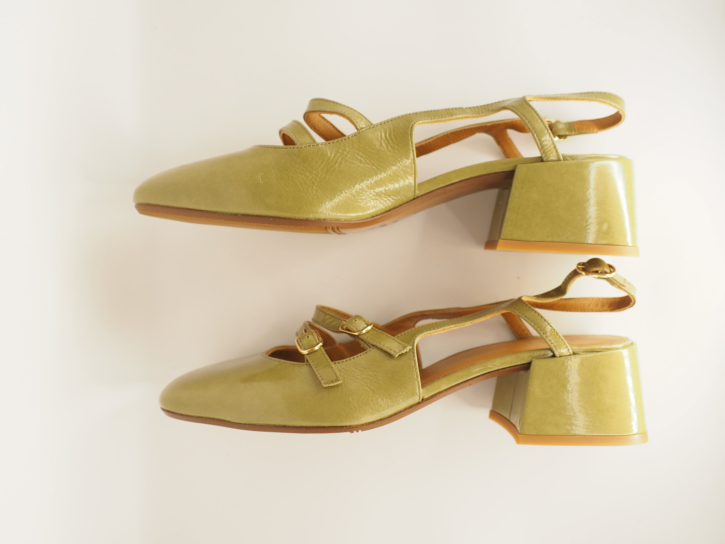 Green Paula Babies with mid-height heels in perfect, never worn condition. Buckled ankle strap fastening system. Smooth leather exterior. Leather lining and insole. Leather-covered heel. Heel height: 5 cm / 2 inches. Antique gold-finish brass buckle.