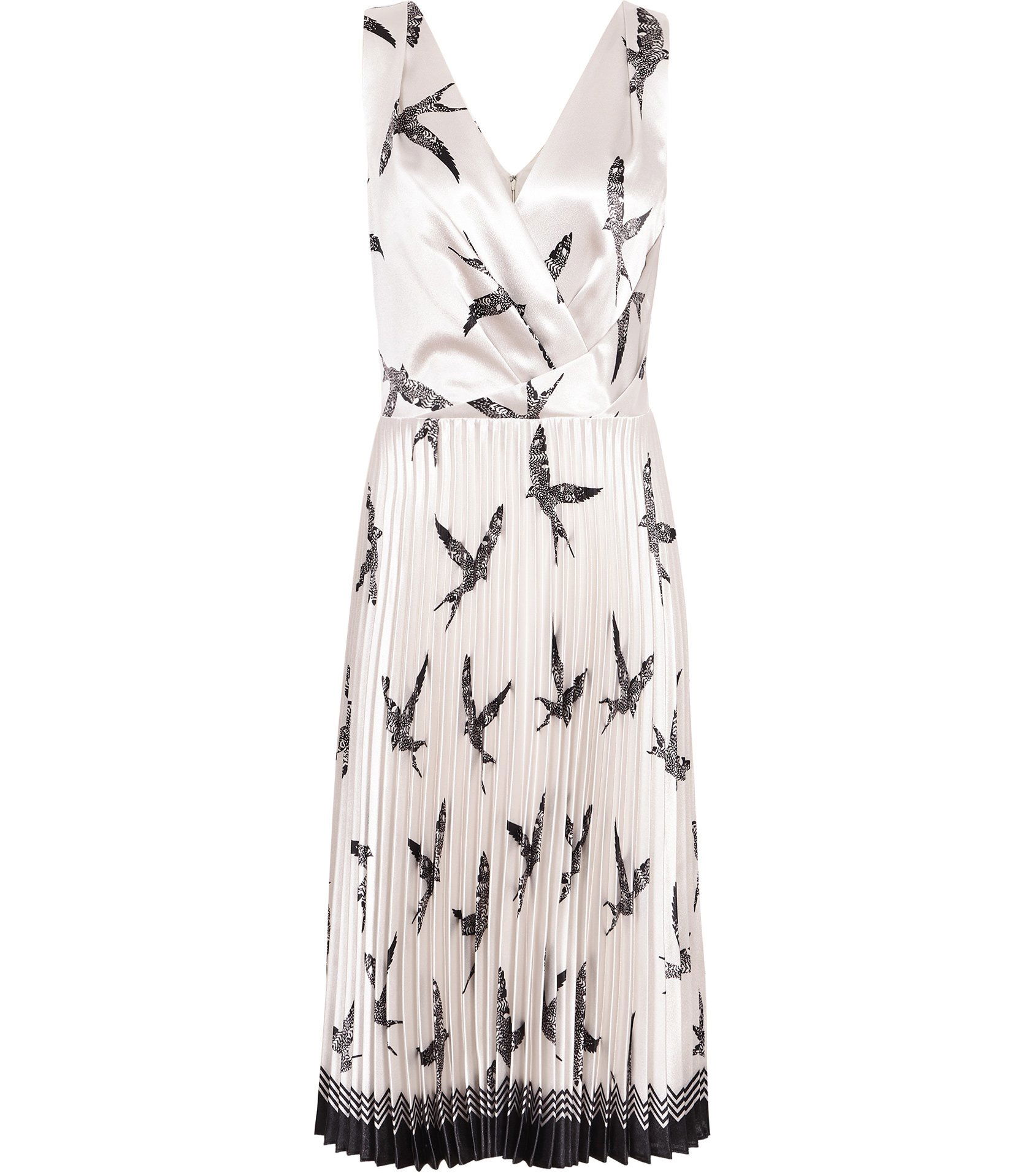 The Peyton midi dress in white is adorned with a stunning bird print, making it a statement addition to any wardrobe. It's cut from high-shine satin with a sleeveless crossover top and a knife-pleat skirt that will move beautifully as you walk. The ideal plus-one come event season and the kind of dress that works best with a simple pair of nude heels and a dash of jewellery.