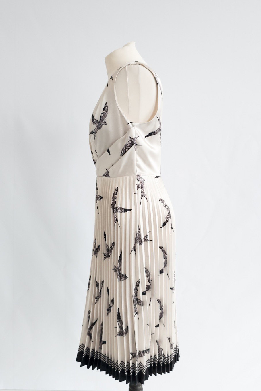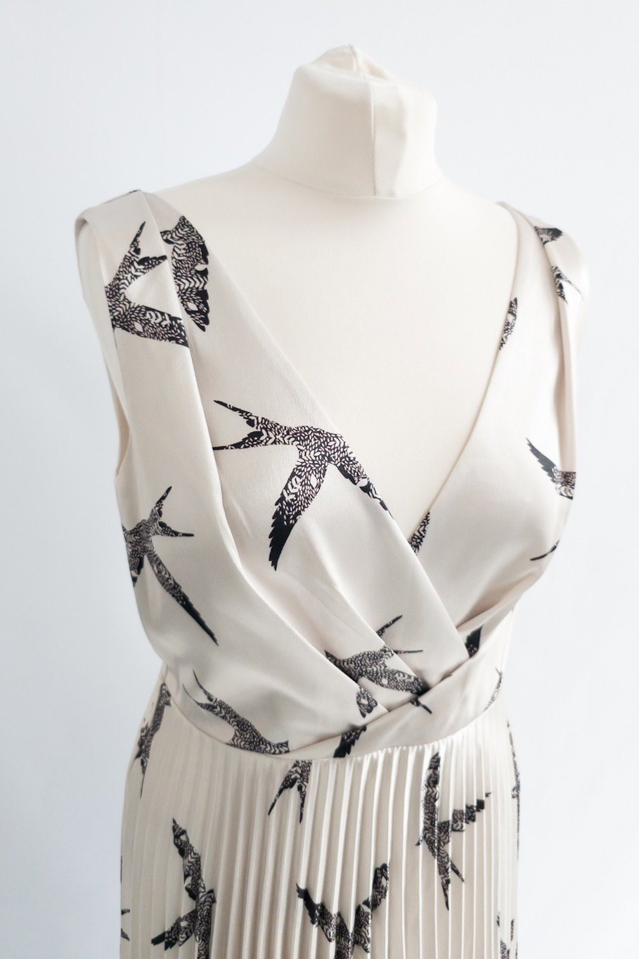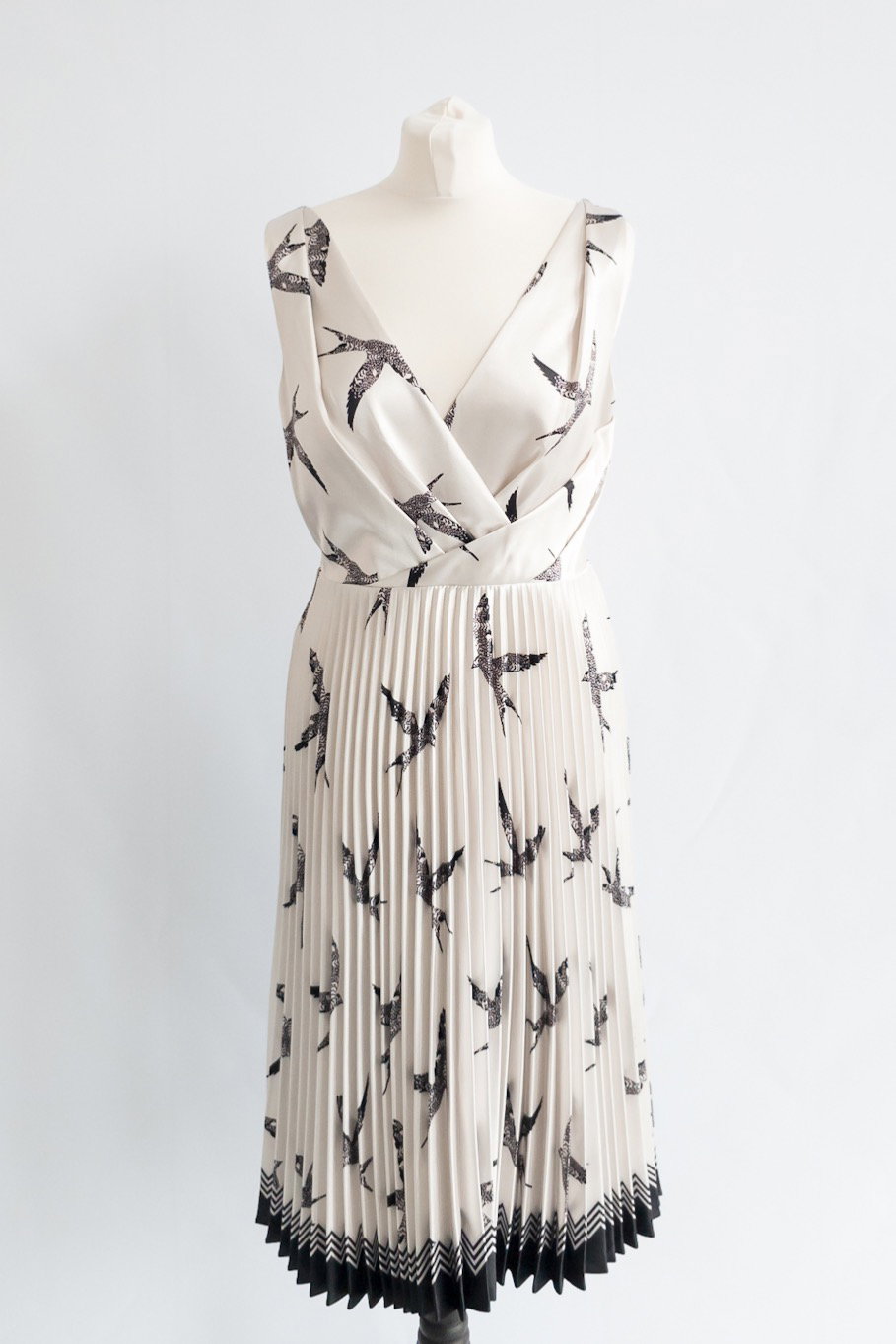 - Black bird printed dress with draped bodice and pleated skirt - The end of the skirt goes into a slight chevron detail. - Dress has a pearly sheen and a hidden zip at the back with hook and eye detail Label size: UK 10 RRP £238 Quality: Excellent pre-loved condition