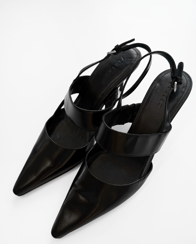 These velvet slingback kitten heels are designed with a pointed closed toe, a small heel and a silver buckle at the ankle. They're the perfect shoes to wear with a dress to work or an event outfit at the weekend.