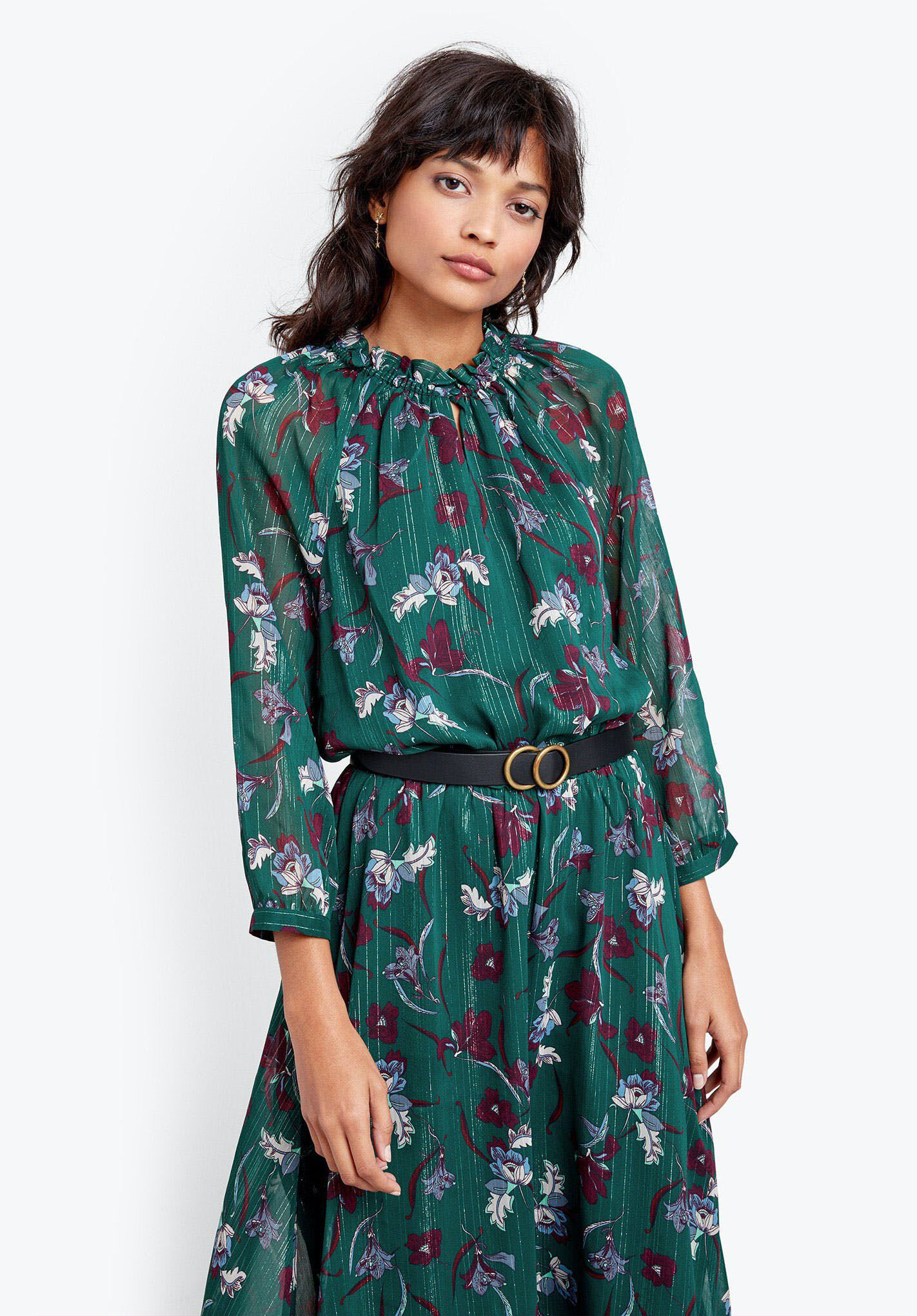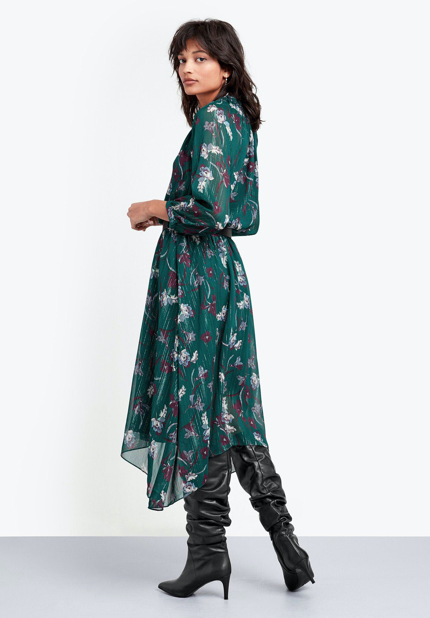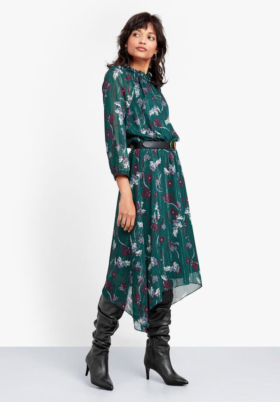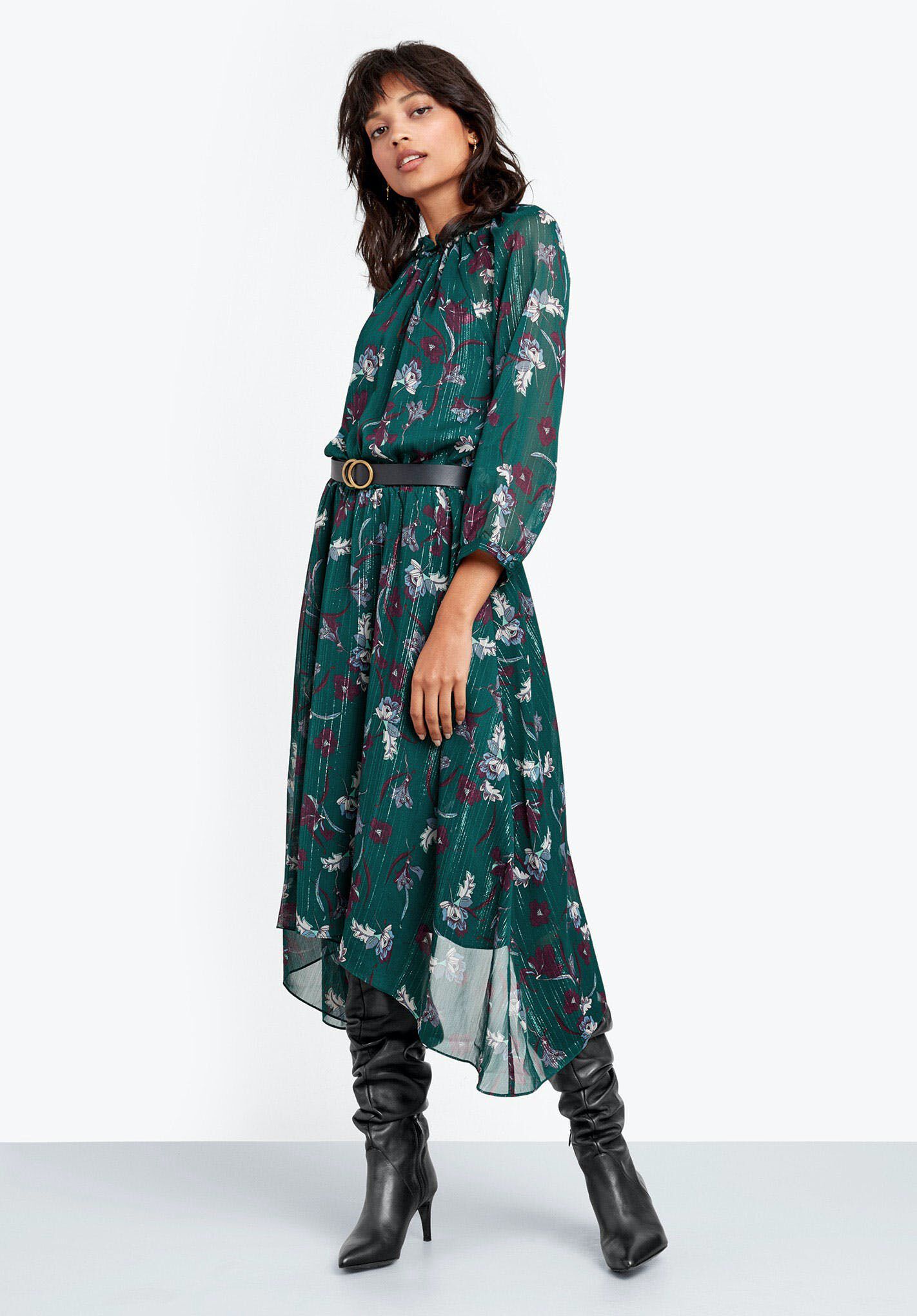 Elevate your winter wardrobe with this eye-catching midi dress. Cut in a flowing chiffon, and patterned with a beautiful floral and metallic stripe print, style with a belt at the waist.