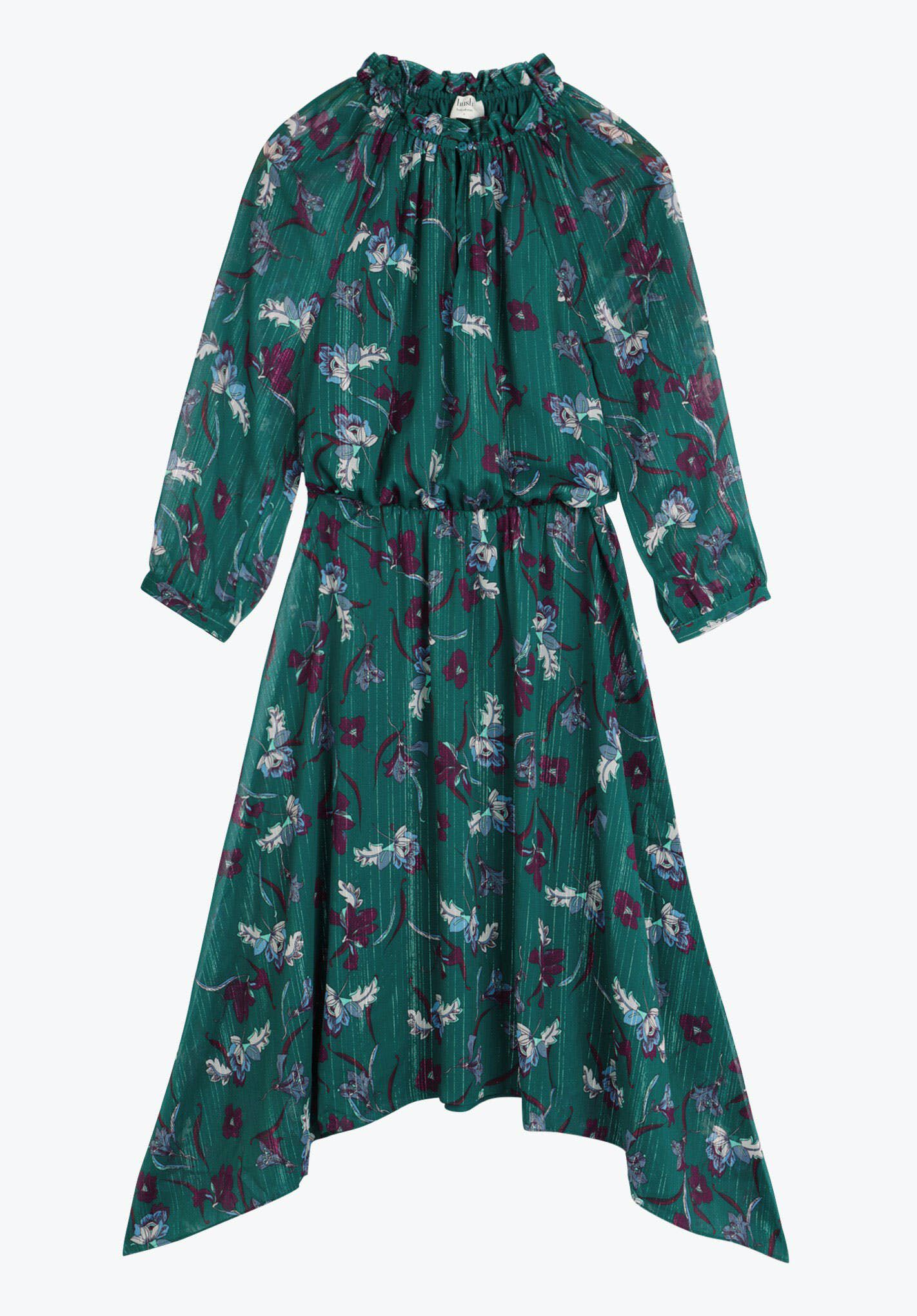 Elevate your winter wardrobe with this eye-catching midi dress, cut in a flowing chiffon and patterned with a beautiful floral and metallic stripe print - Elasticated neckline and waist with ruffles and keyhole detail at centre front at neckline with single button and loop closure Label Size: UK 10