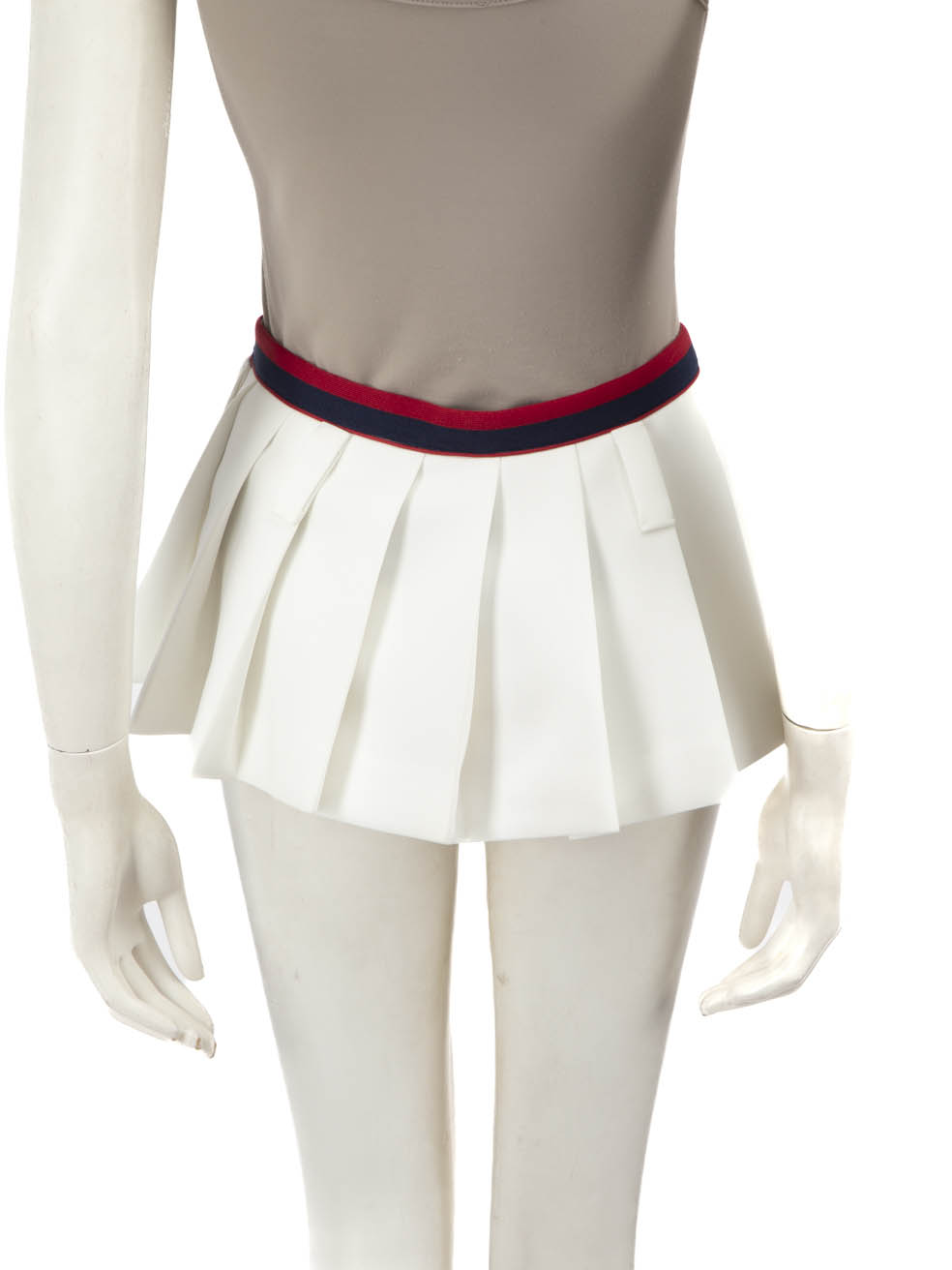 White pleated mini skirt in excellent, pre-loved condition. With red and navy striped detail on waistband, belt loops and side zip fastening. Composition: no composition label but feels like synthetic. Professional dry clean only. Waist: 40 cm Hip: 48 cm Length: 24 cm