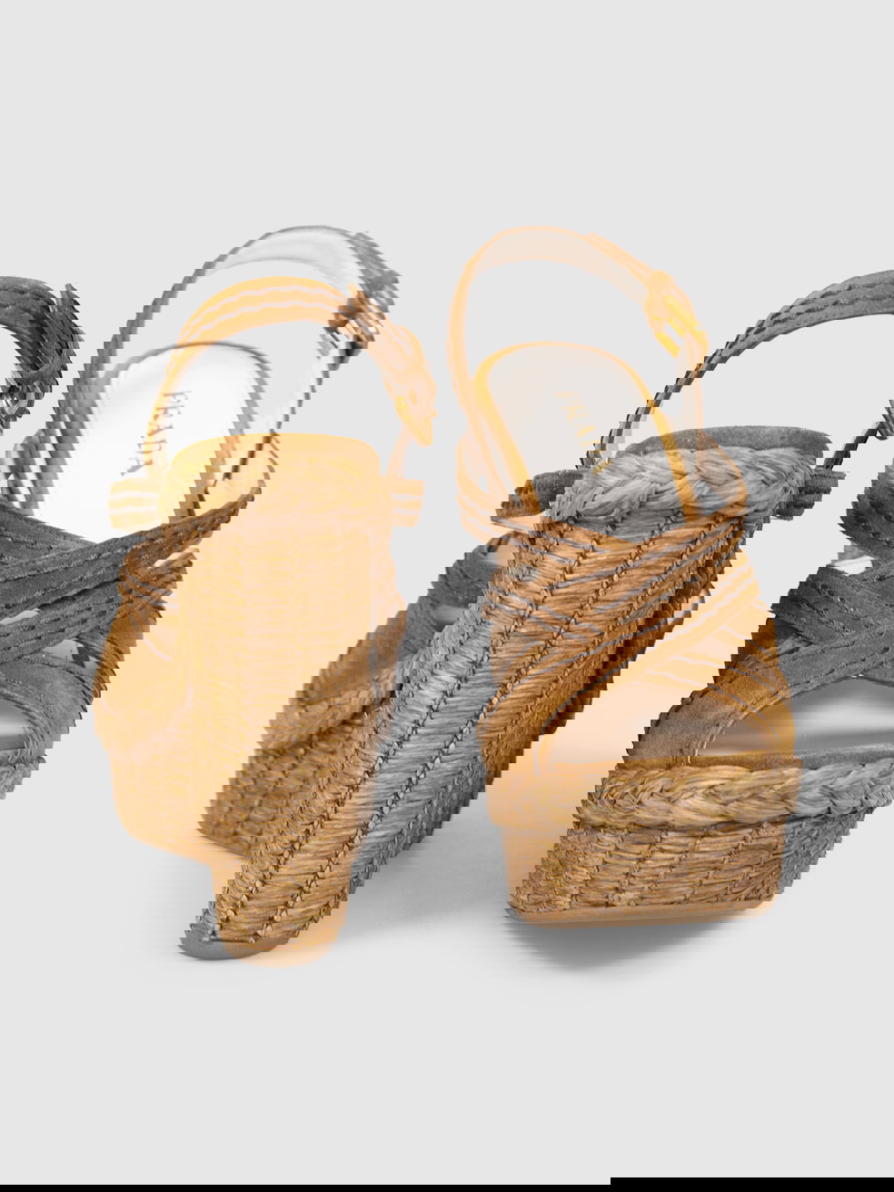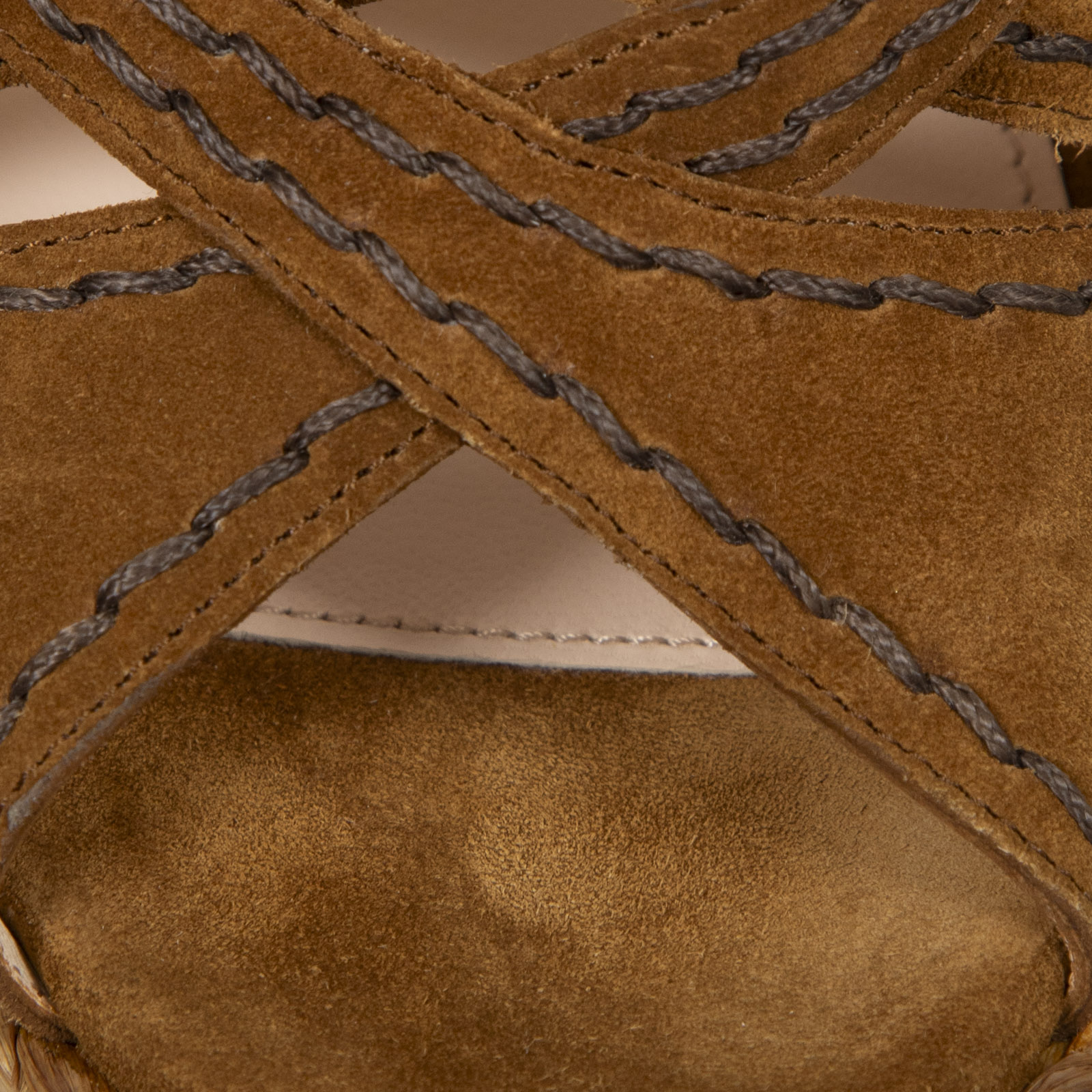 Brown suede and wicker wedge sandals in perfect, never worn condition. Comes with original dust bags and box. Measurements: platform height 40mm, heel height 160mm, soles 220mm, insoles 260mm, width sole 70mm.
