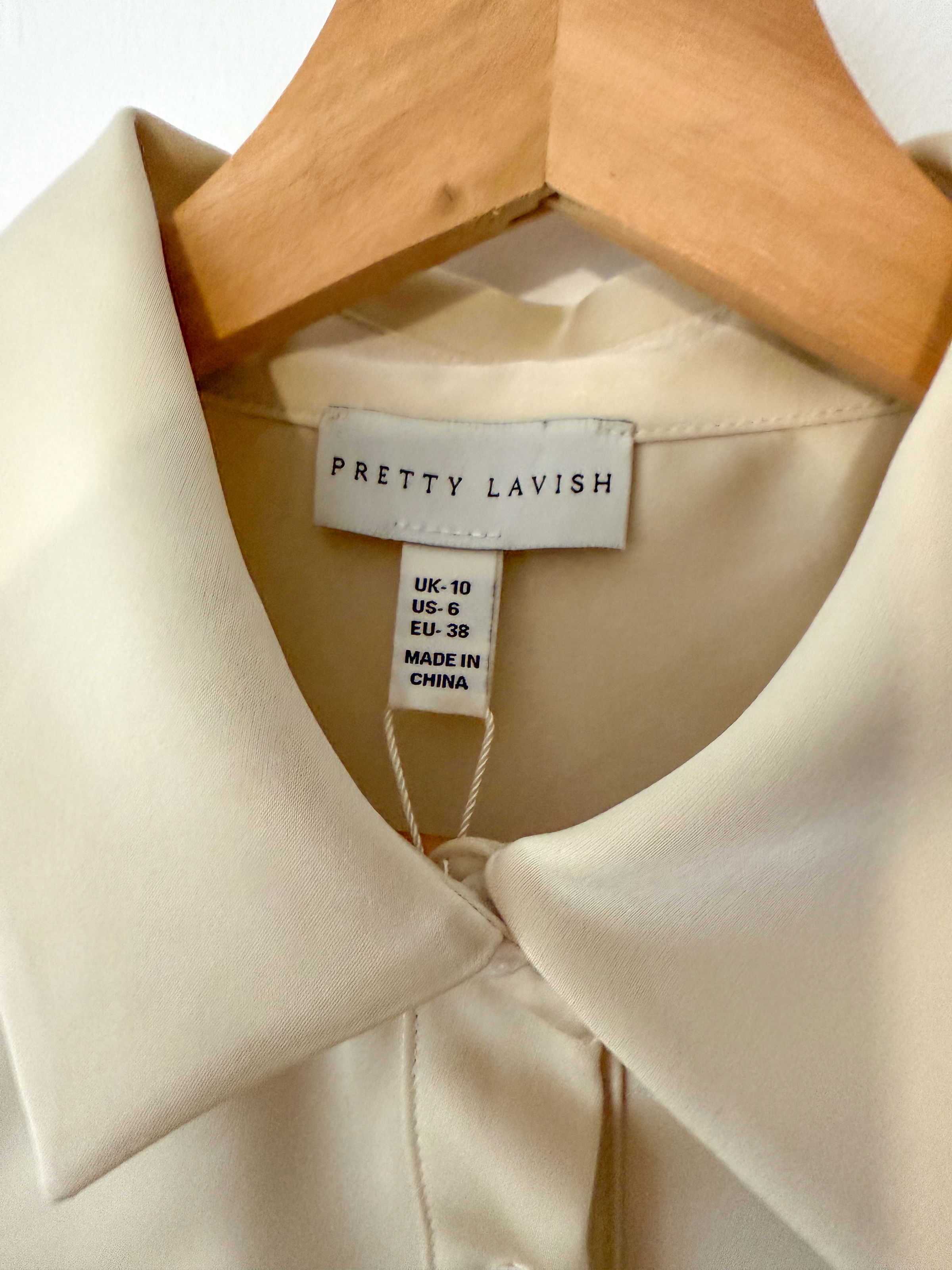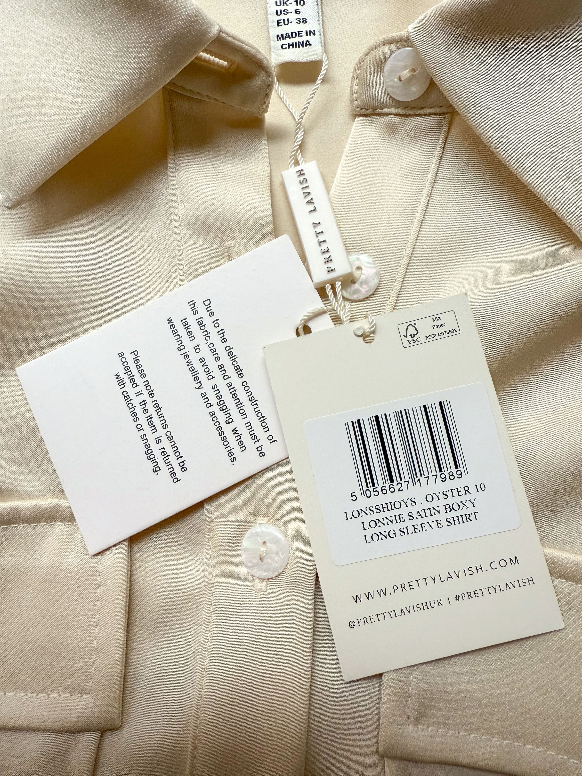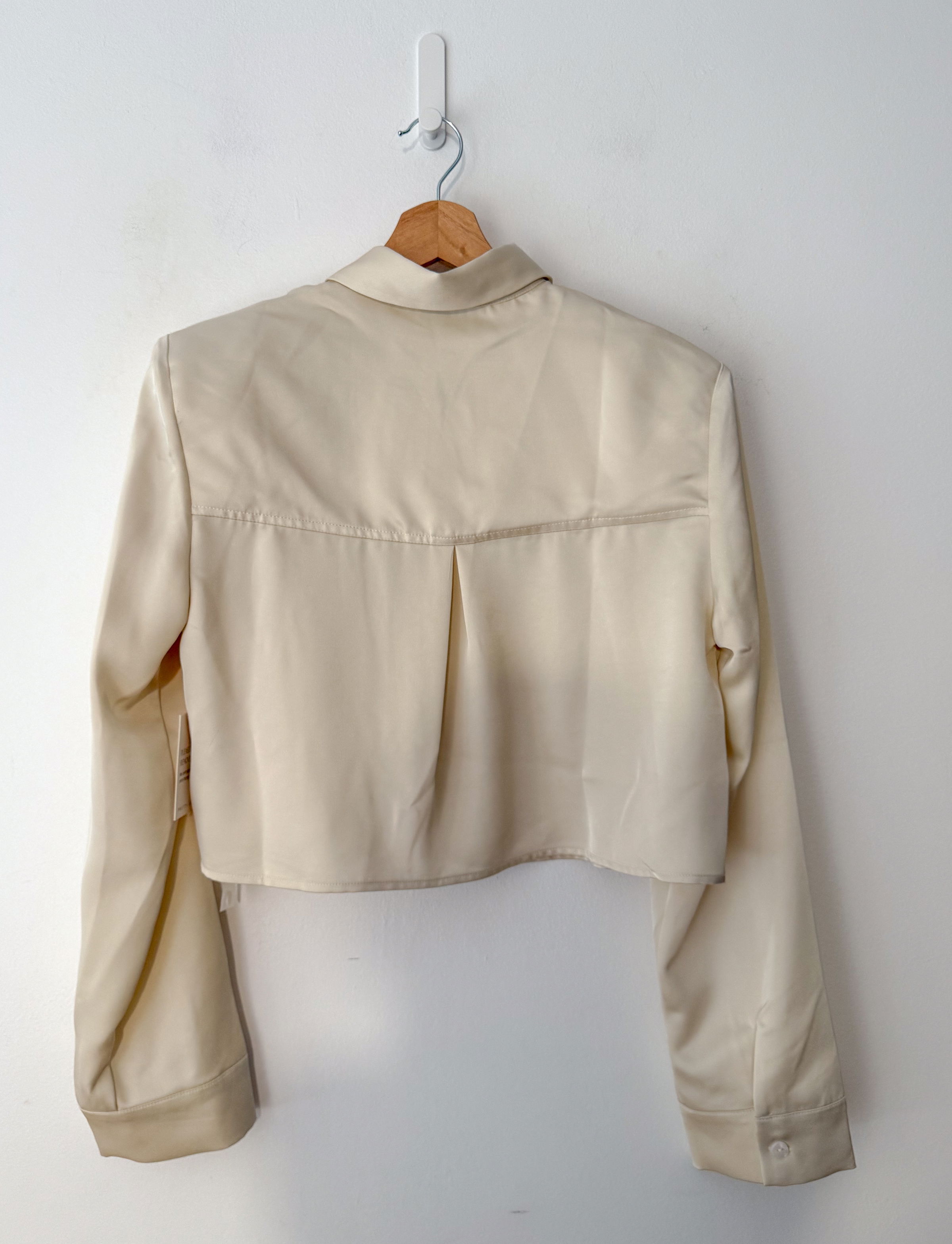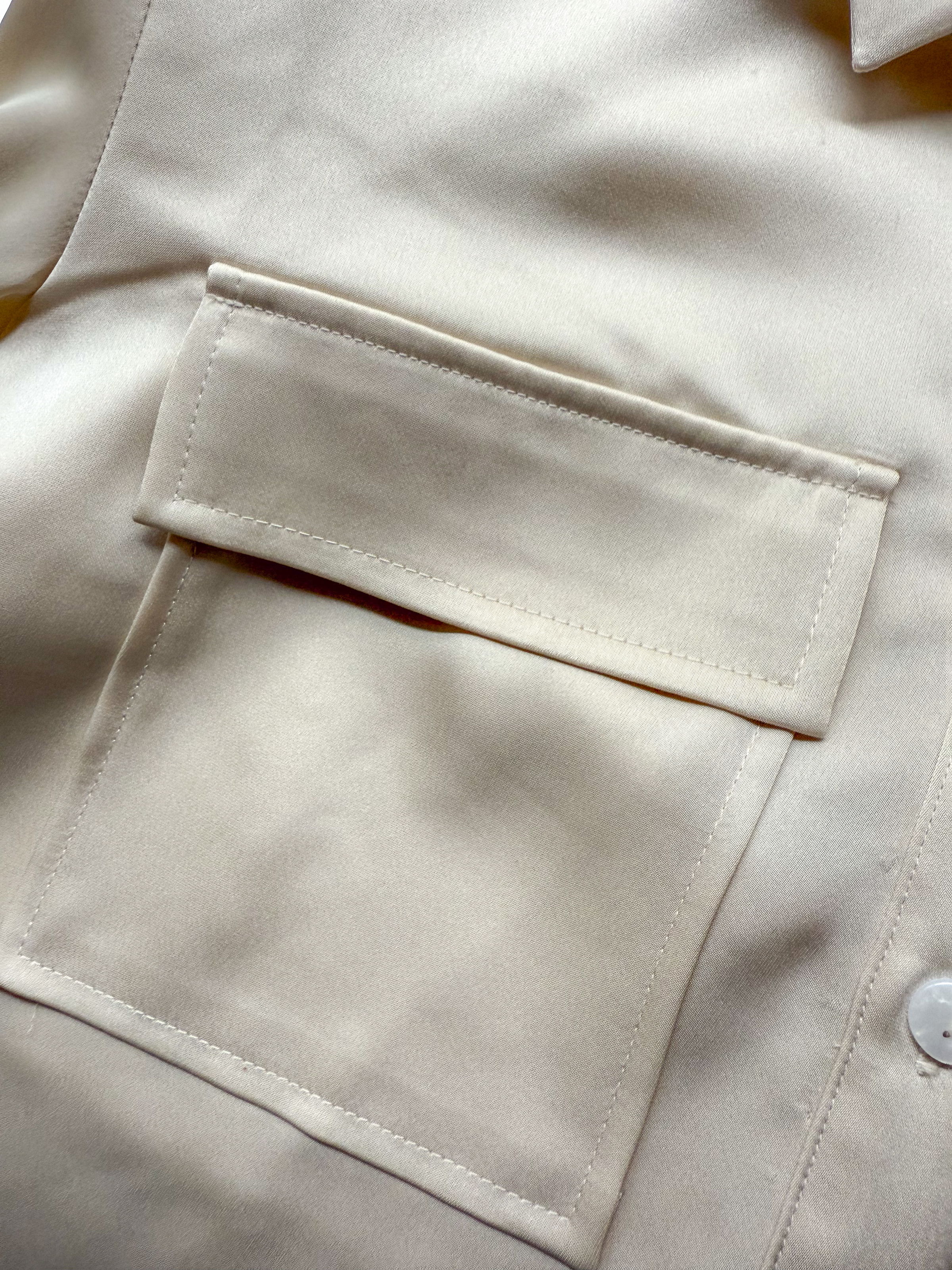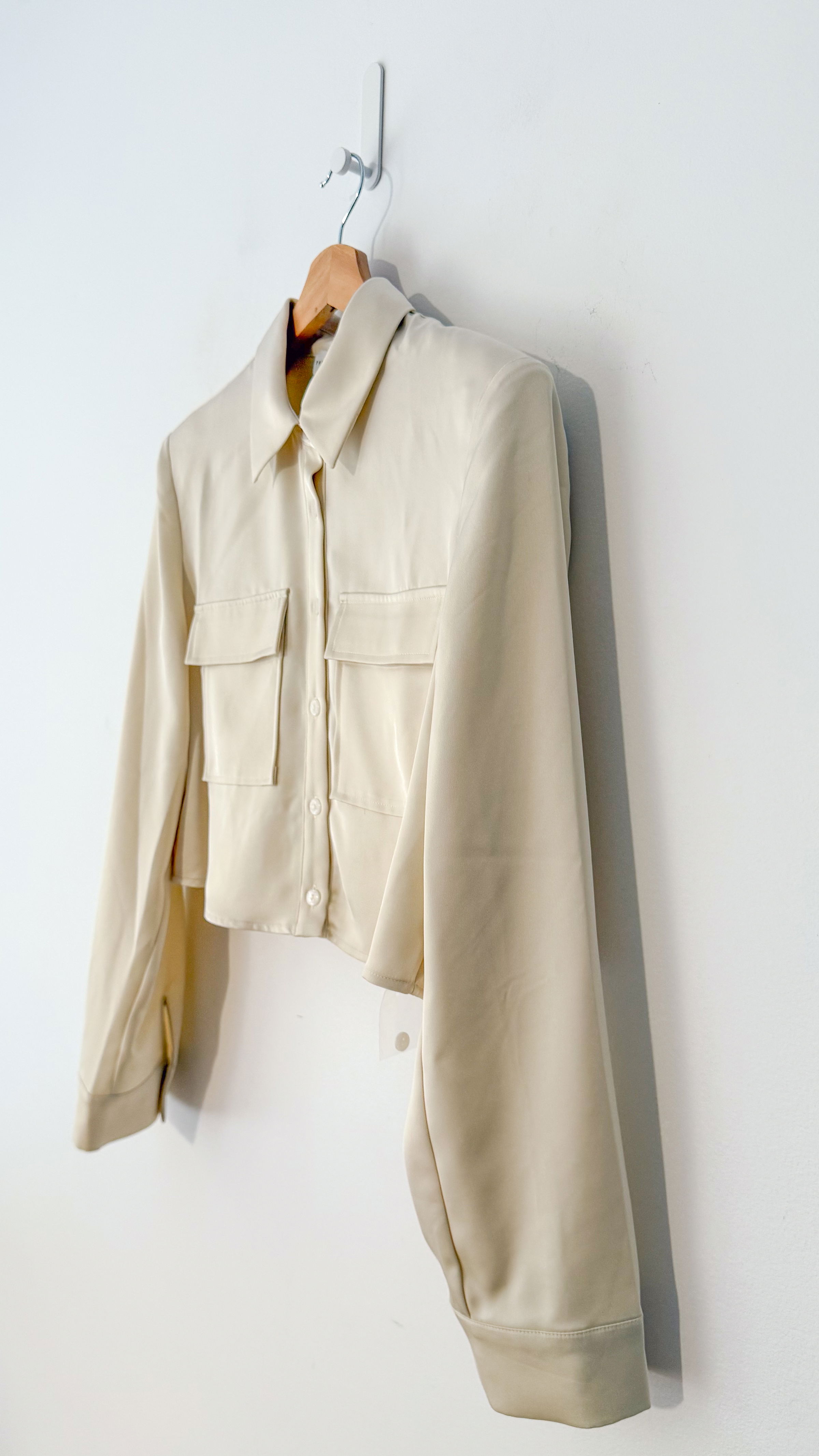Premium satin. Shoulder pads. Boxy/loose fit. Functional button fastening. Functional cuffs. Utility style pockets. Pleat detail at the back.