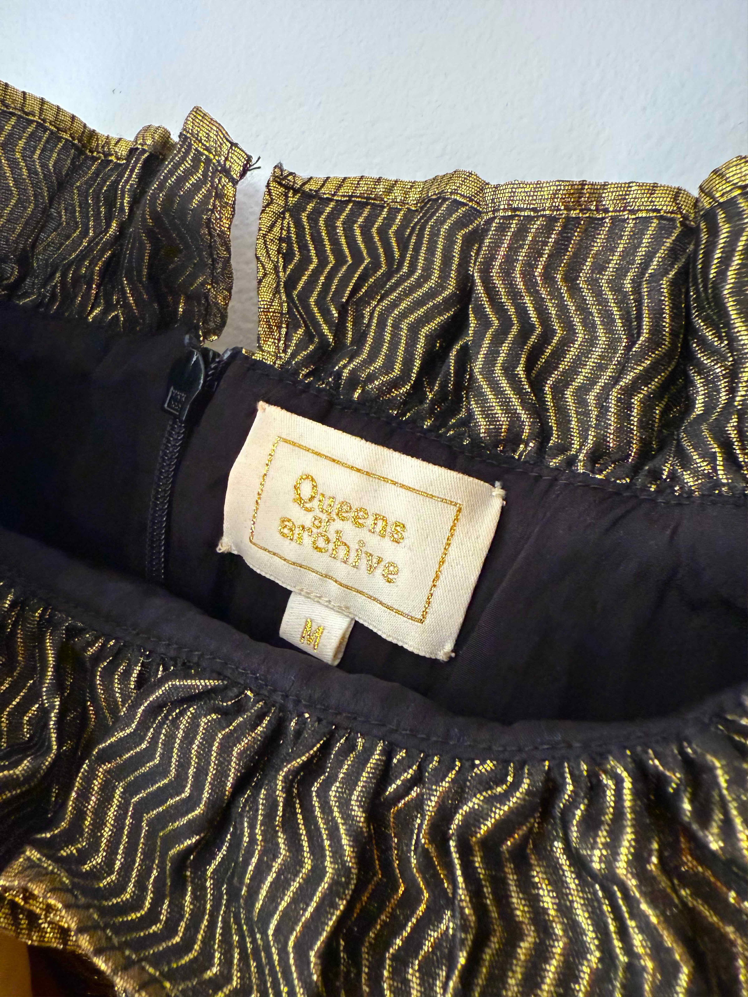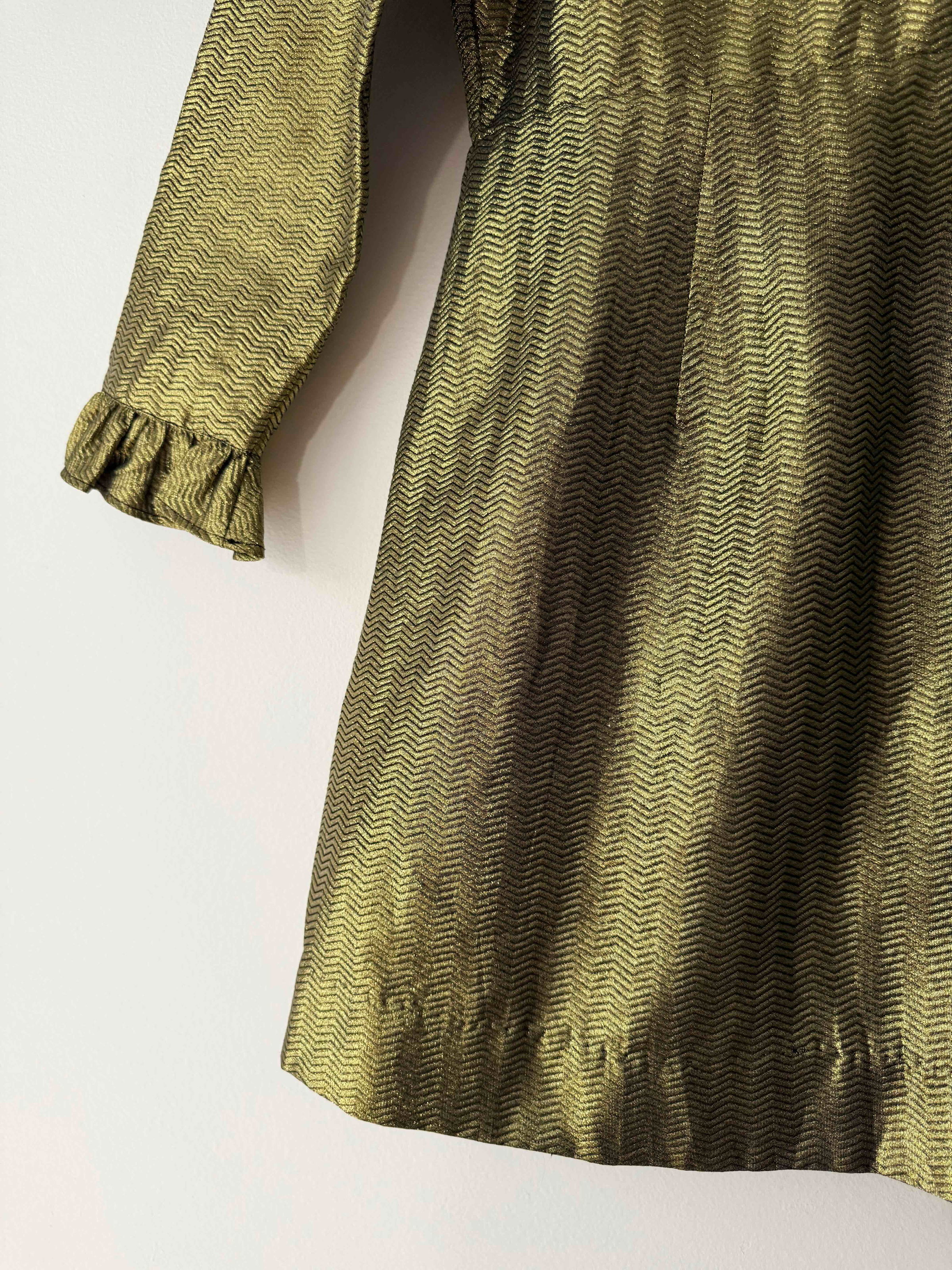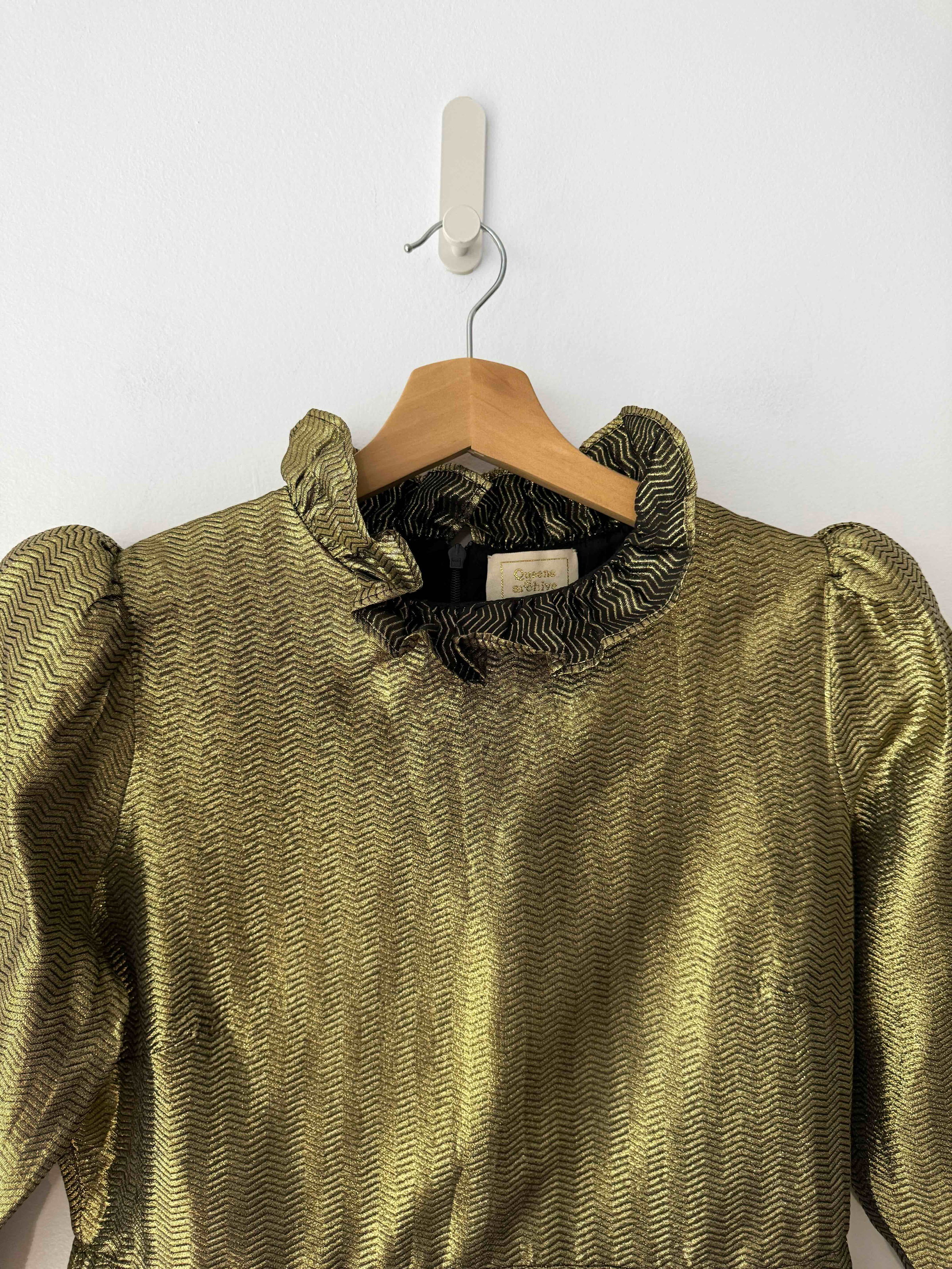 Metallic gold ruffle neck mini dress in excellent, pre-loved condition with balloon sleeves, ruffled cuffs and puff shoulders. Fully lined. Composition: 50% polyester, 50% metallic yarn. Lining: 100% viscose.