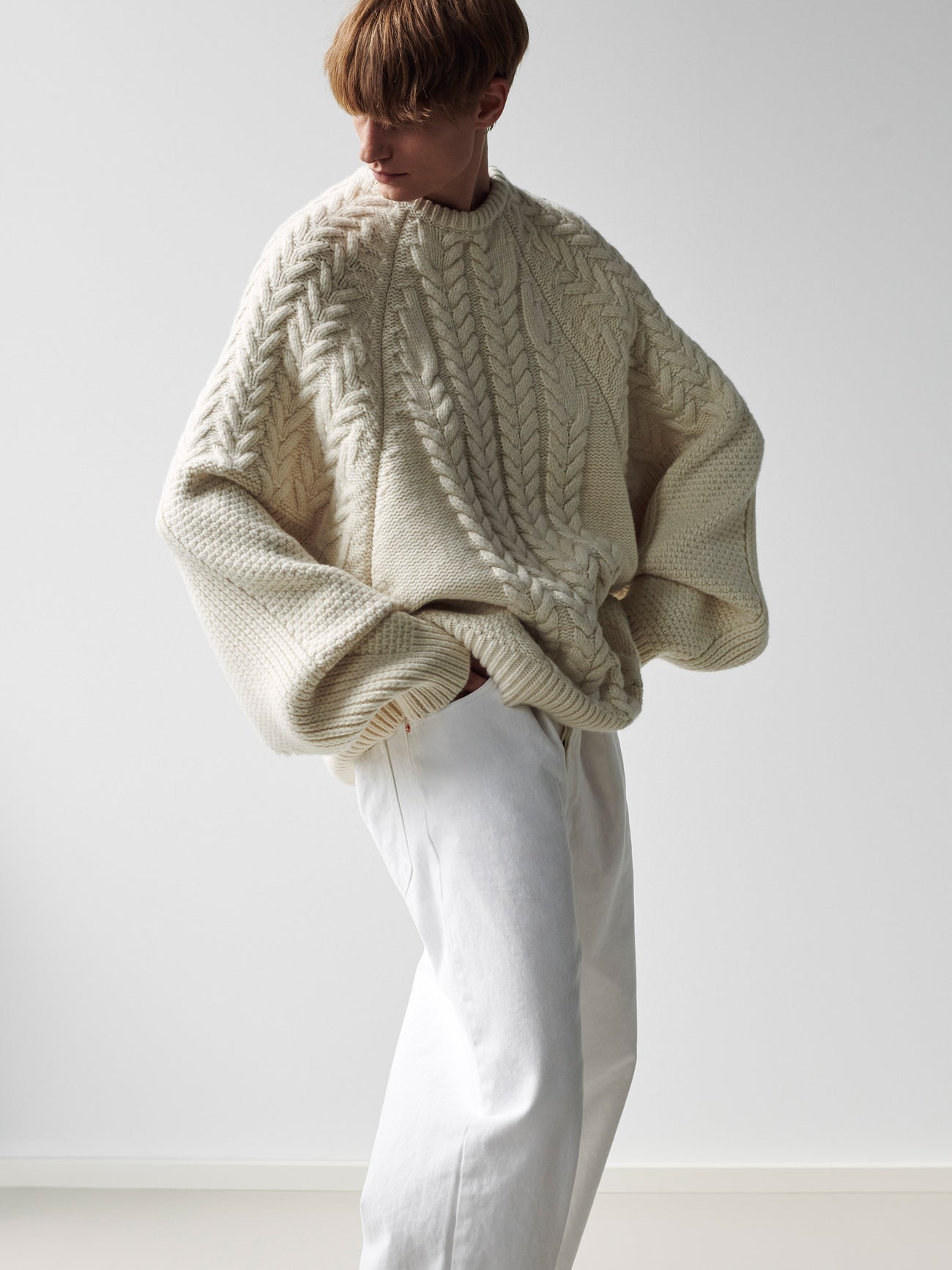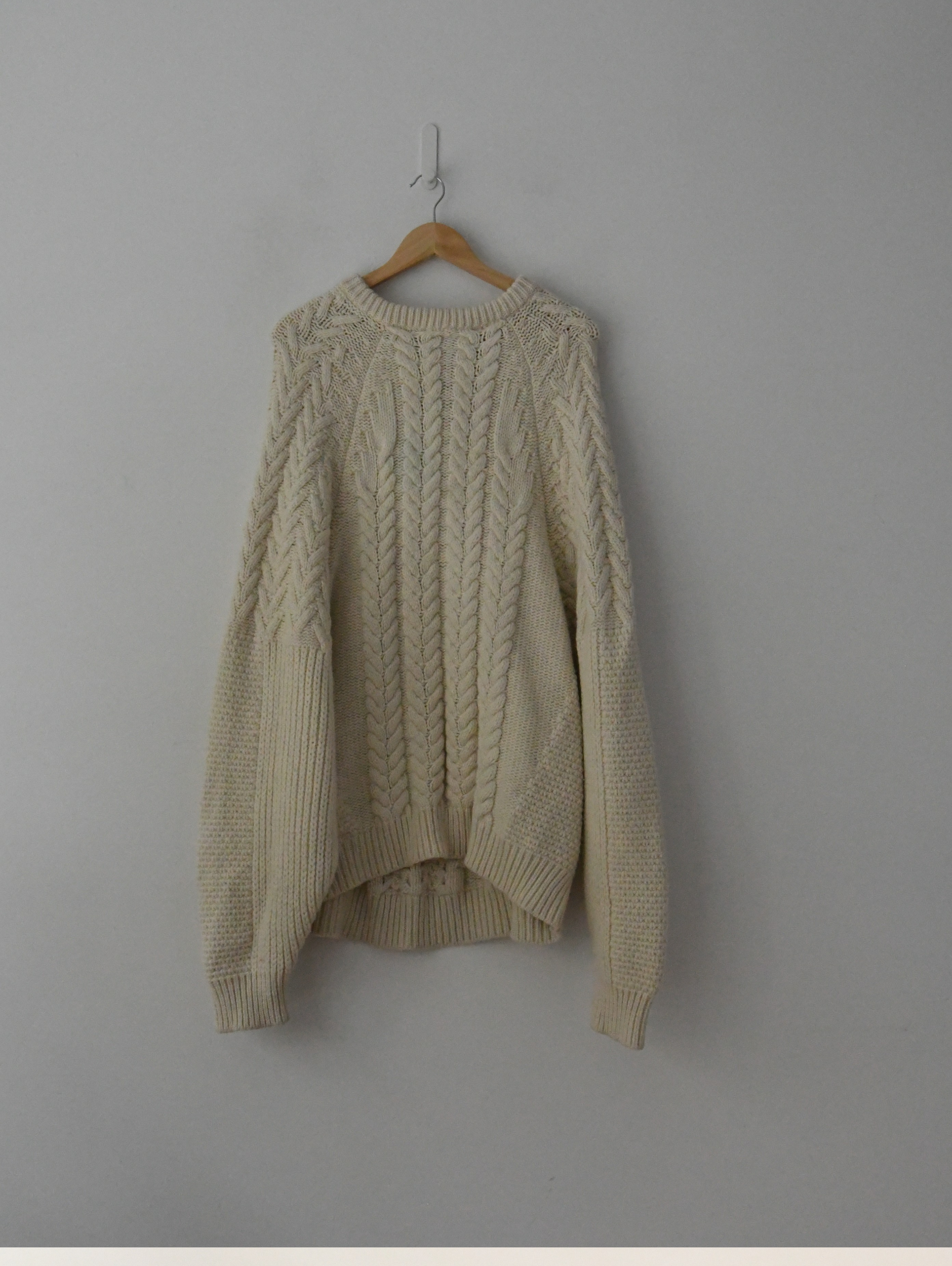 Oversized crew neck, cable knit wool jumper. Dry Clean Only.