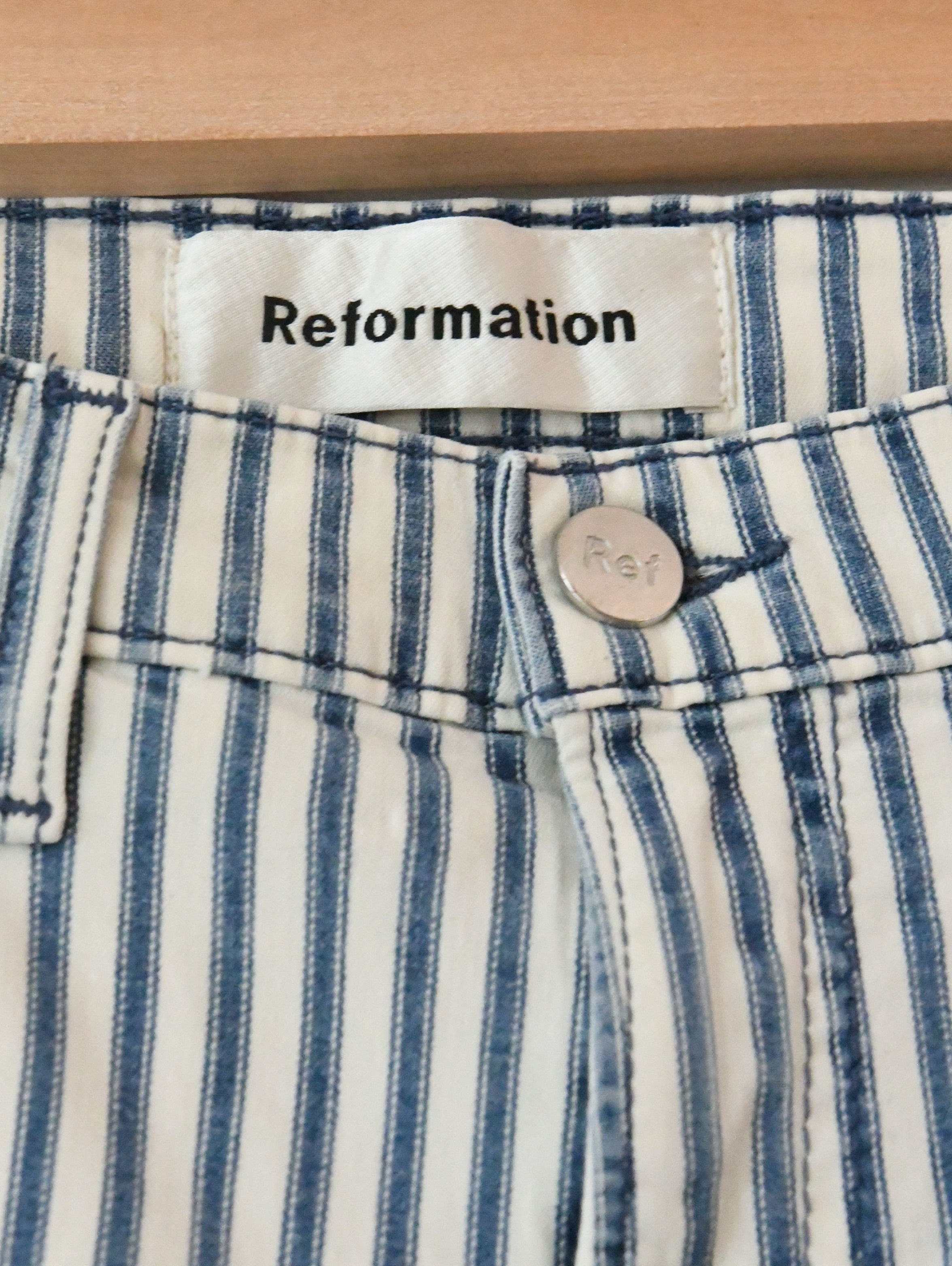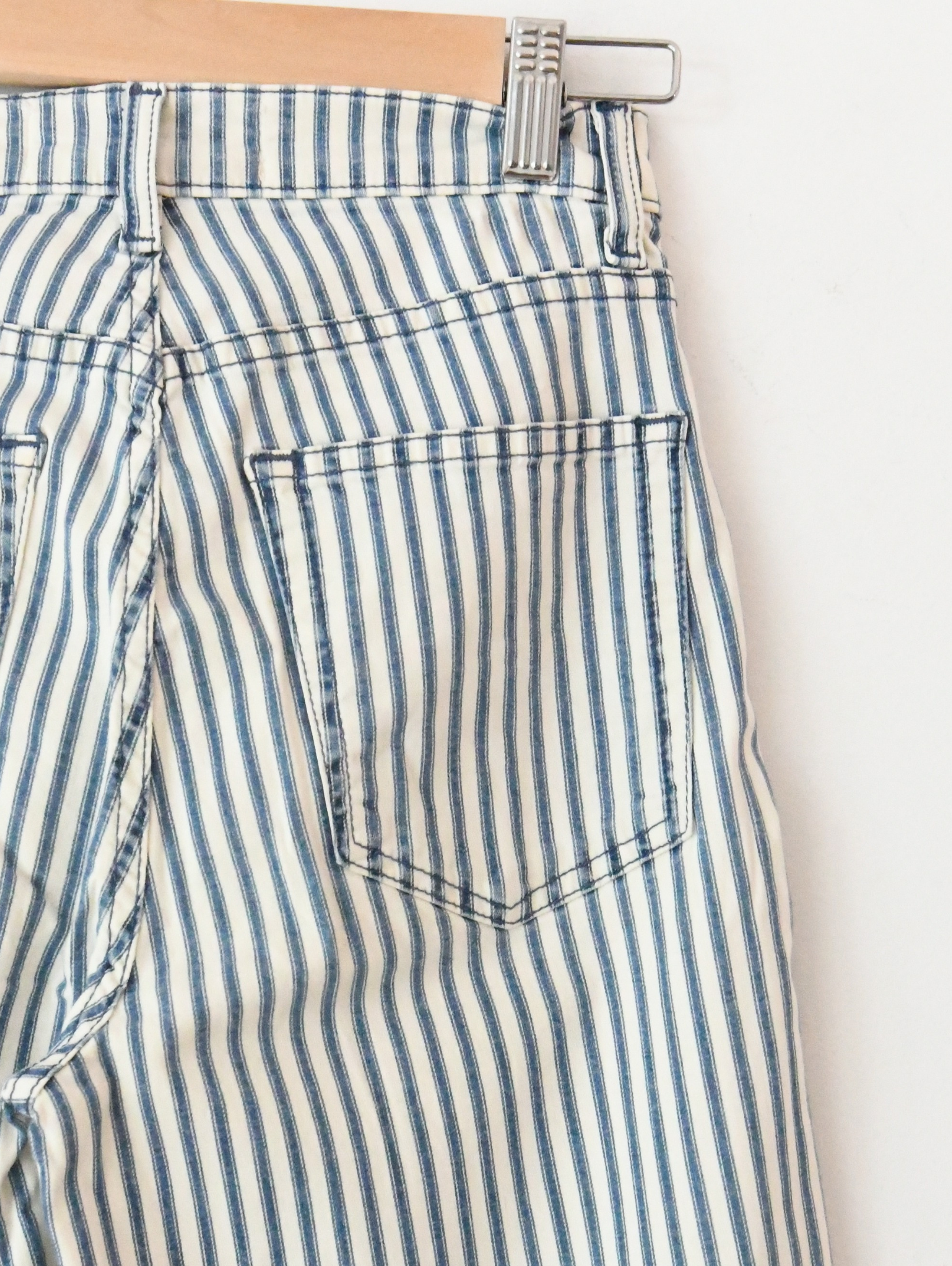 Stretch Flood Wide Leg Jeans in Fiji Stripe with Zipper fly and Unfinished hem. Fitted through hip with wide ankle.