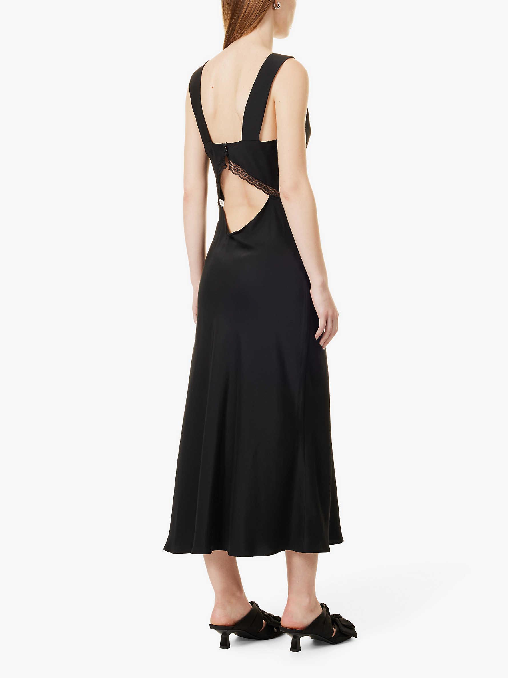 Exposed button fastening at back. Regular fit, V neck, shoulder straps, lace embroidery at front and back, cut-out at back, all over satin texture.
