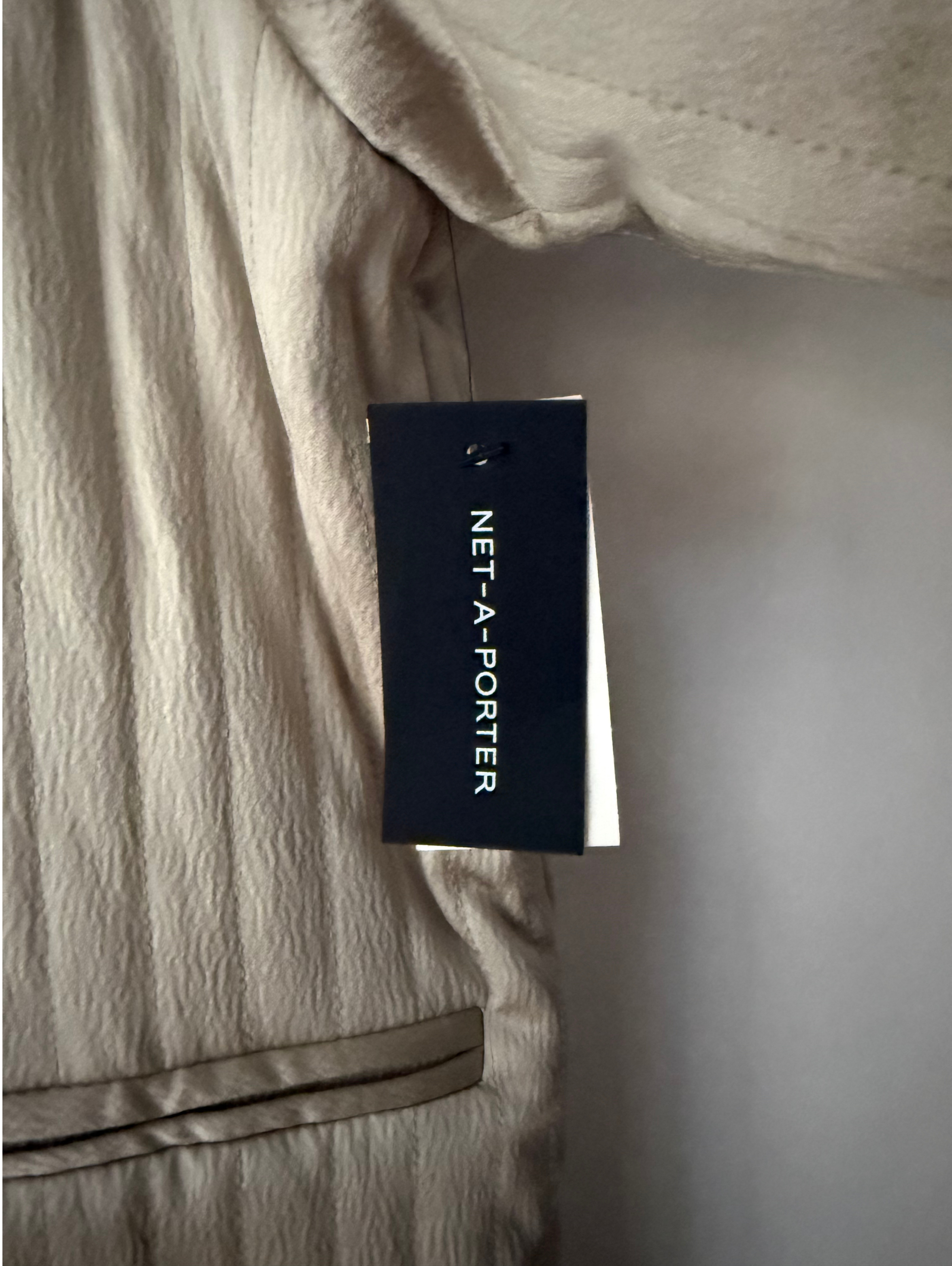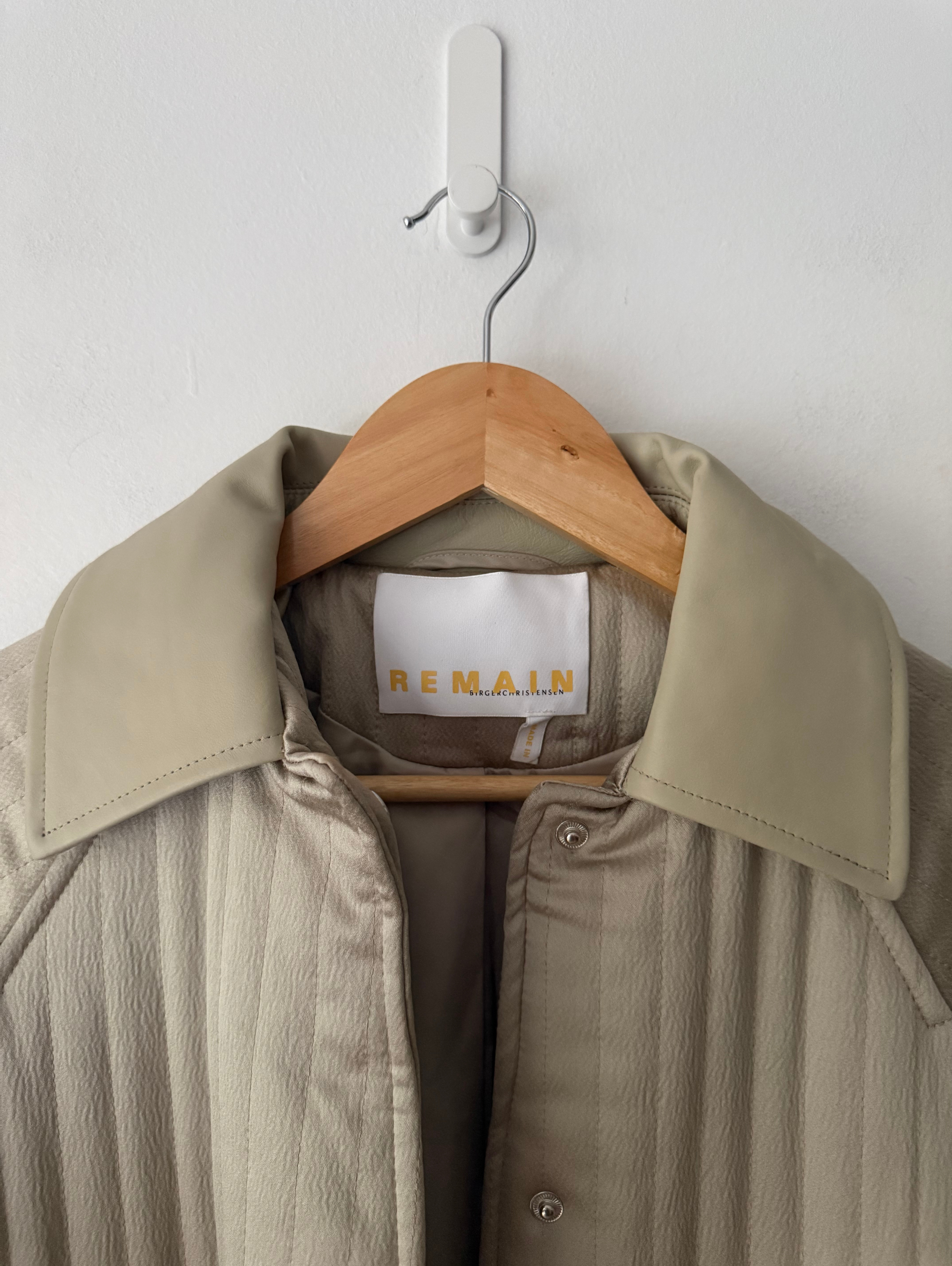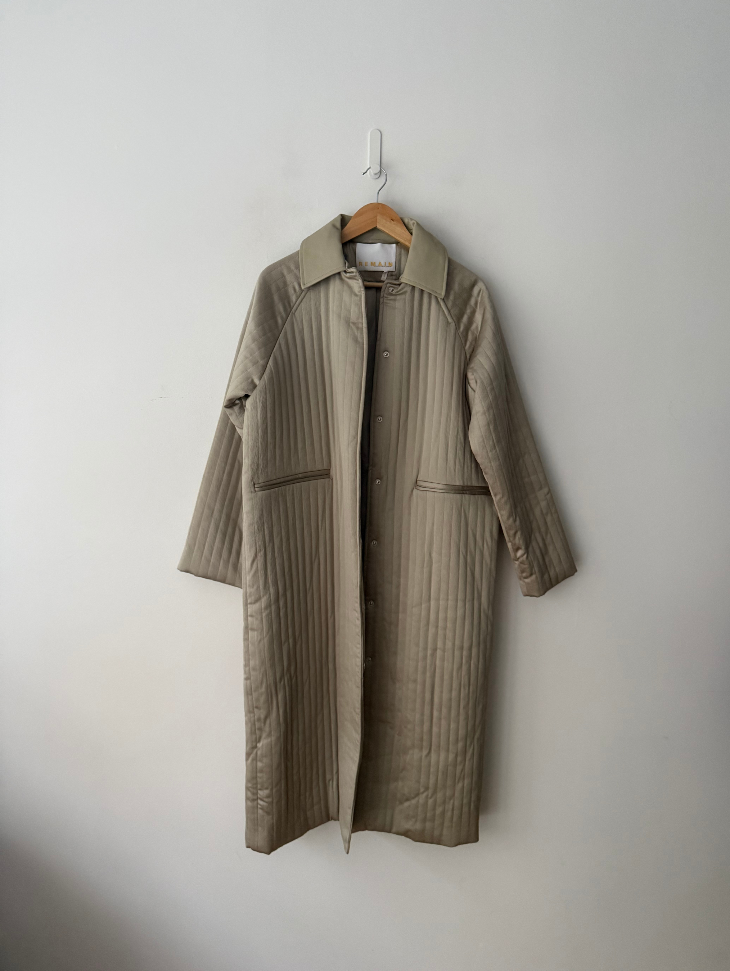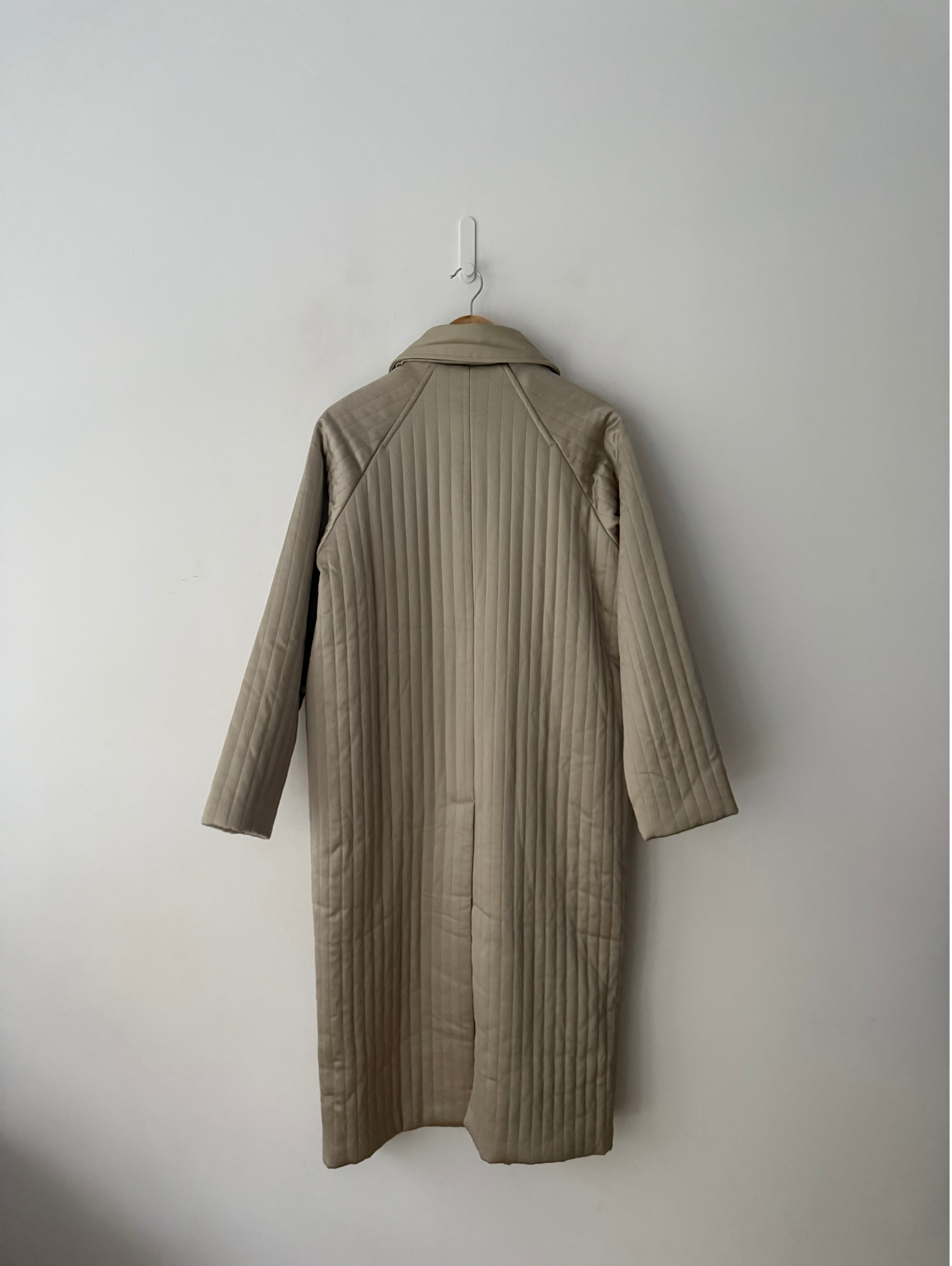 Kyoto Quilted Satin-crepe Coat. Satin-crepe Quilted Crinkled Faux leather trims Two front welt pockets. Concealed snap fastenings through front Back vent. Fully lined. Non-stretchy fabric Mid-weight fabric. Dry clean Only.