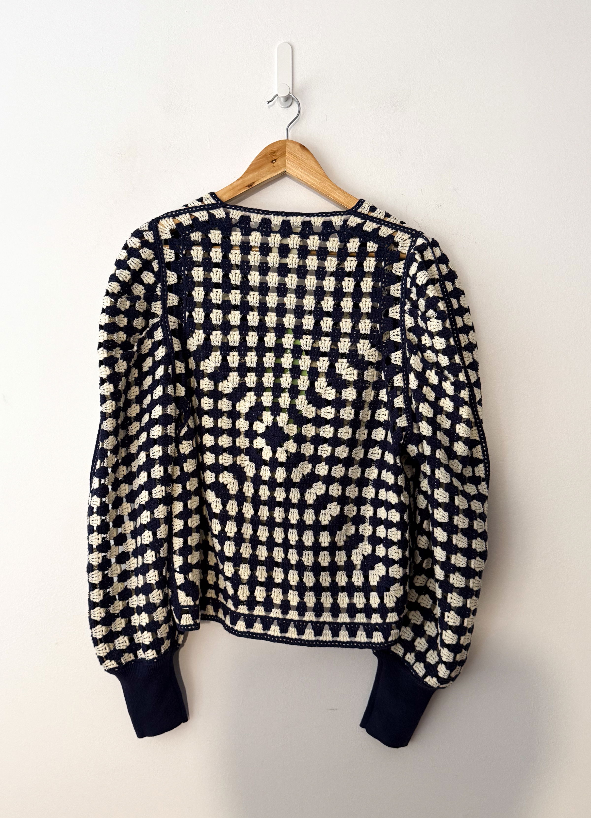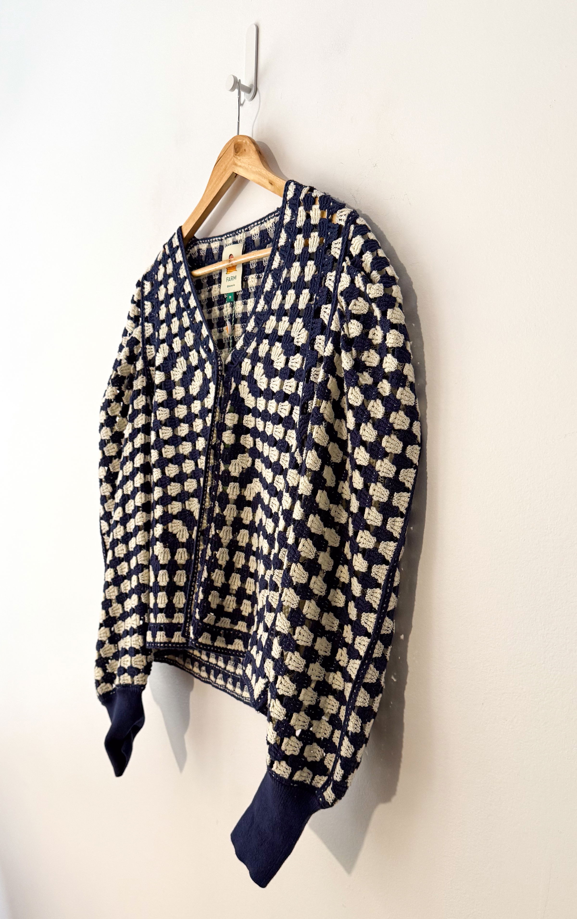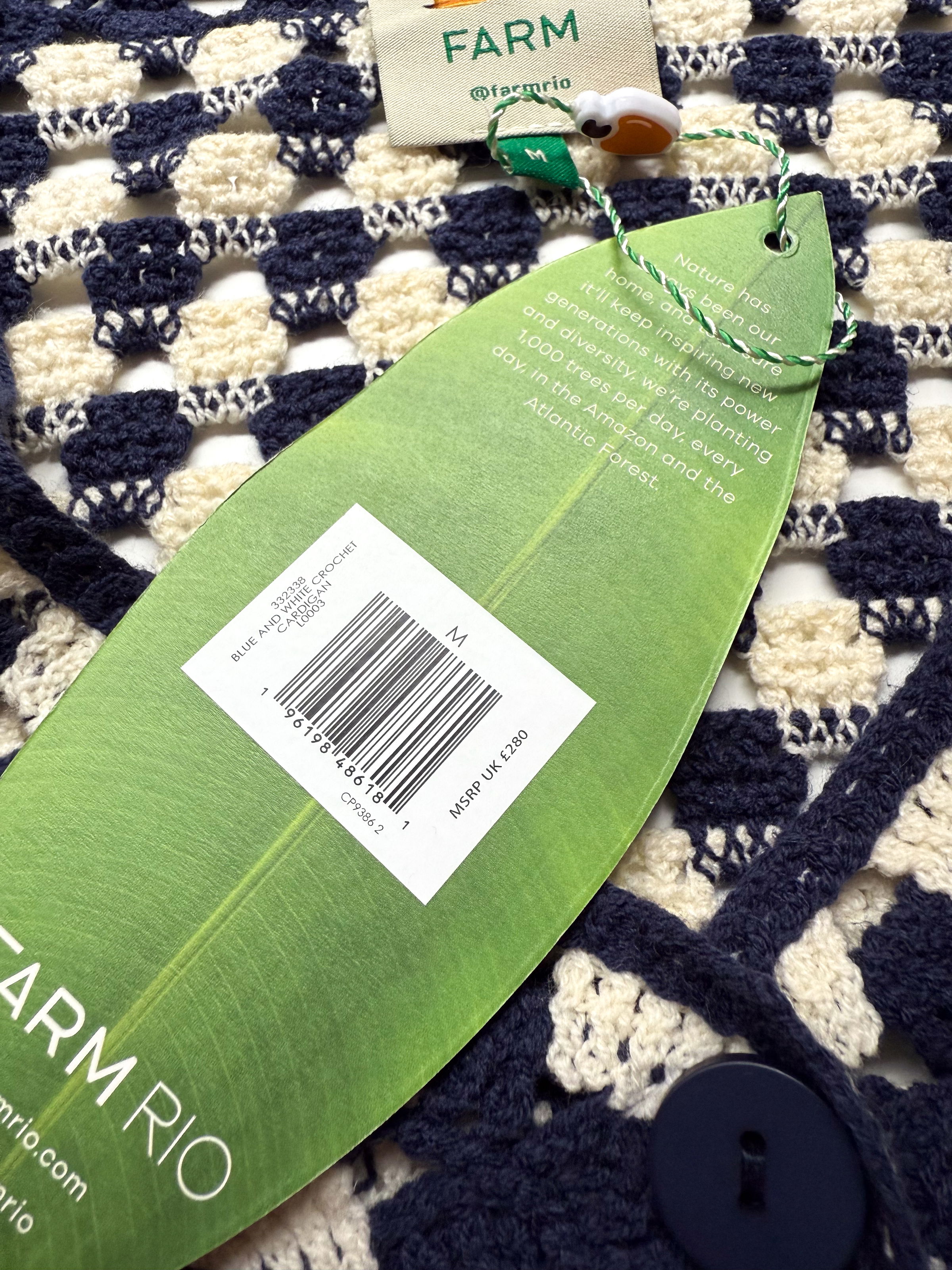 Embrace the vibrant spirit of Brazil with the Blue & White Crochet Cardigan from FARM Rio. This exquisite piece features intricate embroidery that artfully dances across its surface, creating a stunning visual contrast against the calming blue and white crochet pattern.