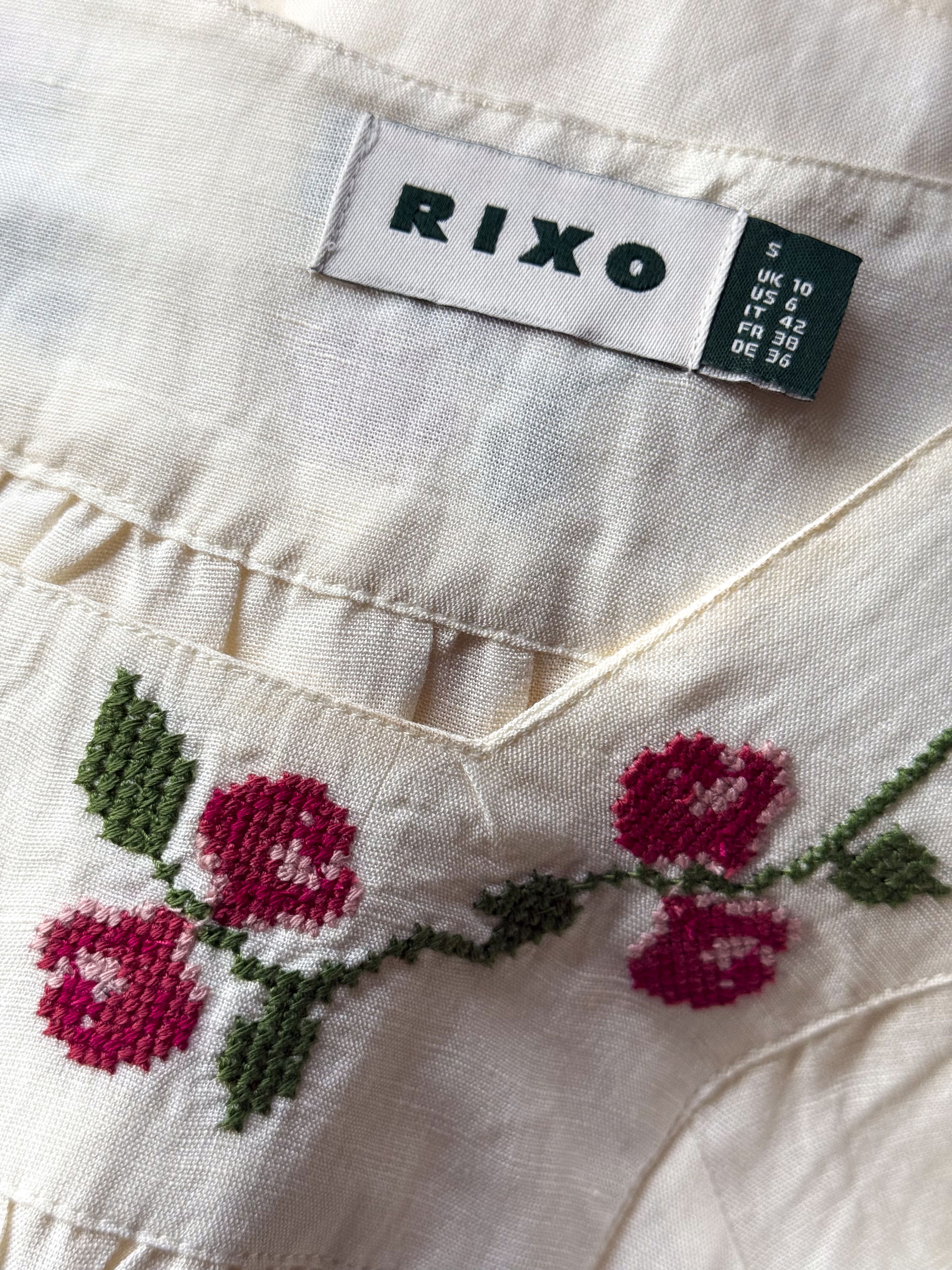 Meet our beautiful Neila dress in ivory from RIXO's exclusive collaboration with Billie Bhatia. Made from linen-blend, its intricate floral embroidery and airy 1970s inspired shape is both charming and perfect for every day.