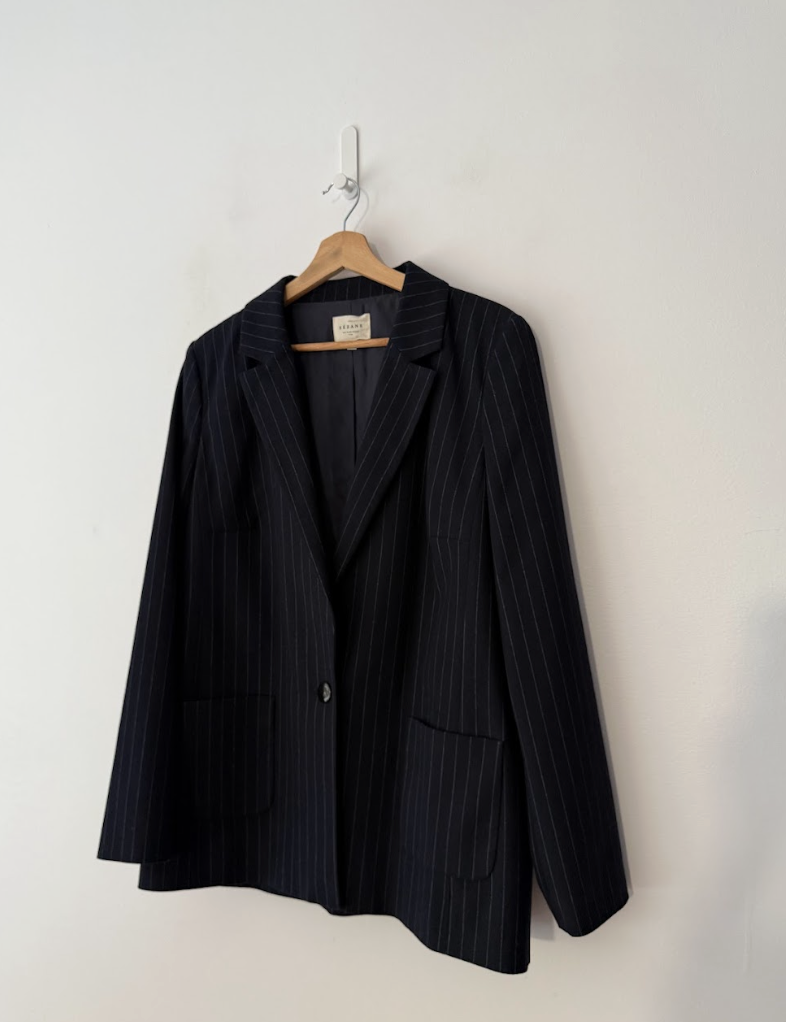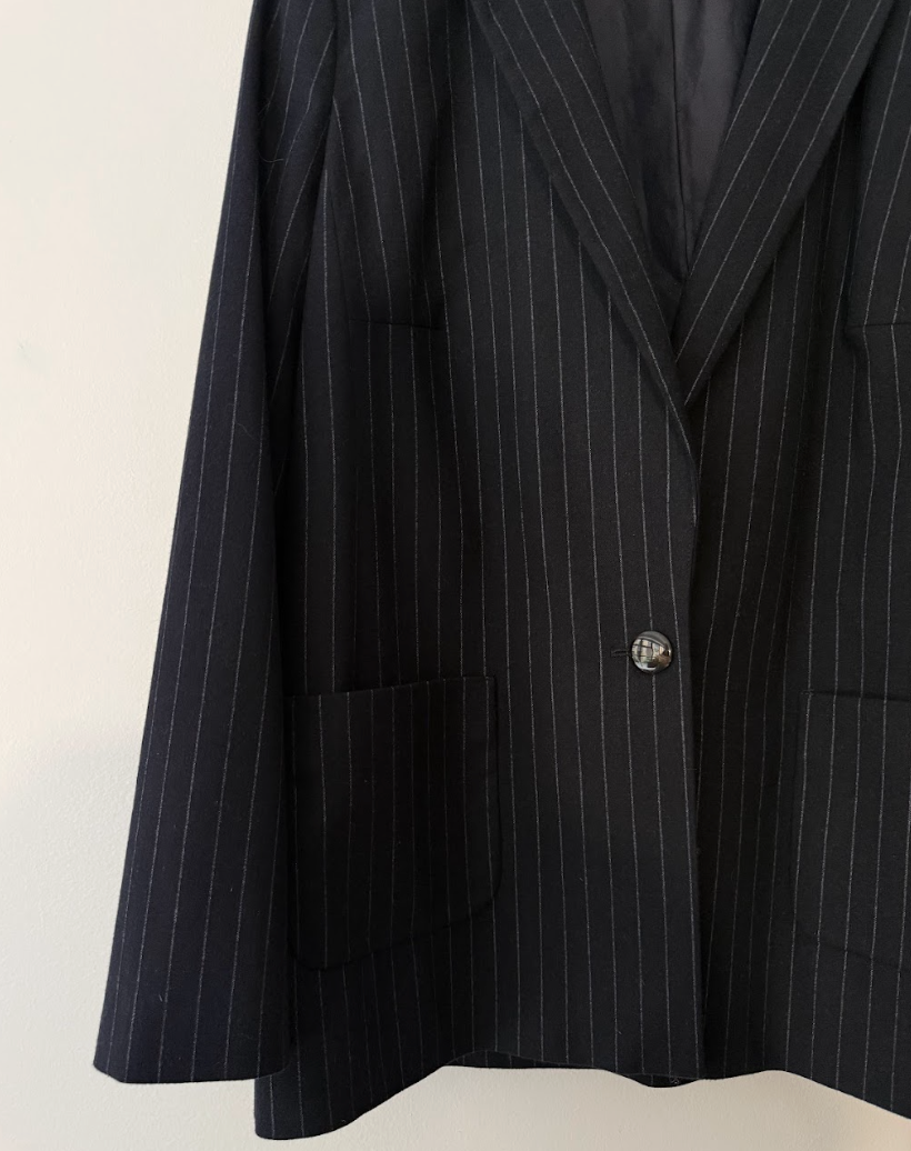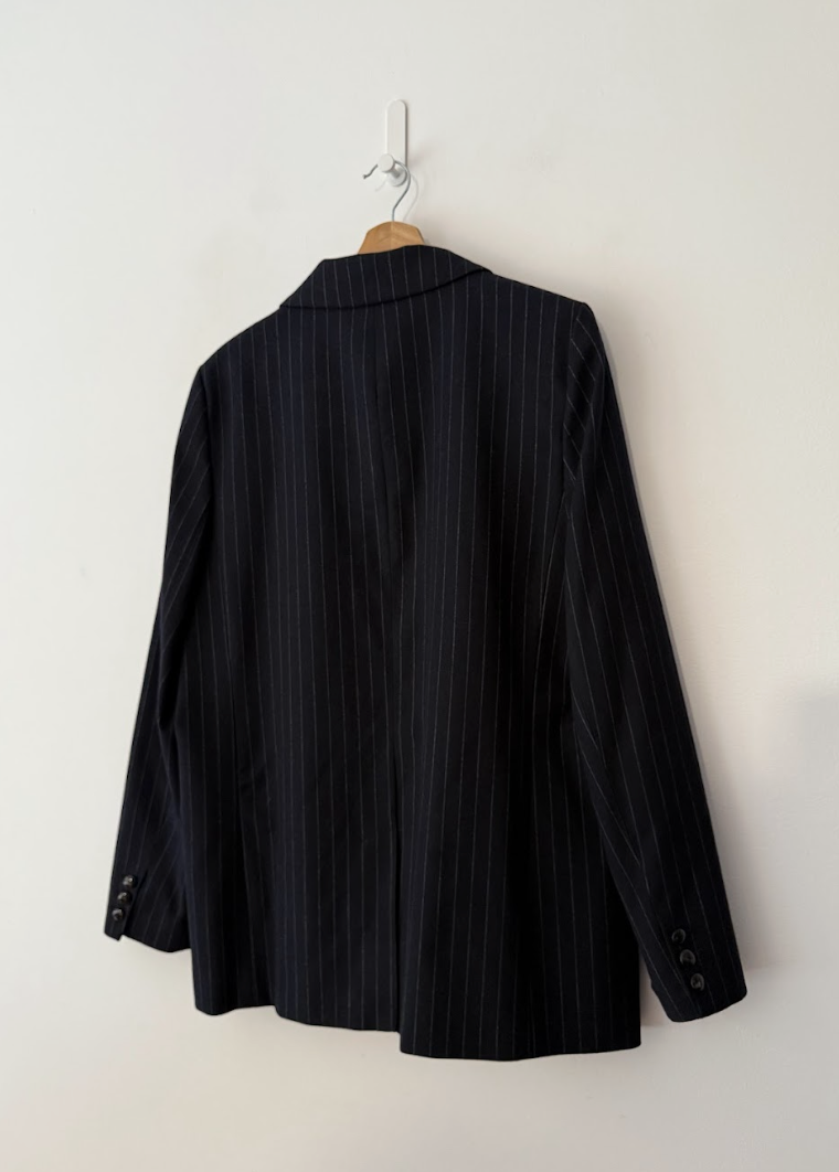 Black single-breasted pinstripe blazer in perfect, never worn condition with two front patch pockets and middle front button fastening. Composition: 69% polyester, 29% viscose, 2% elastane. Dry clean only. (See my other items for matching trousers.)