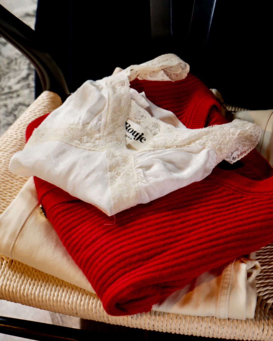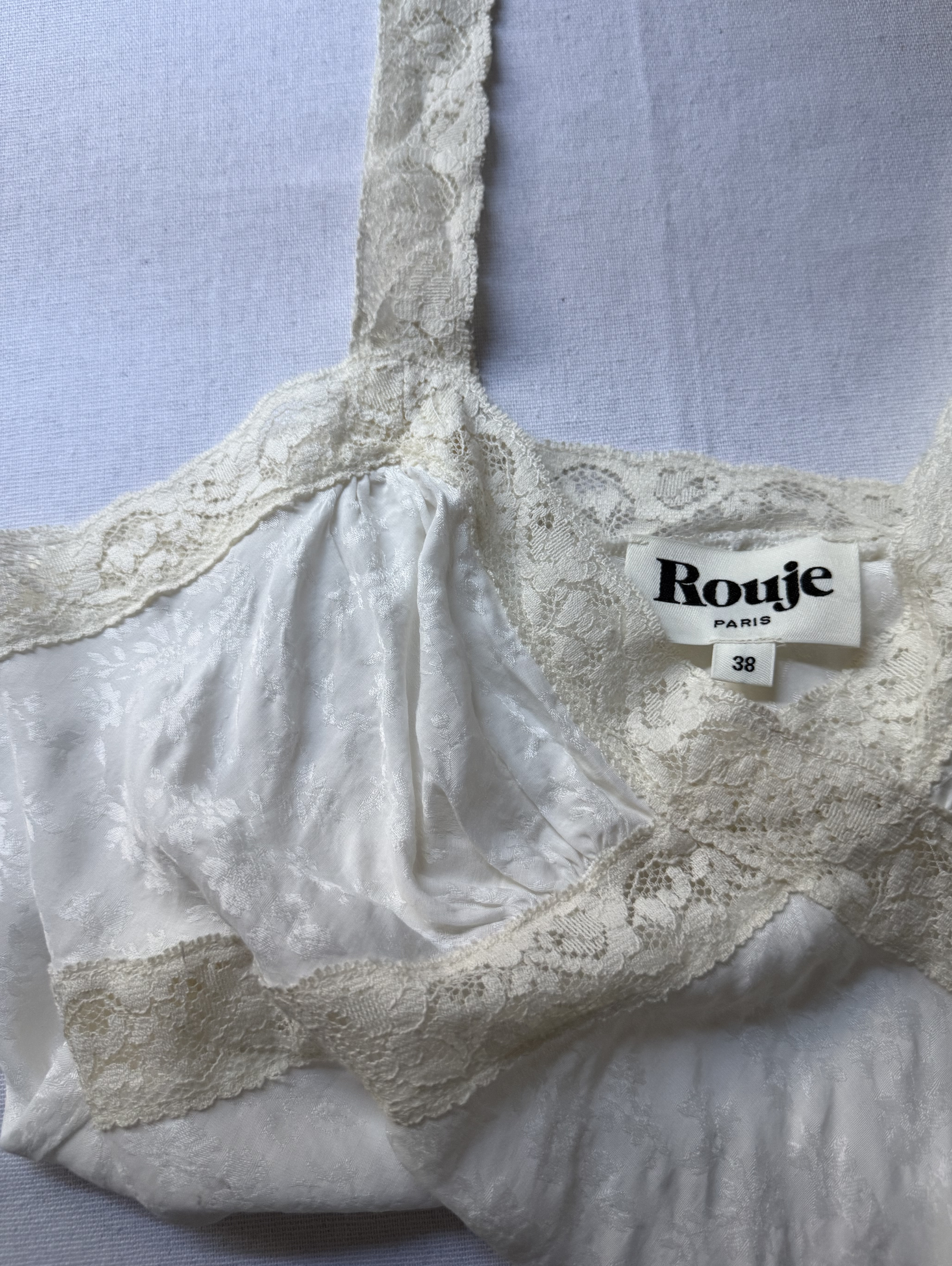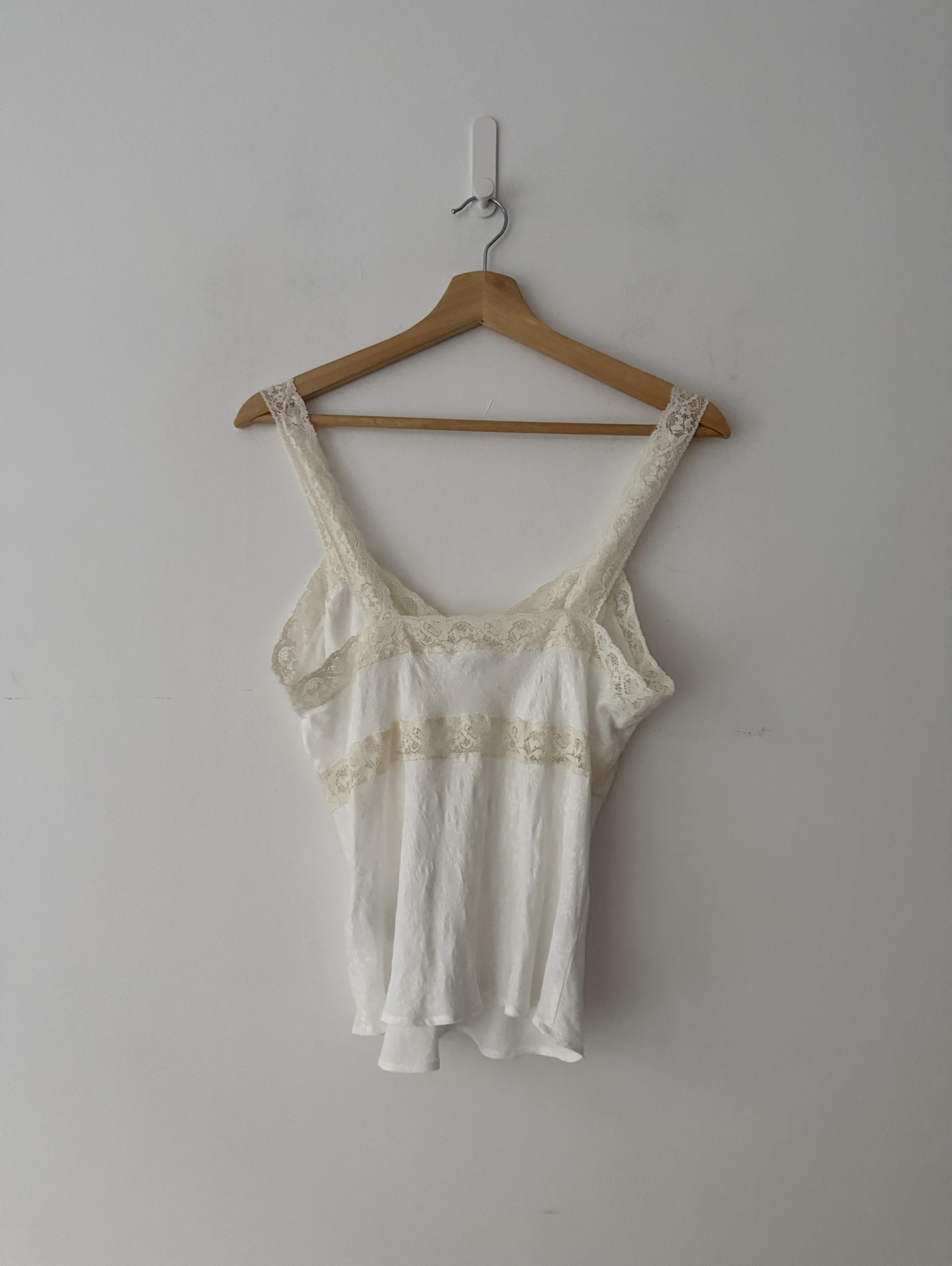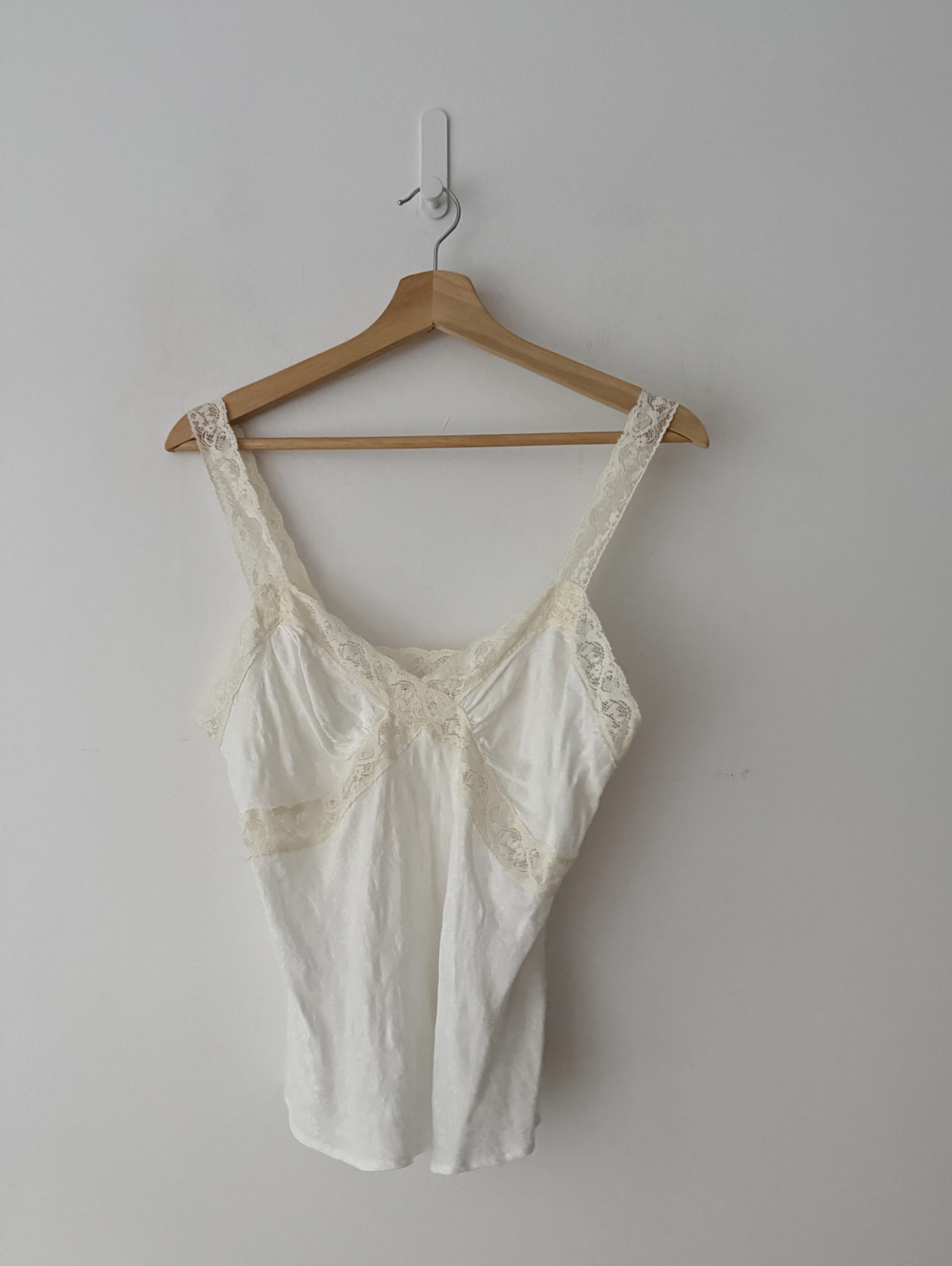 Lace detail vest cut on the bias. 70% cotton 30% Polyamide.