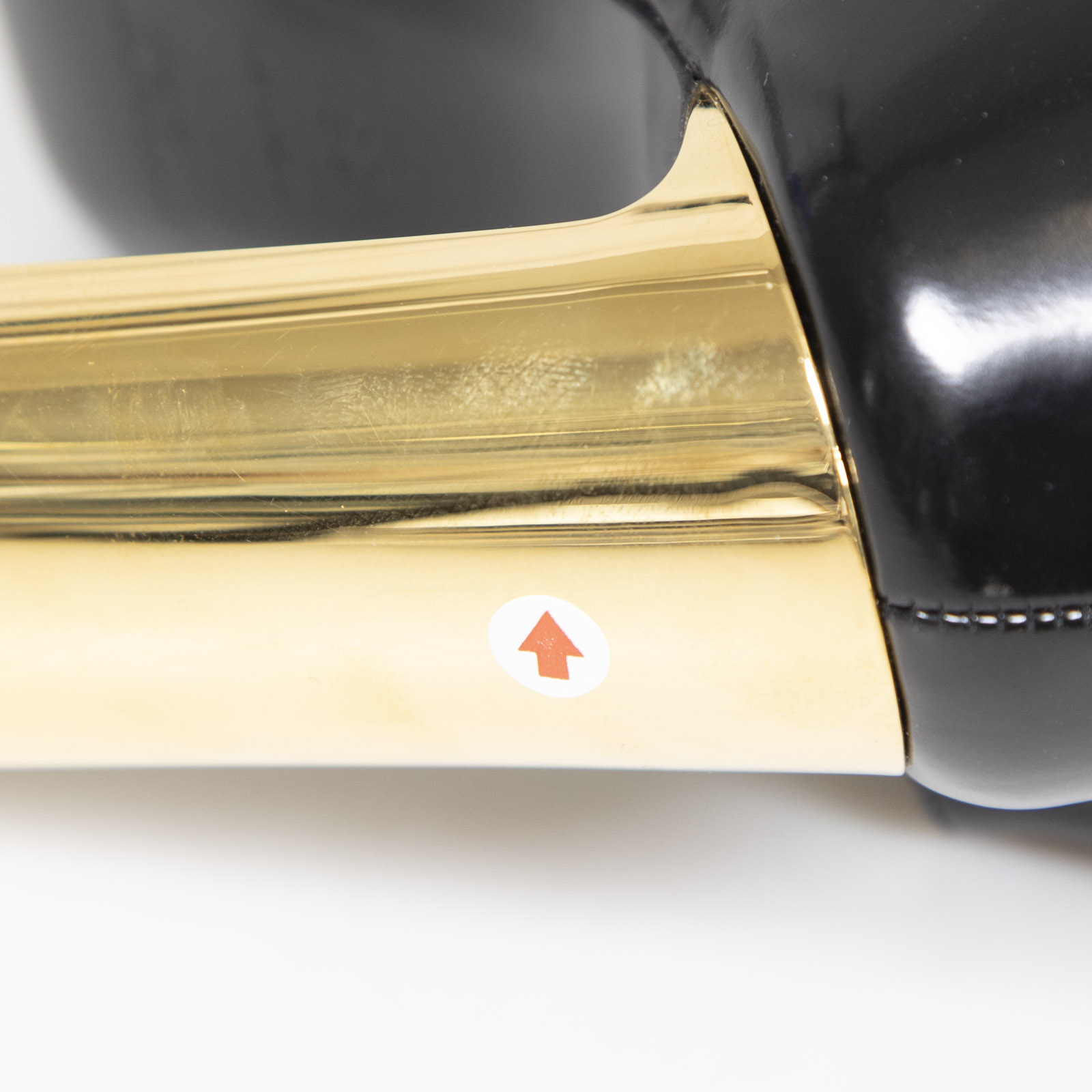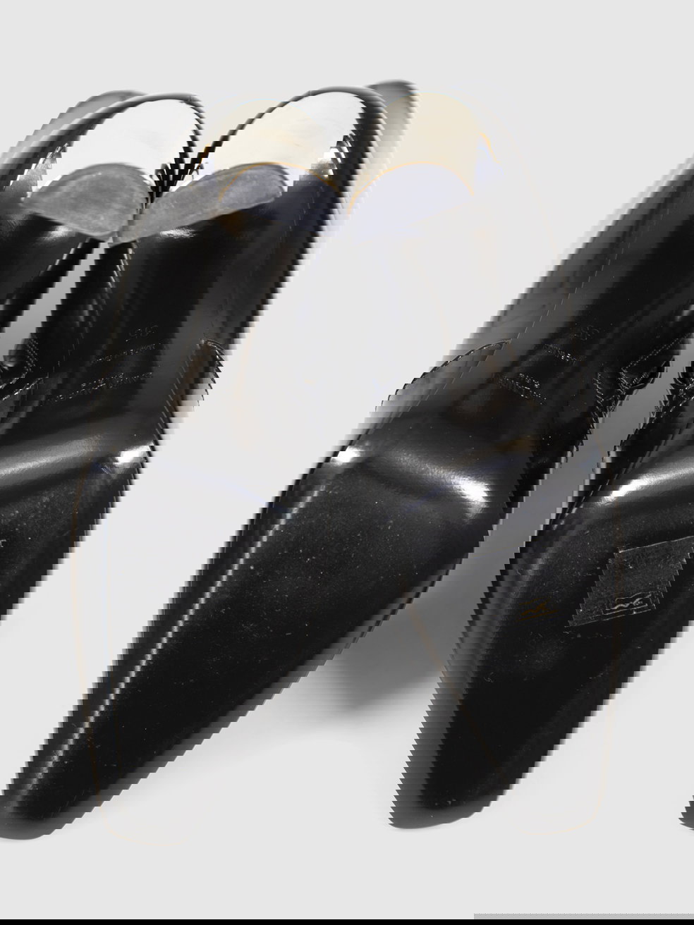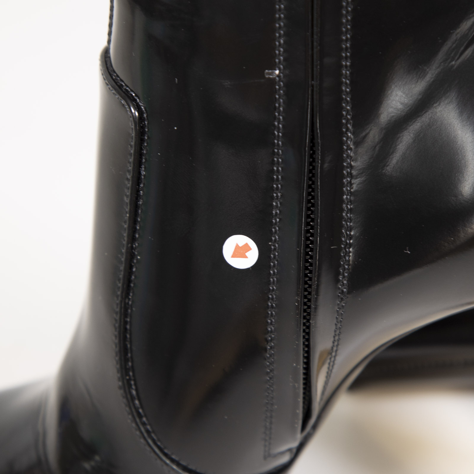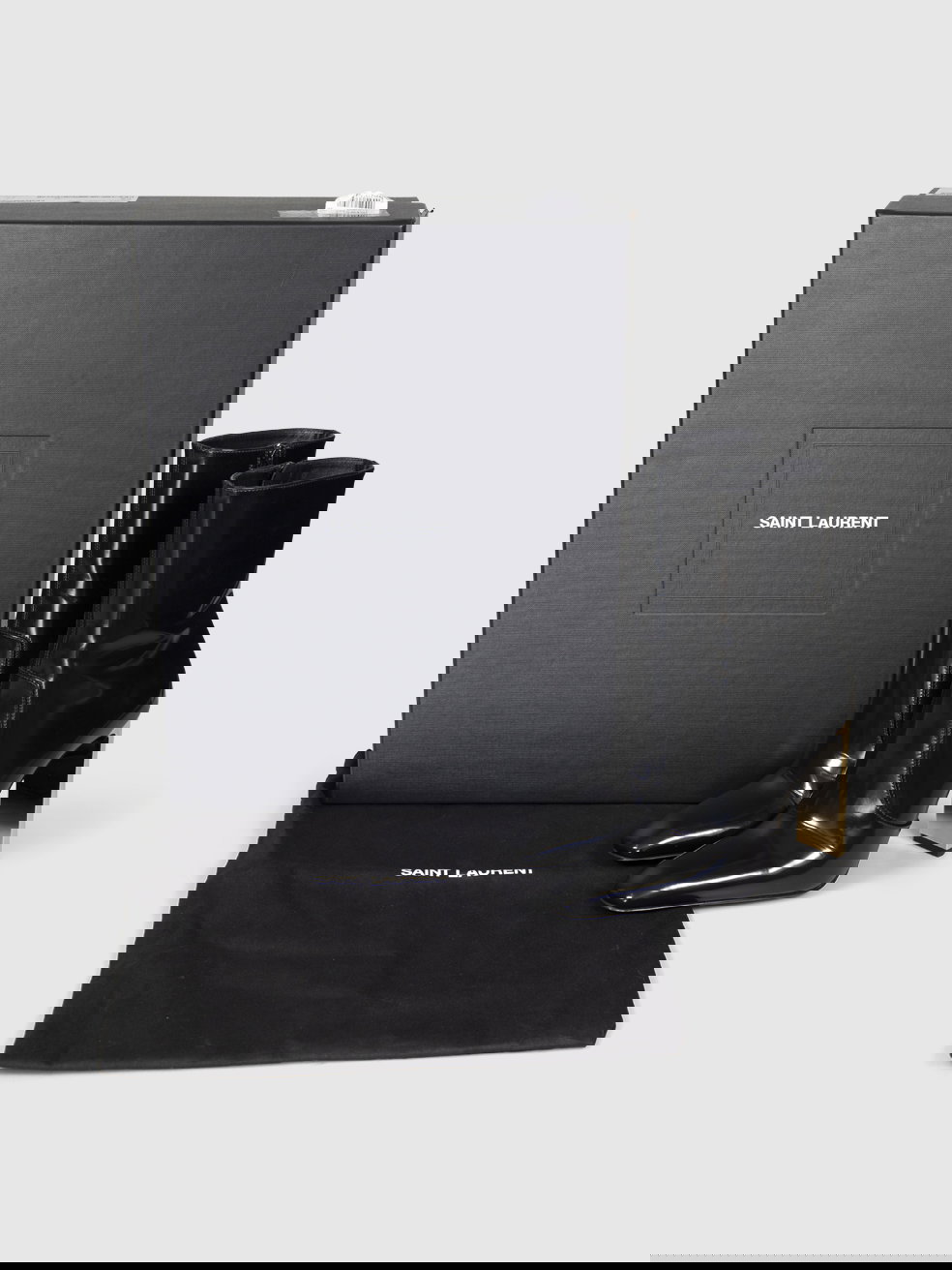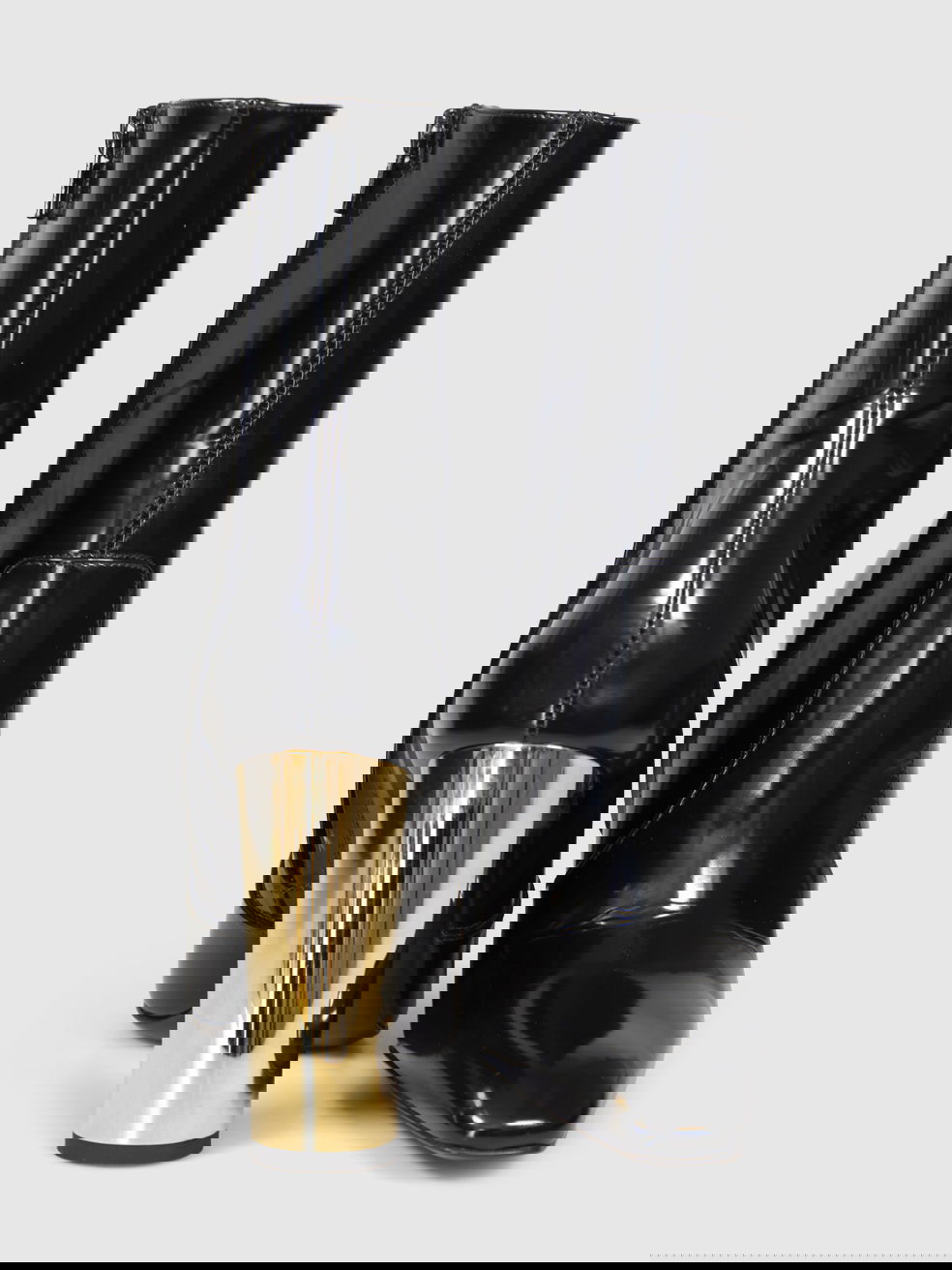Black patent leather gold-heeled leather boots in excellent, pre-worn condition. See images for signs of wear. Comes with original dust bags and box. Side zip closure, square toe. Composition: outer: calfskin 100%, sole: leather 100%, lining: 100%.