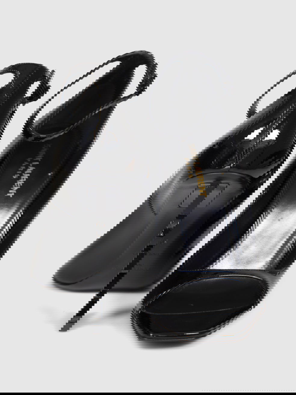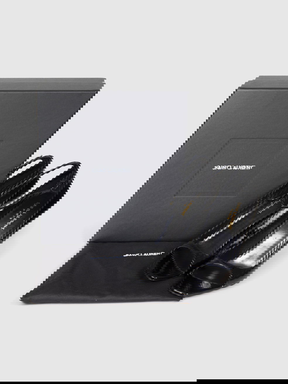 Black high-heeled sandals with YSL logo in excellent condition. Never worn, but due to poor storage, there are small abrasions on the soles - see images. Comes with box and dust bag. Composition: 100% leather. Heel height: 100mm, soles: 265mm, insoles: 260mm, width sole: 90mm.