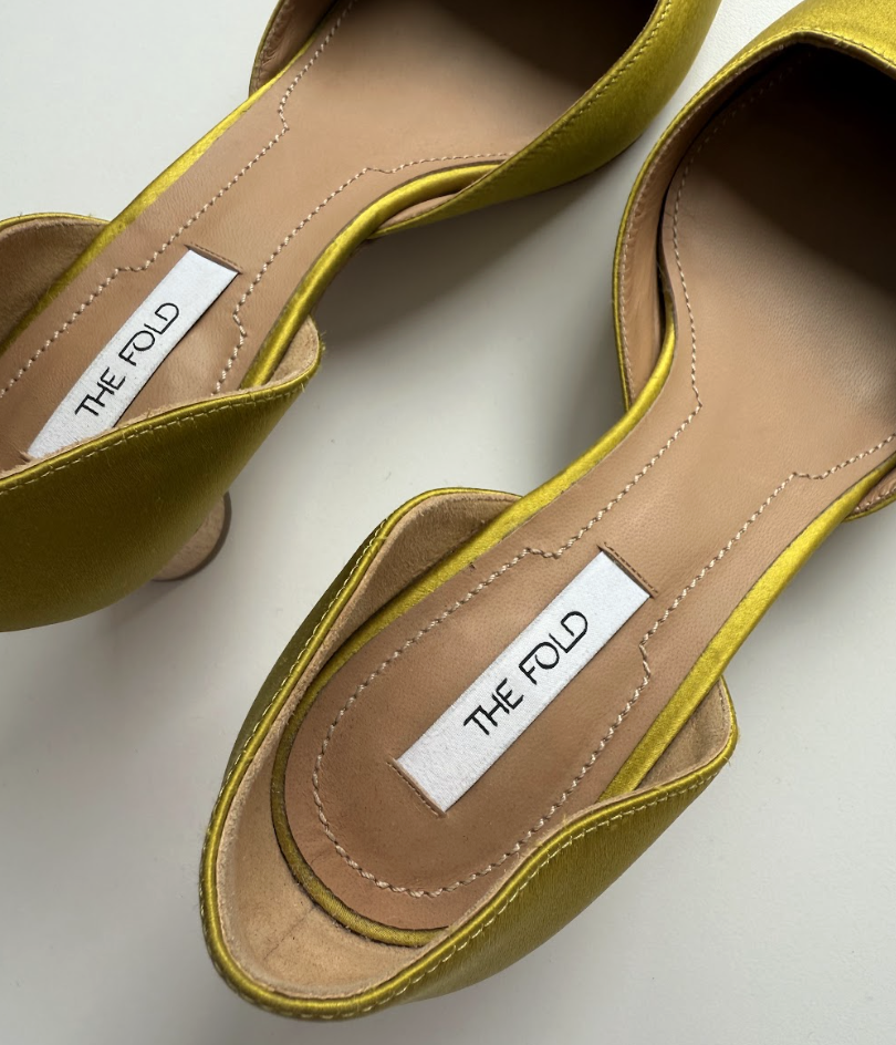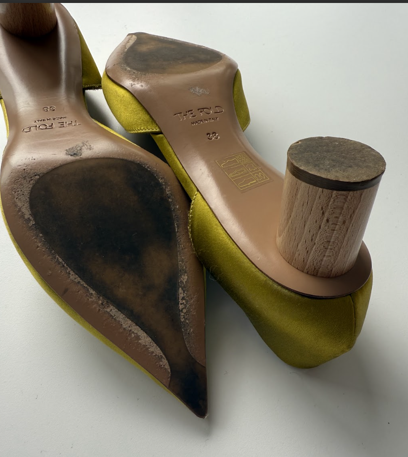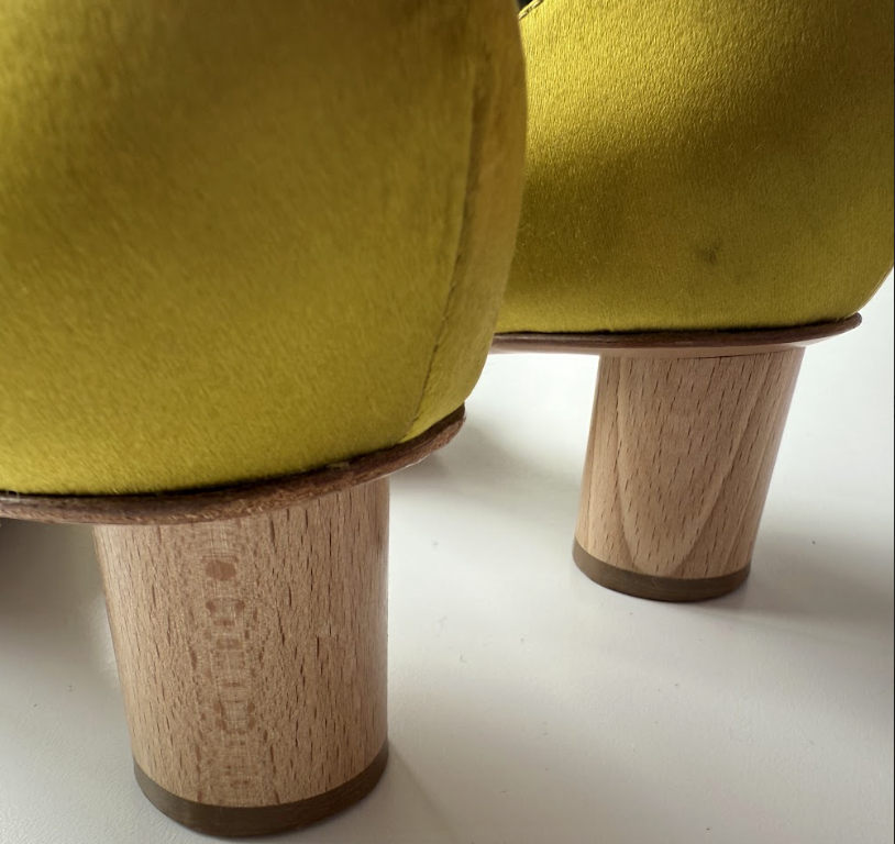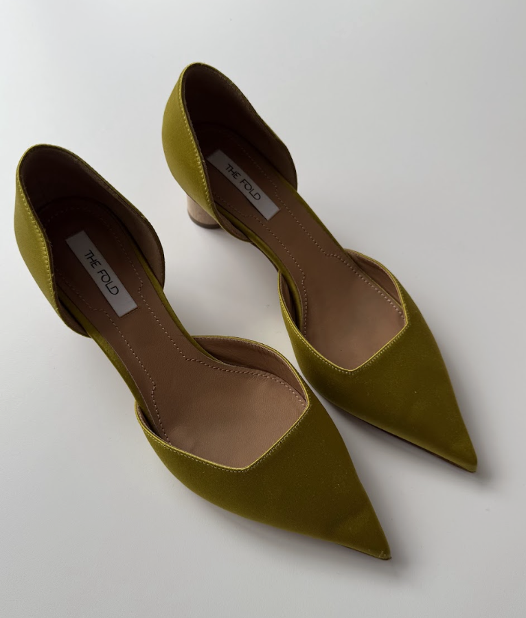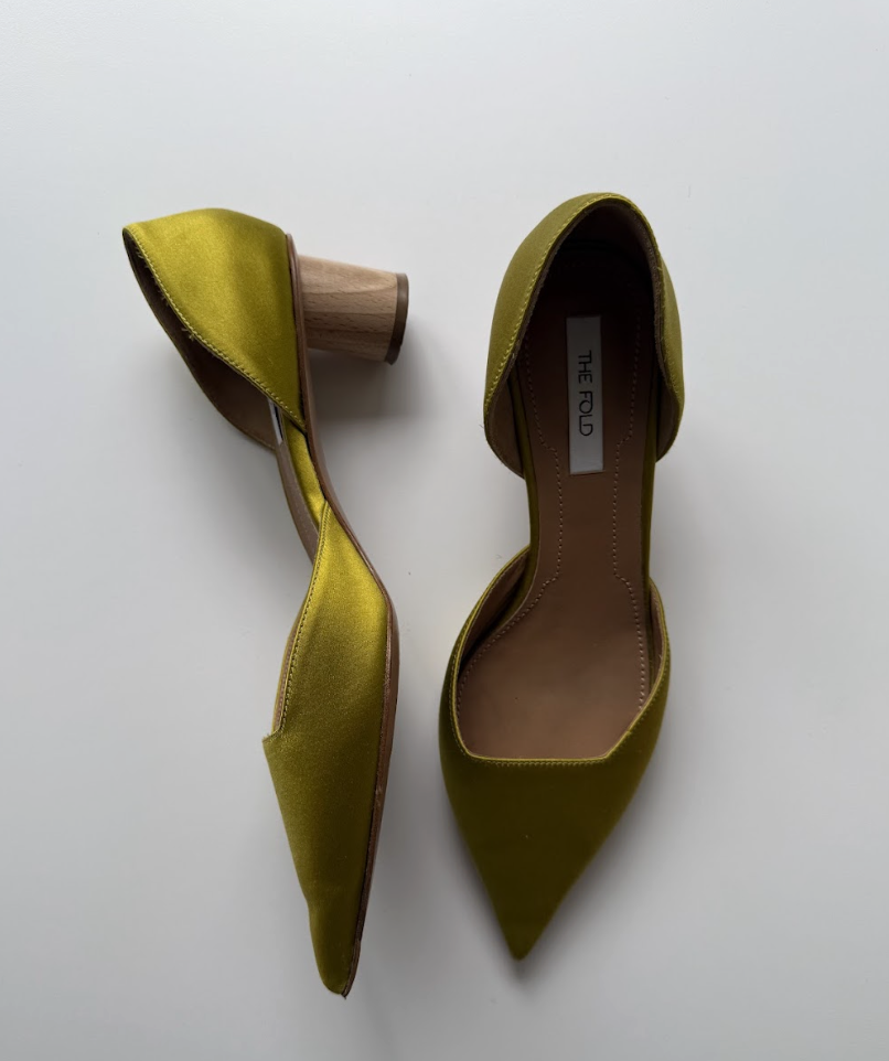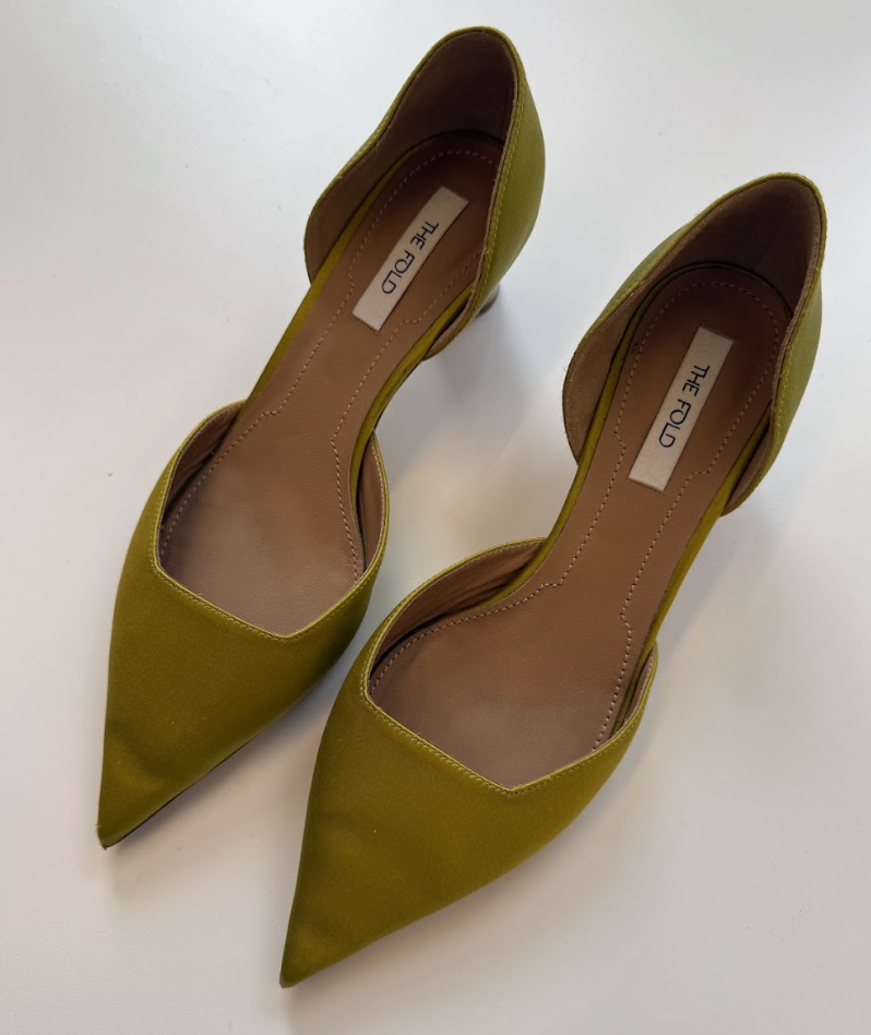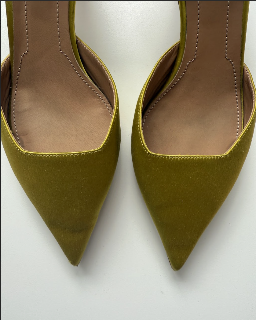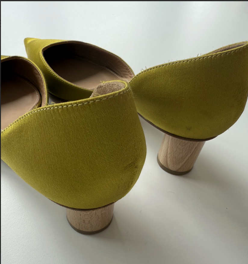 These lime green satin, pointed toe, wooden heeled pumps are in almost perfect condition and perfect when teamed with skirts and jeans. 100% satin upper.