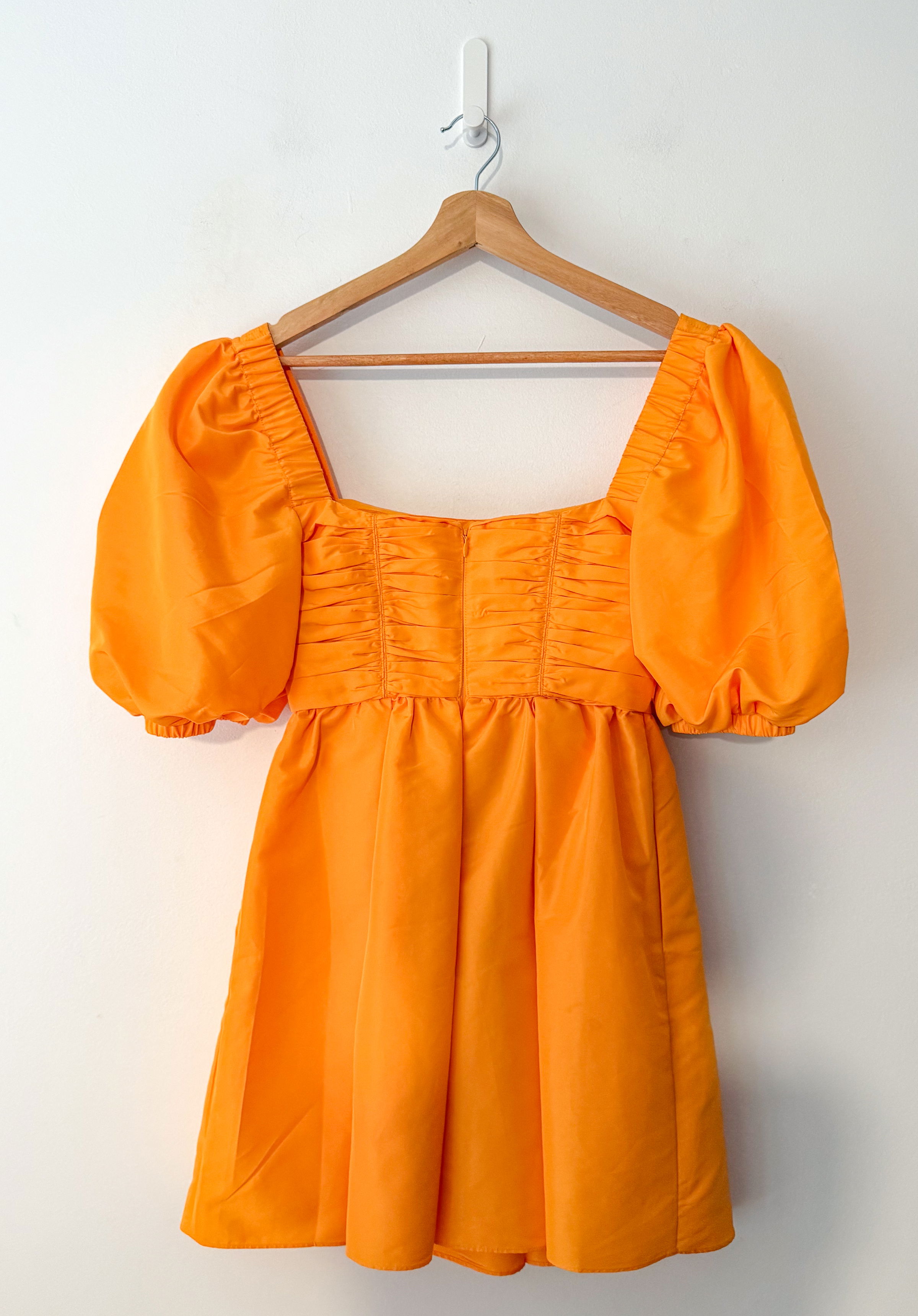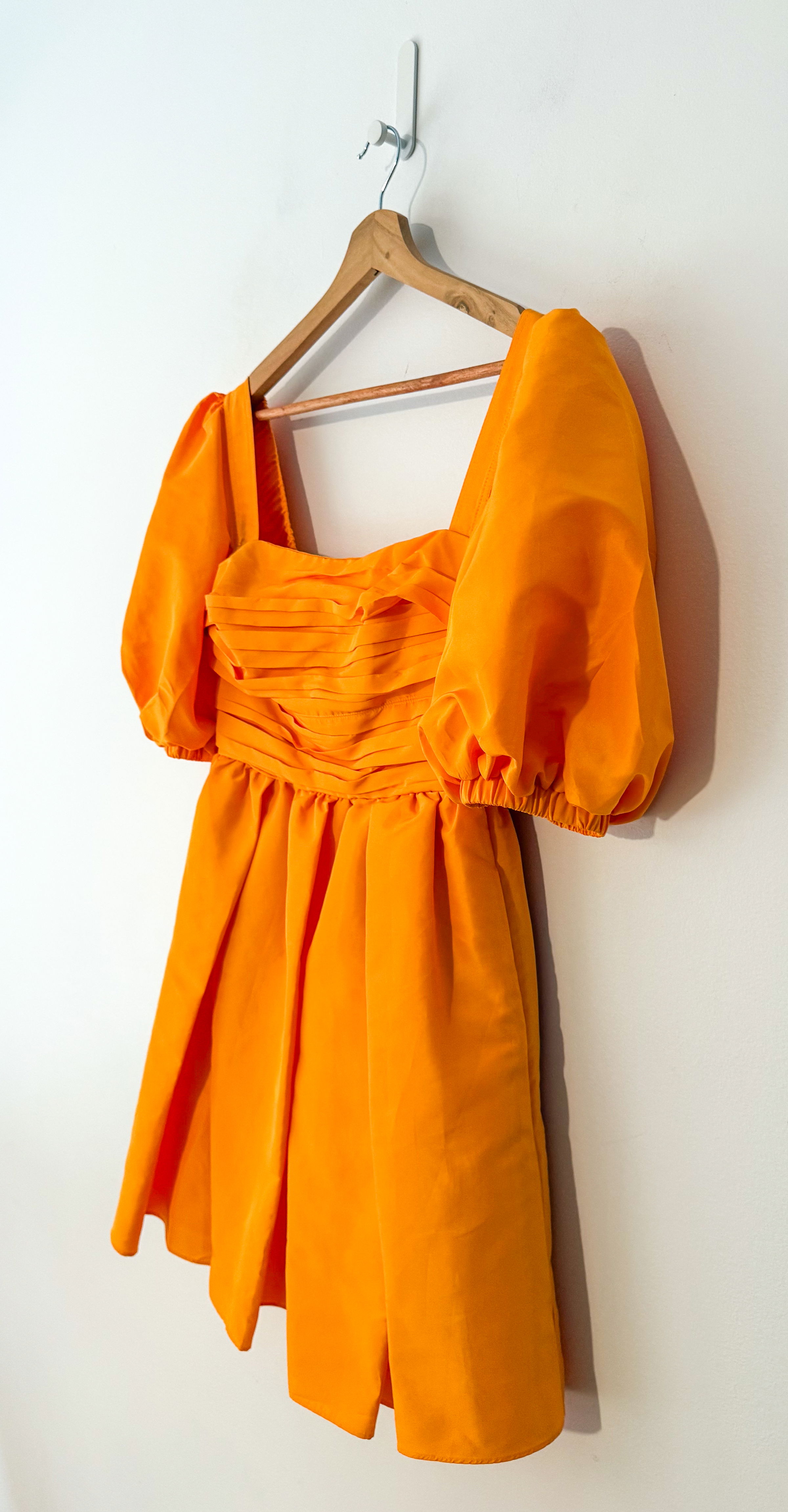 Pleated Fit & Flare Dress with Balloon Sleeves, zip fastening, puff sleeves and concealed pockets.