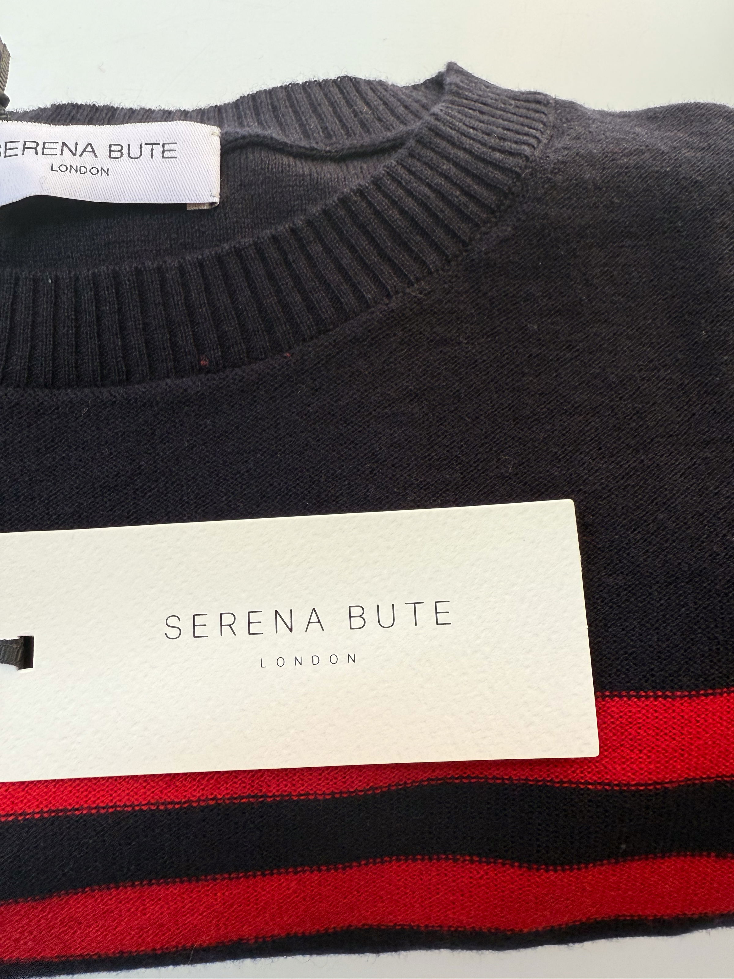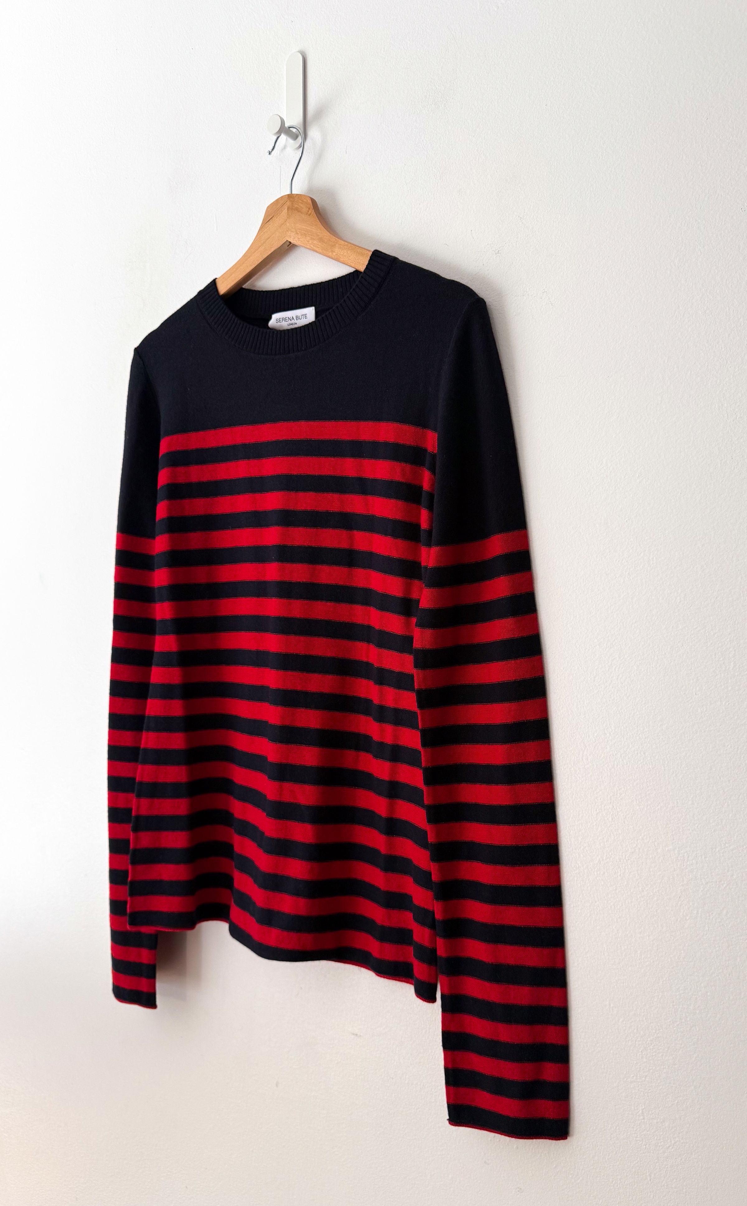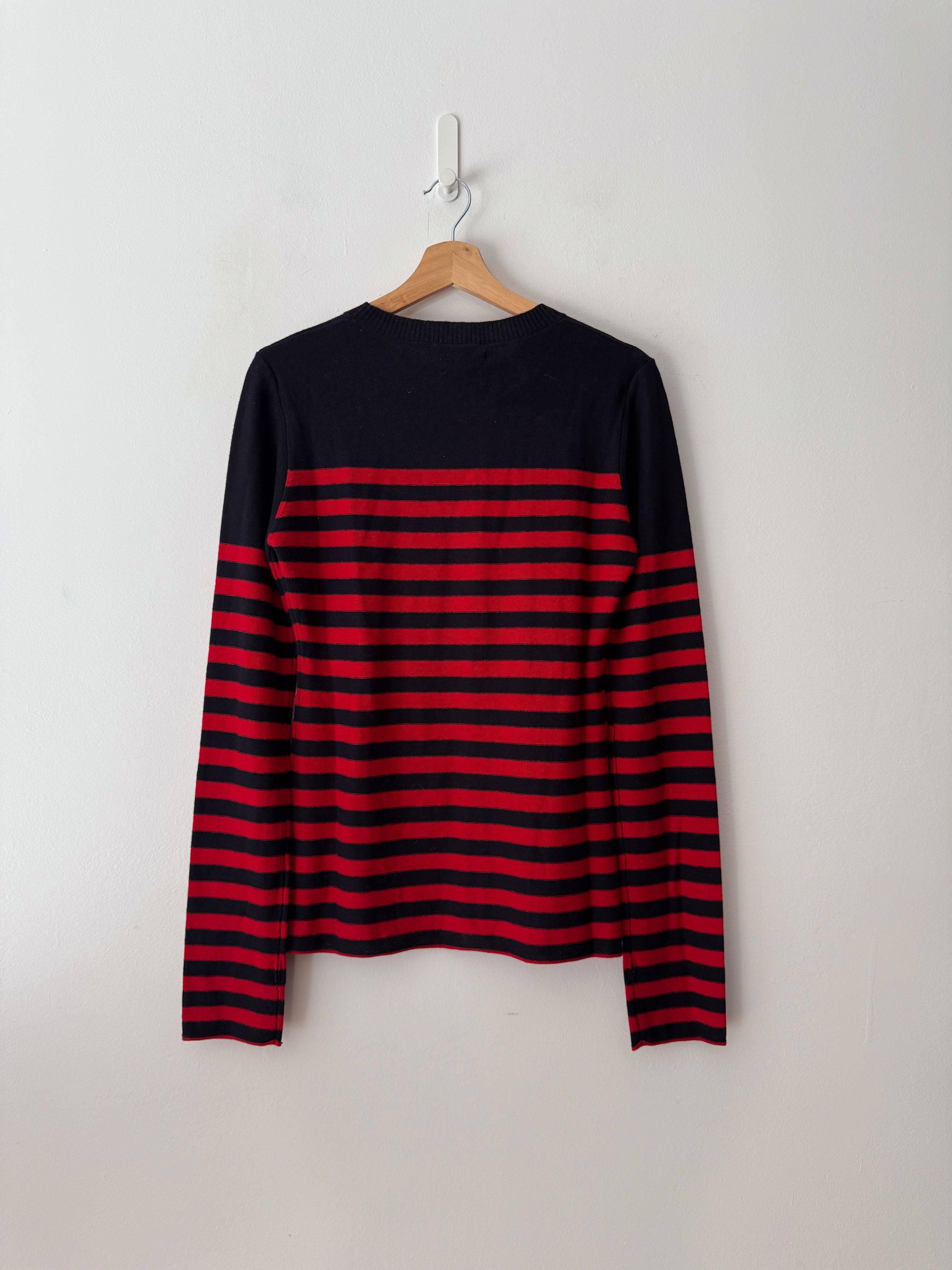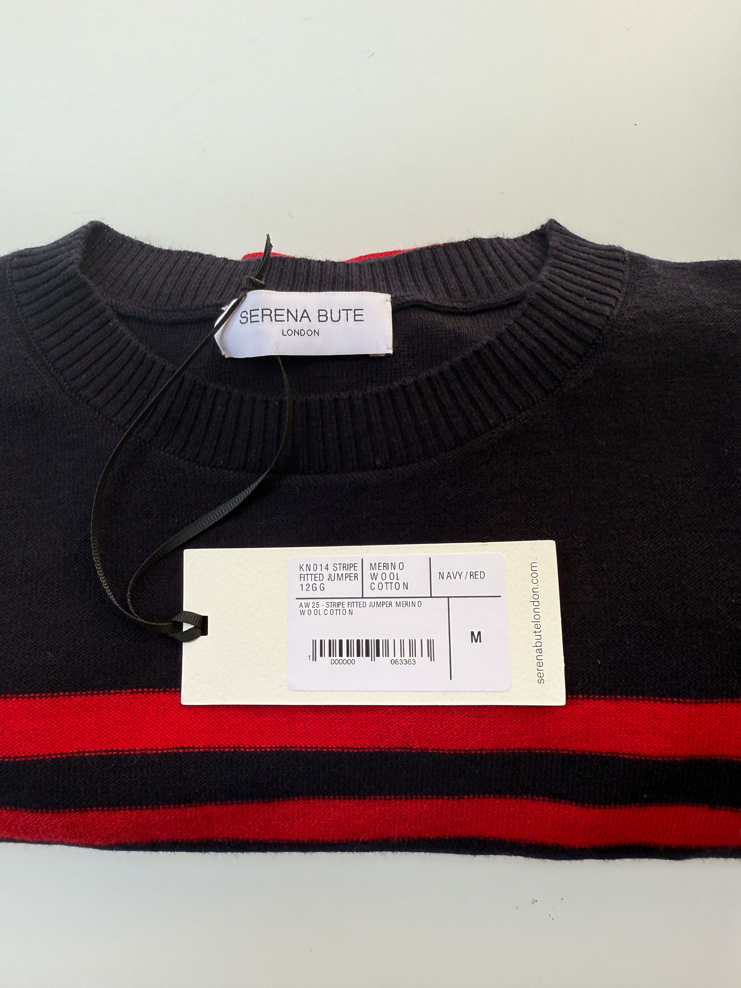 Our Striped Fitted Jumper is crafted from a natural blend of merino wool and cotton for a breathable, lightweight feel. Featuring bold red and navy stripes, it’s a graphic staple with a classic crew neck and flattering silhouette.
