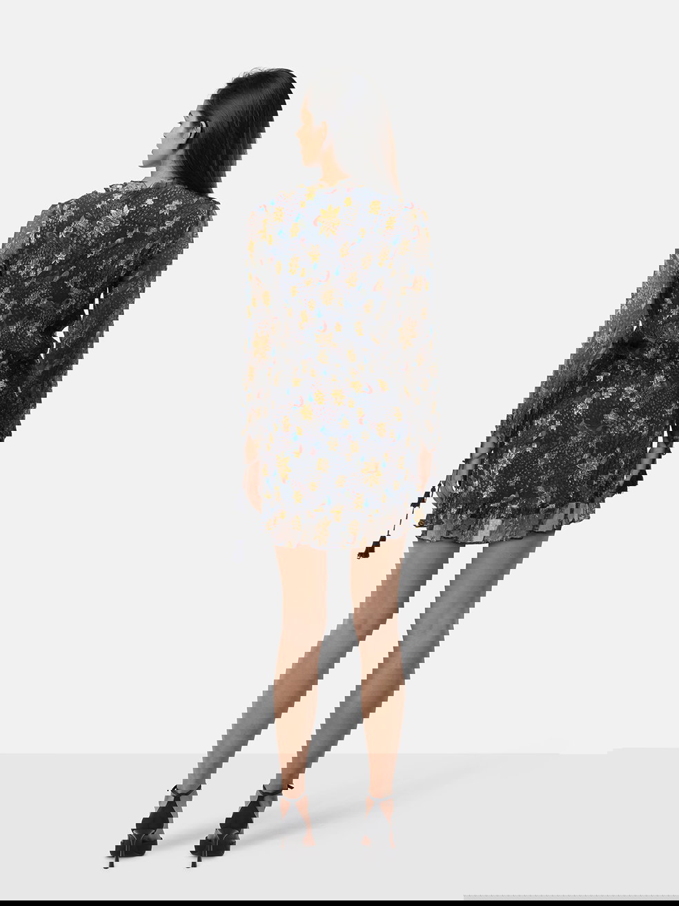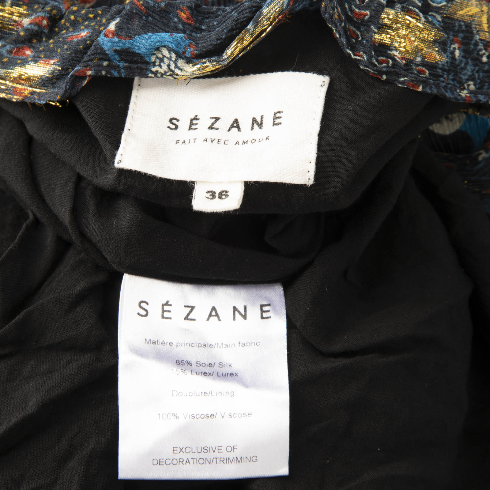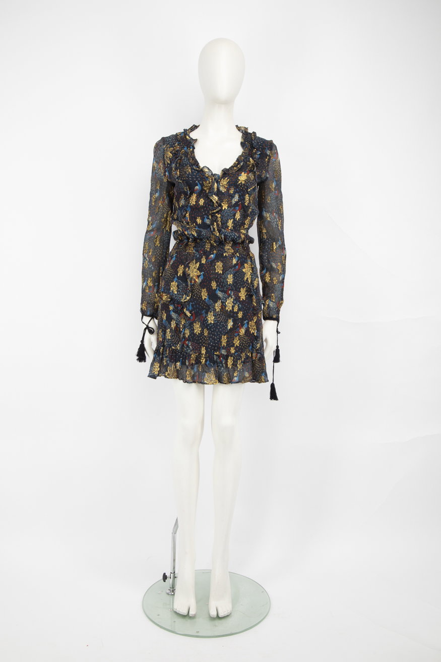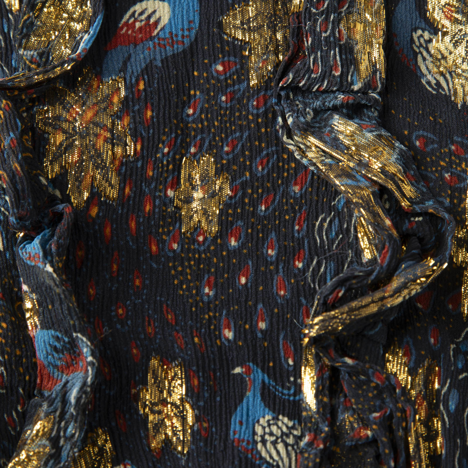 Navy and gold peacock print silk dress in excellent, pre-worn condition. Composition: 85% silk, 15% lurex. Dry clean / hand wash. Measurements: shoulder 41cm, sleeve length 63cm, bust 43cm, waist 25cm, length 91cm.