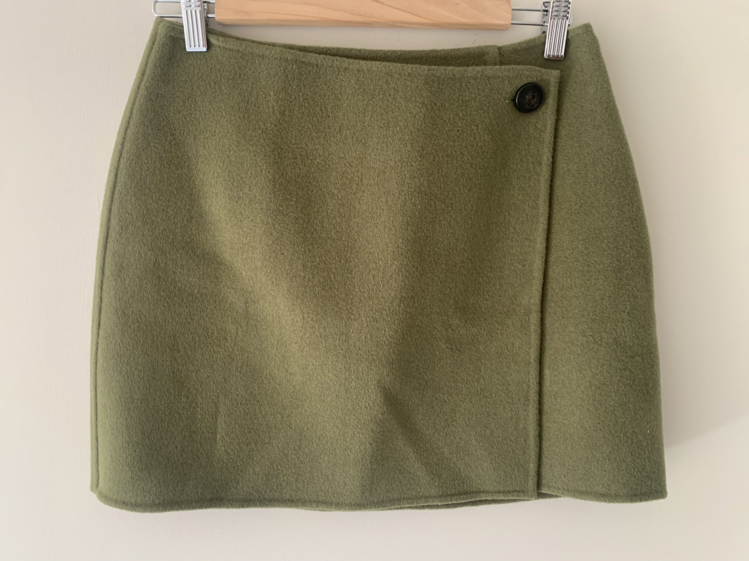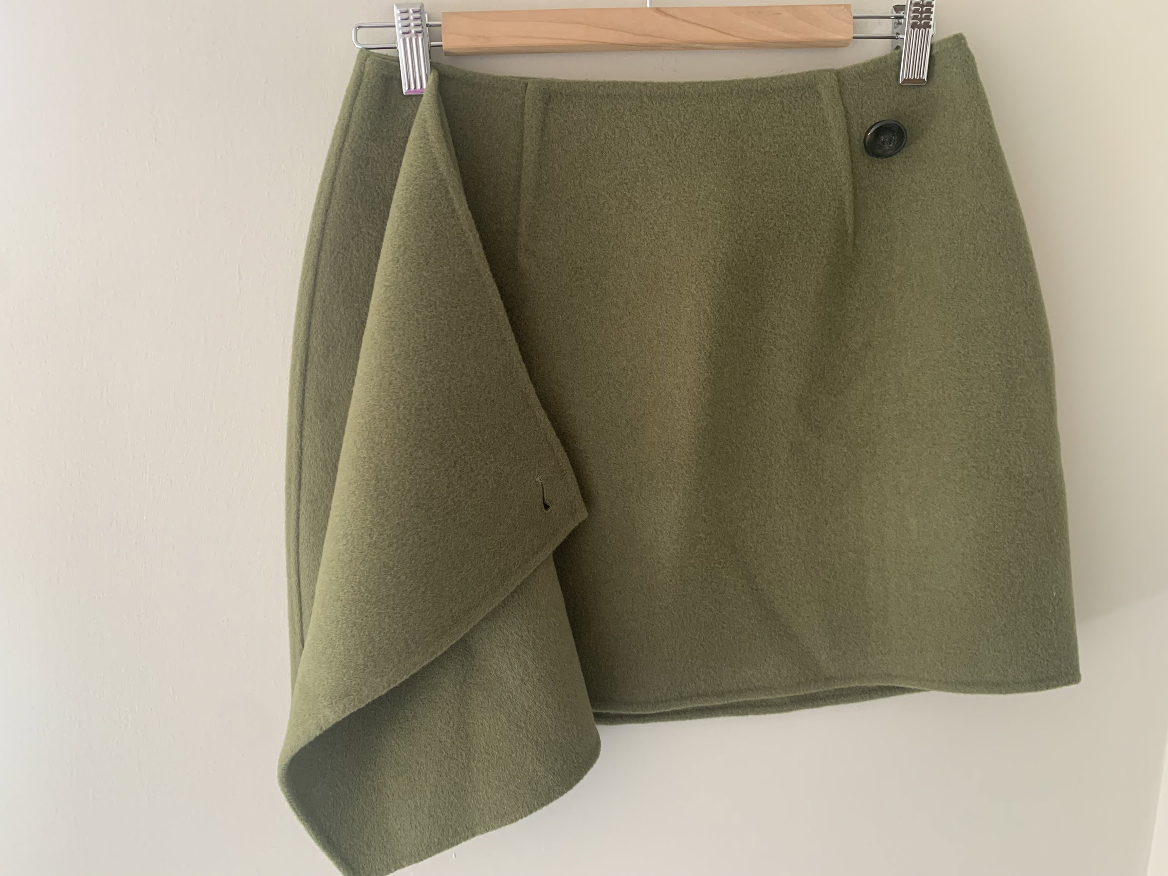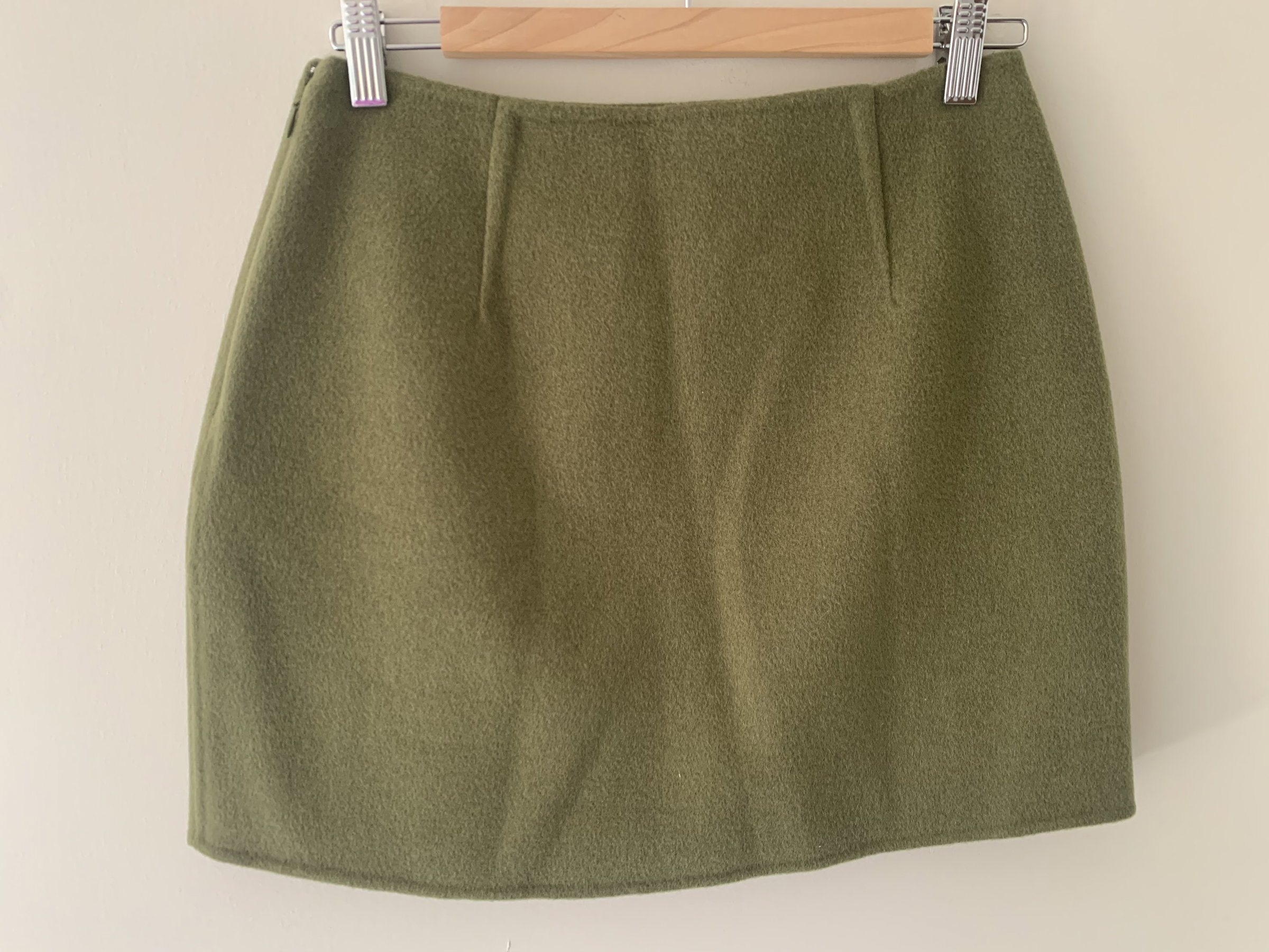 Short asymmetrical skirt in double face - Decorative button front - Side zip fastening - Unlined - Side length: 40 cm Waist measures 36cm across. 100% wool Matching top listed separately