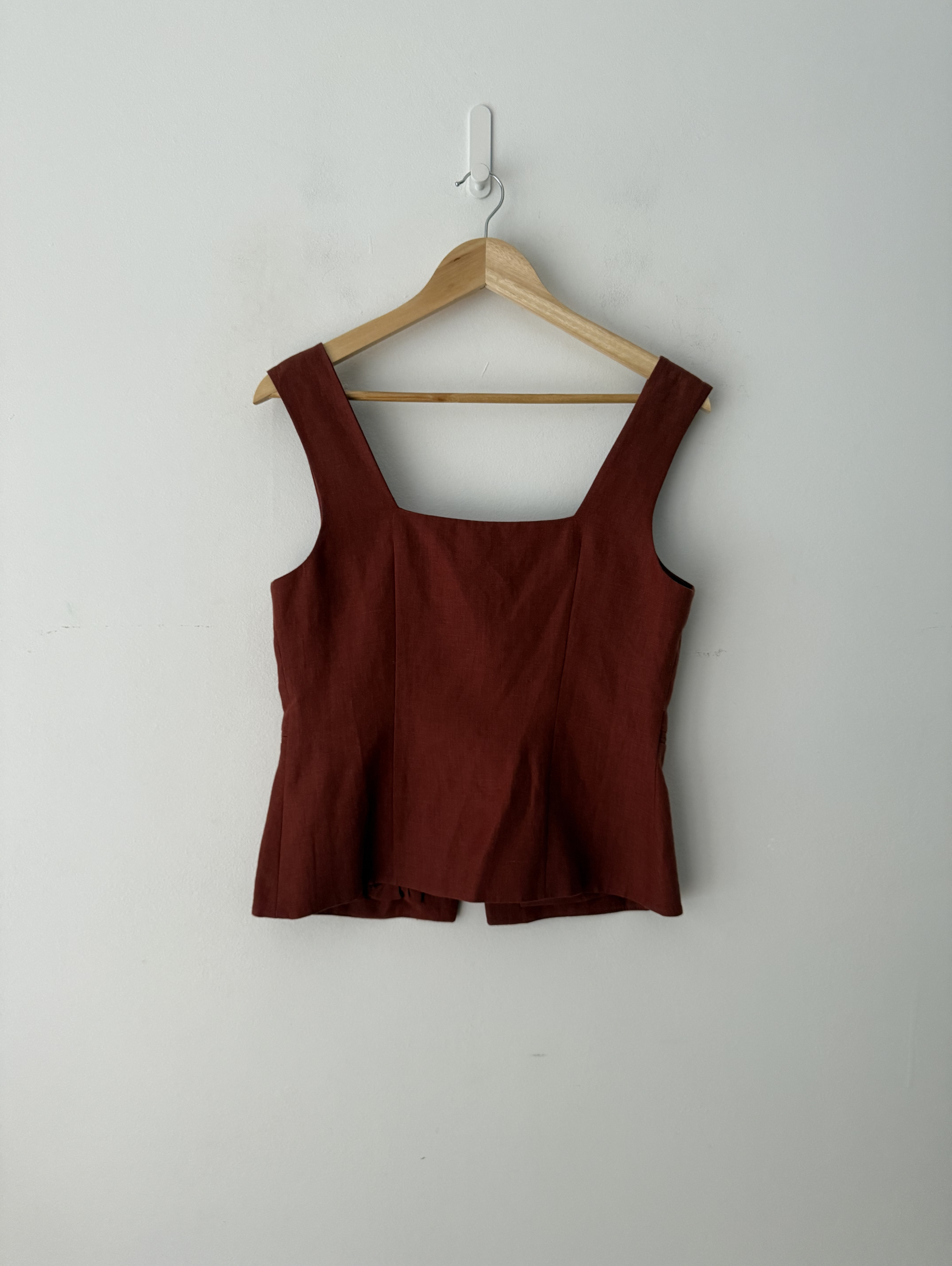 Sleeveless linen blouse. Square neckline. Front closure with covered buttons. Piped pockets. Fitted and fully lined.