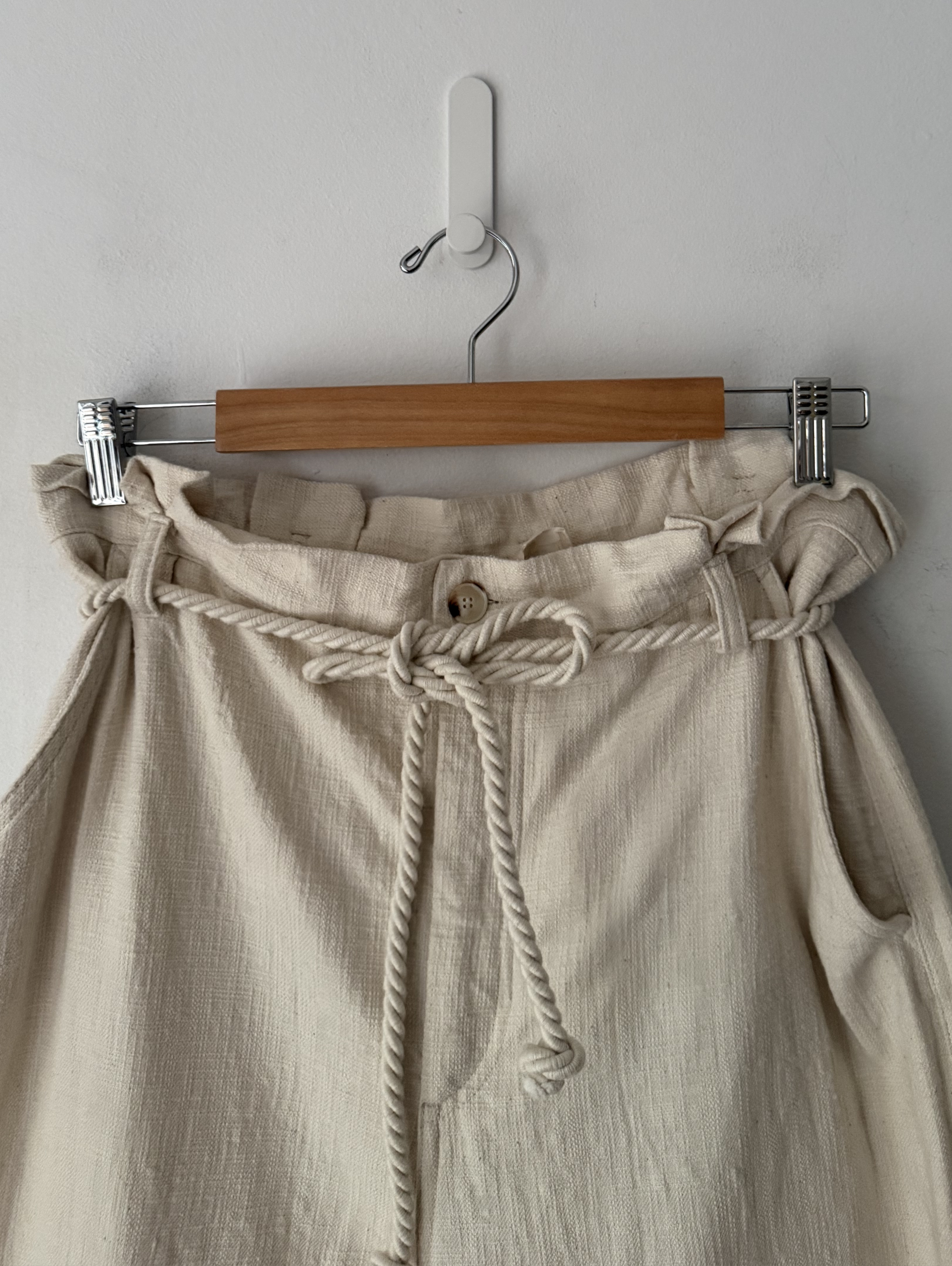 The Sézane Lounis Trousers are high-waisted, paperbag-style pants featuring a removable rope belt, waist pleats, and a front zip/button closure. They are designed with a long, wide-leg cut and are crafted from sustainable materials, such as organic cotton.