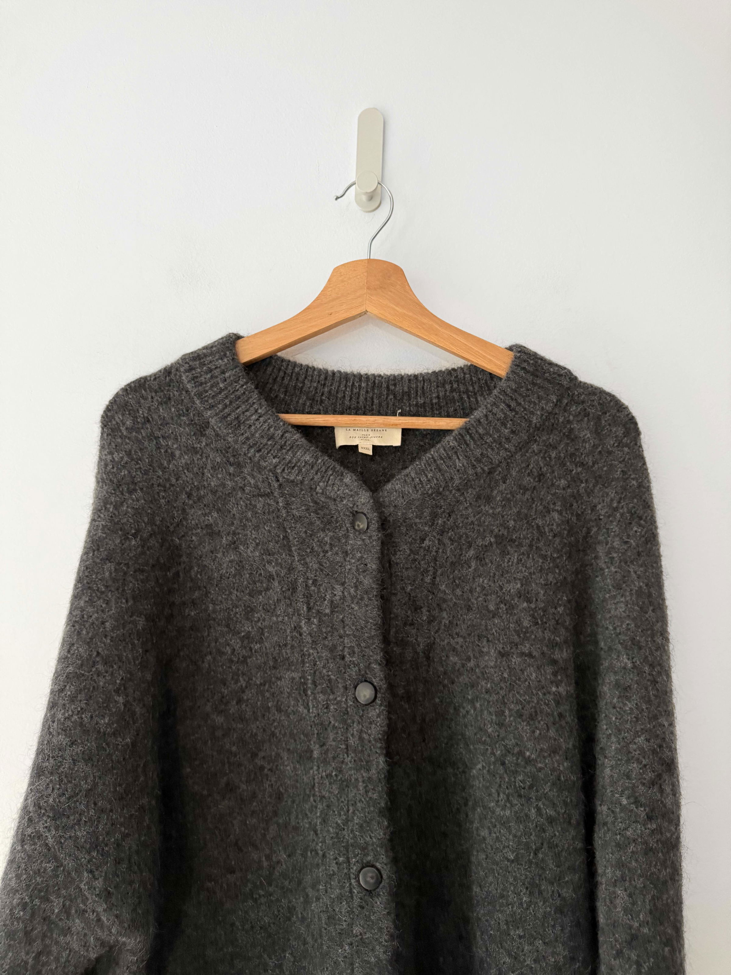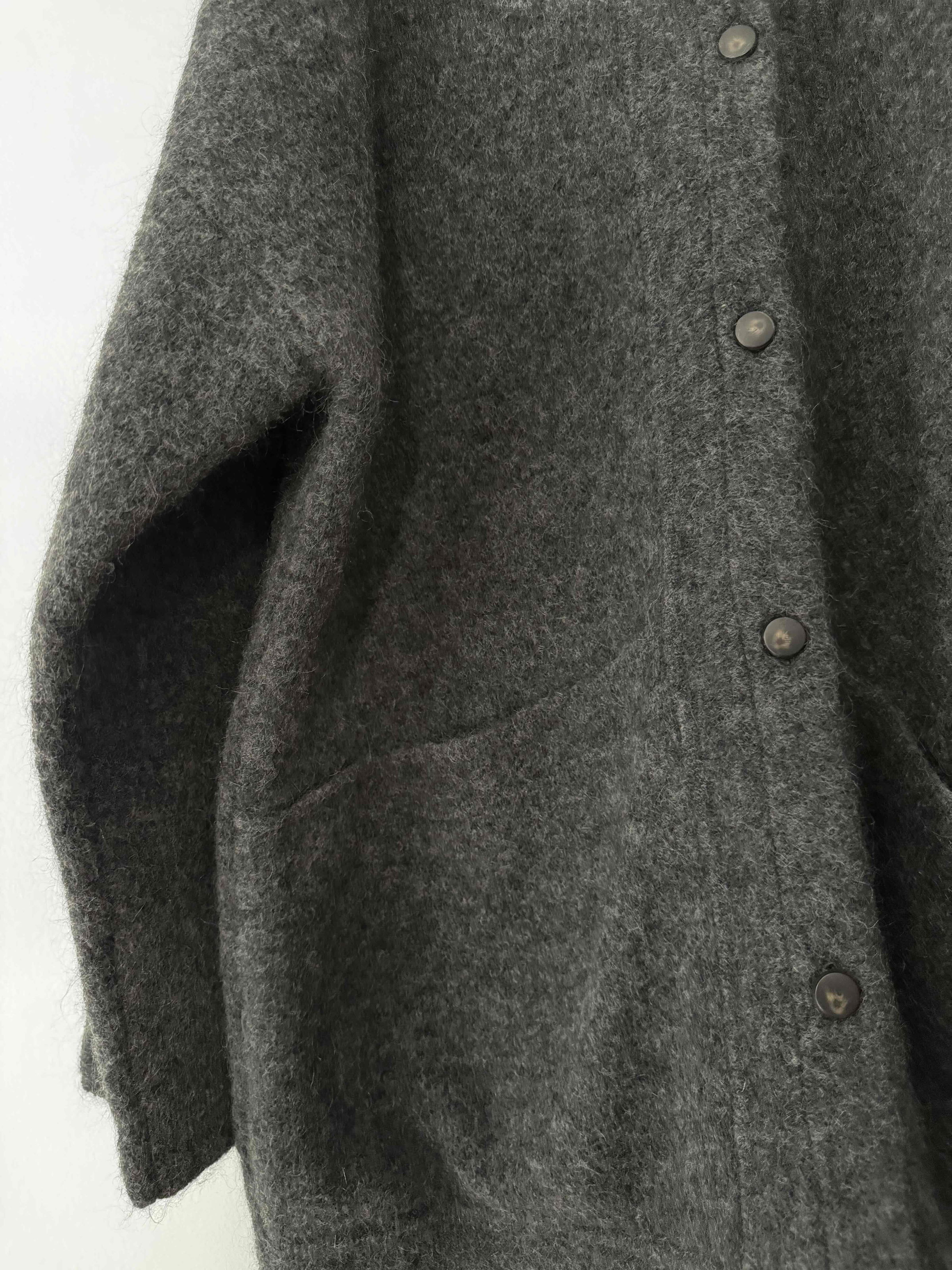 Grey oversized long-sleeved wool and kid mohair jacket in perfect, never-worn condition. Baseball collar with pockets on the front. Composition: 34% Kid mohair, 34% Wool, 27% Polyamide, 5% Elastane. Hand wash in cold water.