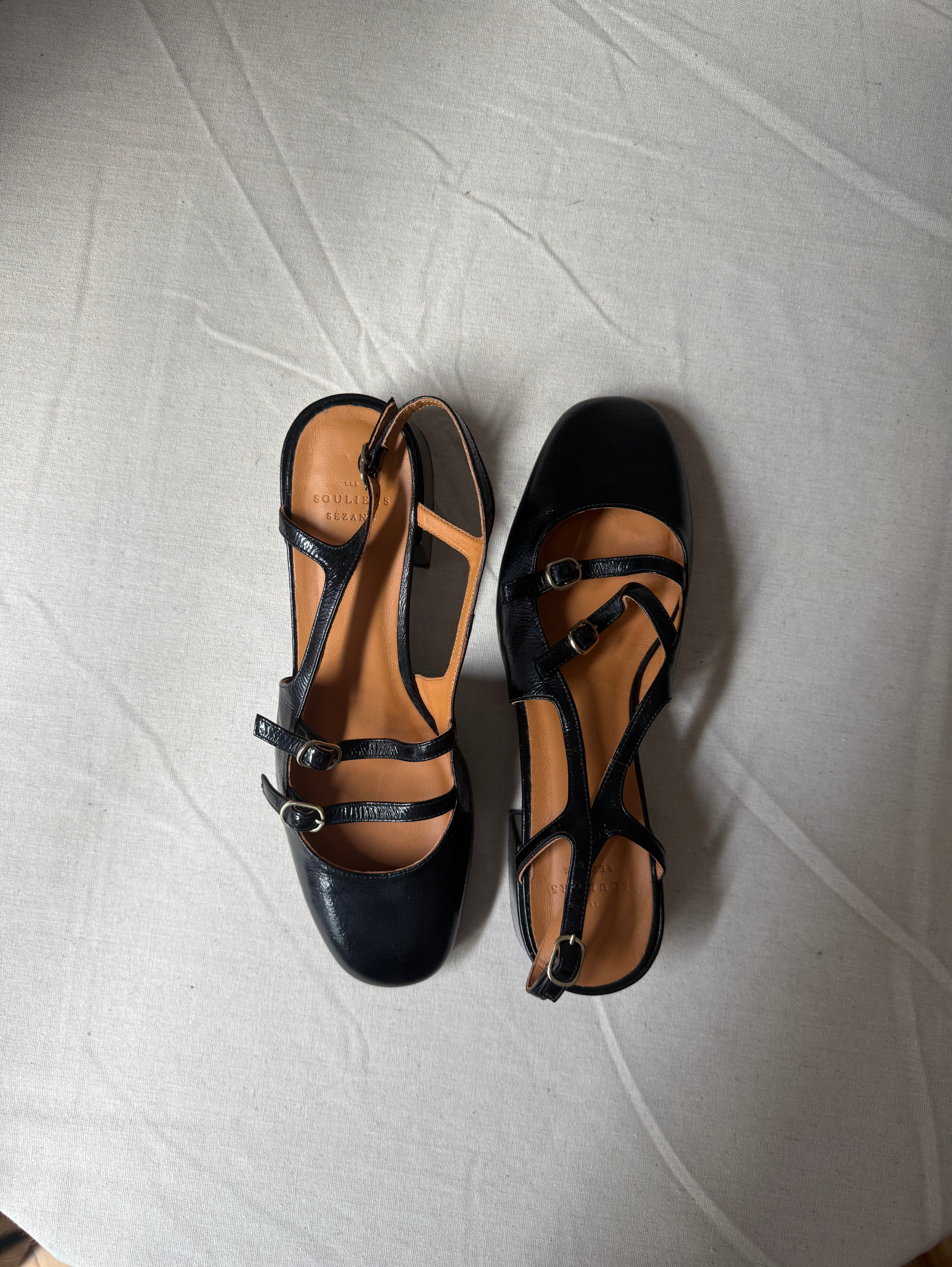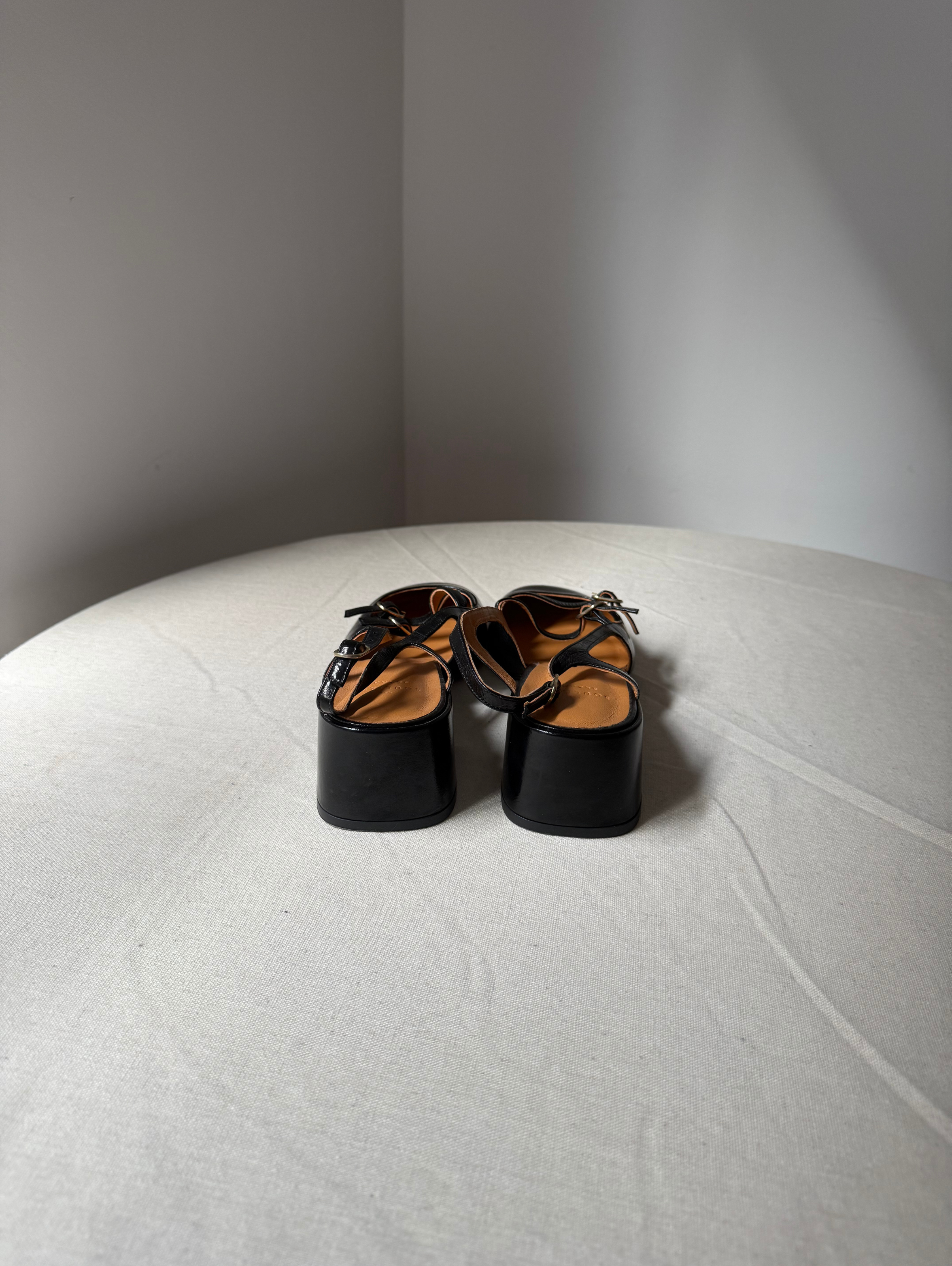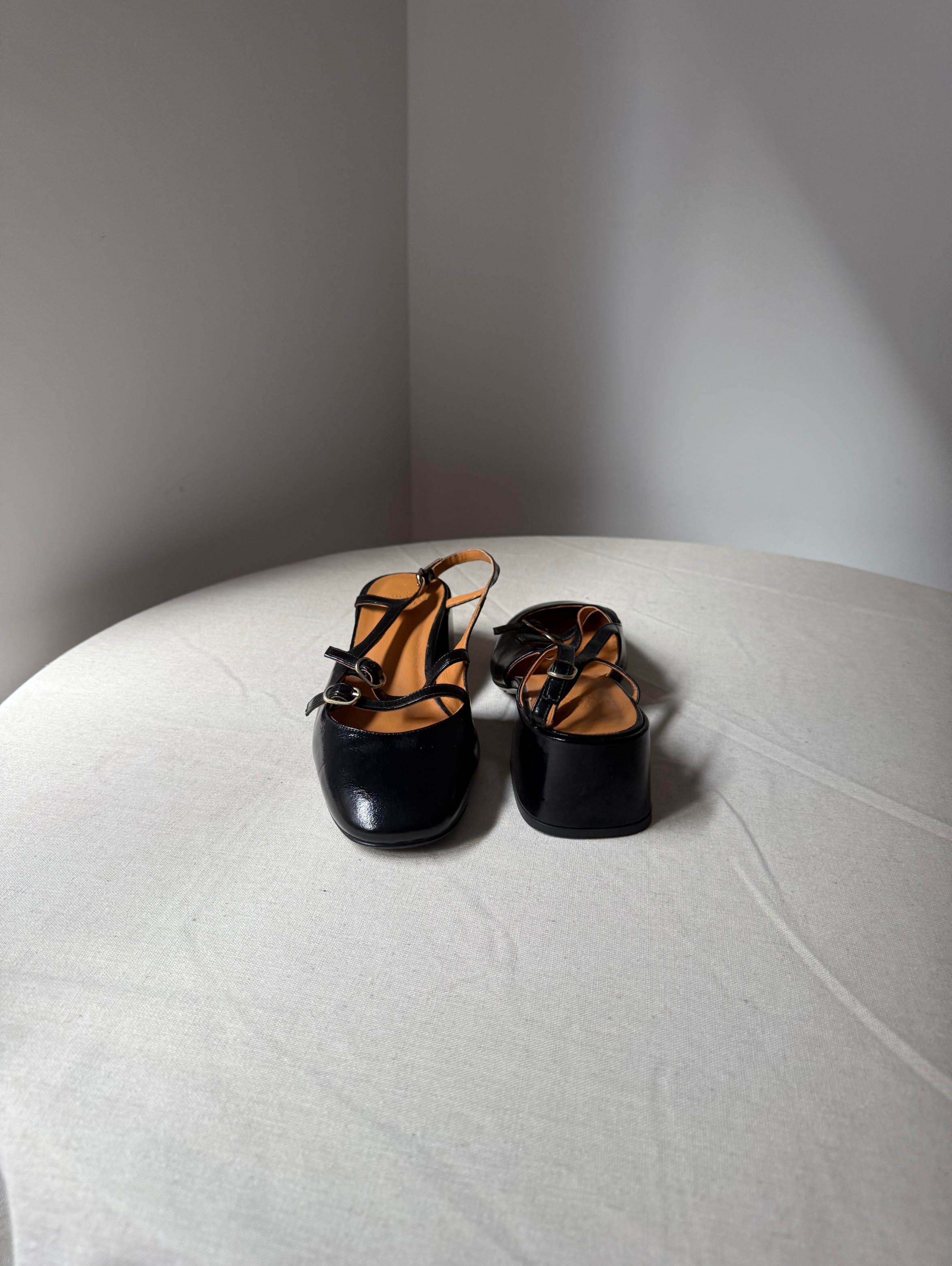 Mid-height heels. Buckled ankle strap fastening system. Patent leather exterior. Leather lining and insole.Rubber outsole. Patent leather covered heel.Heel height: 5 cm / 2 in. Light gold-finish brass buckle
