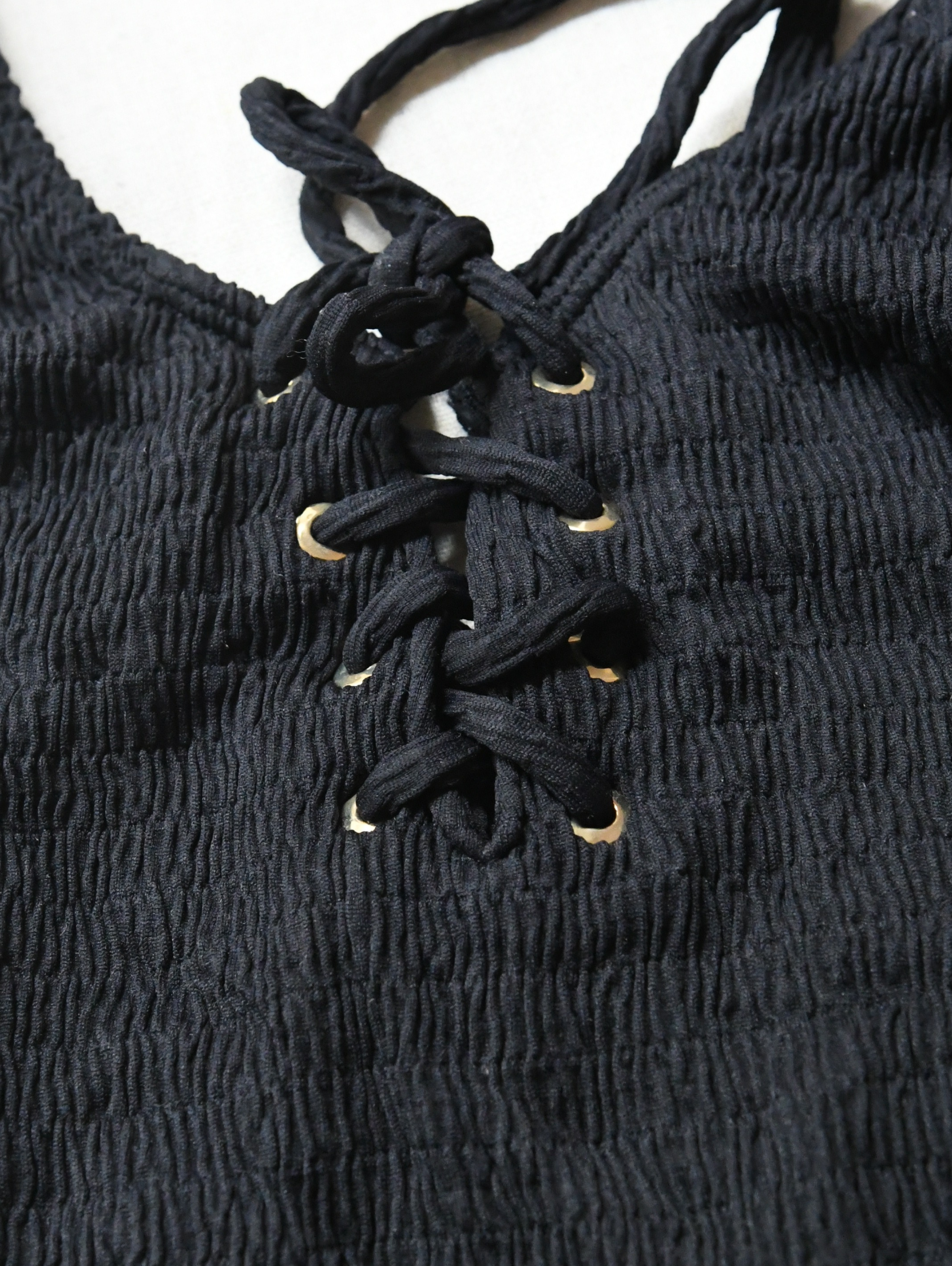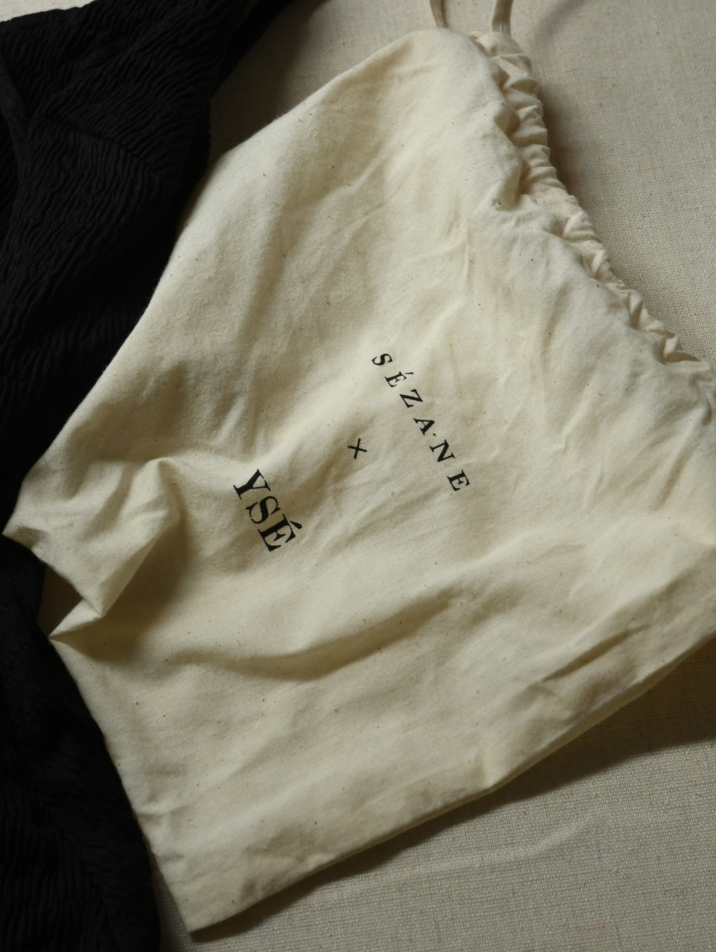 The Sézane x Ysé Vague D'Amour is a black, one-piece swimsuit featuring a round neckline, thin straps, and a distinct lace-up tie detail, often featuring a textured or embossed material.
