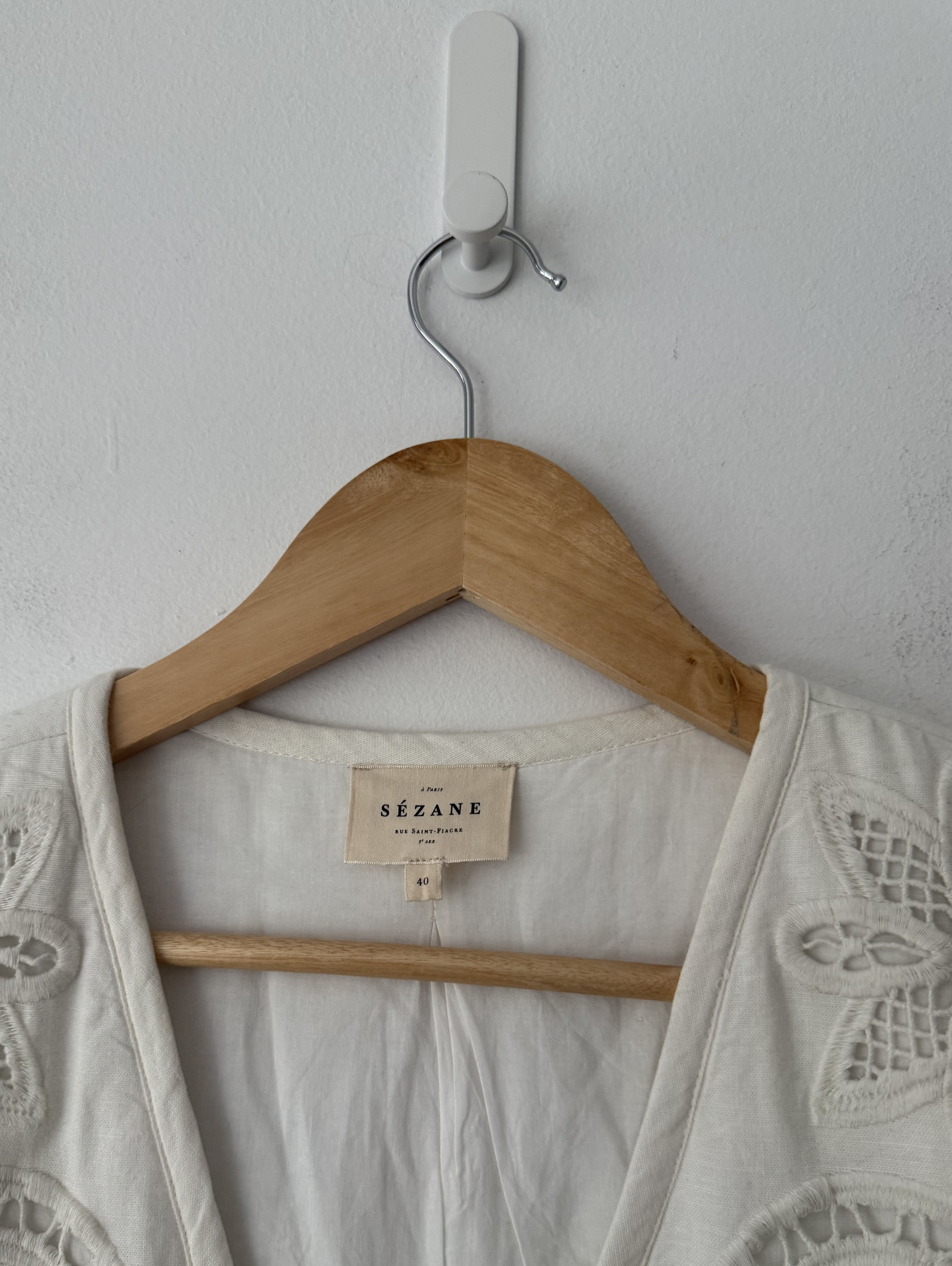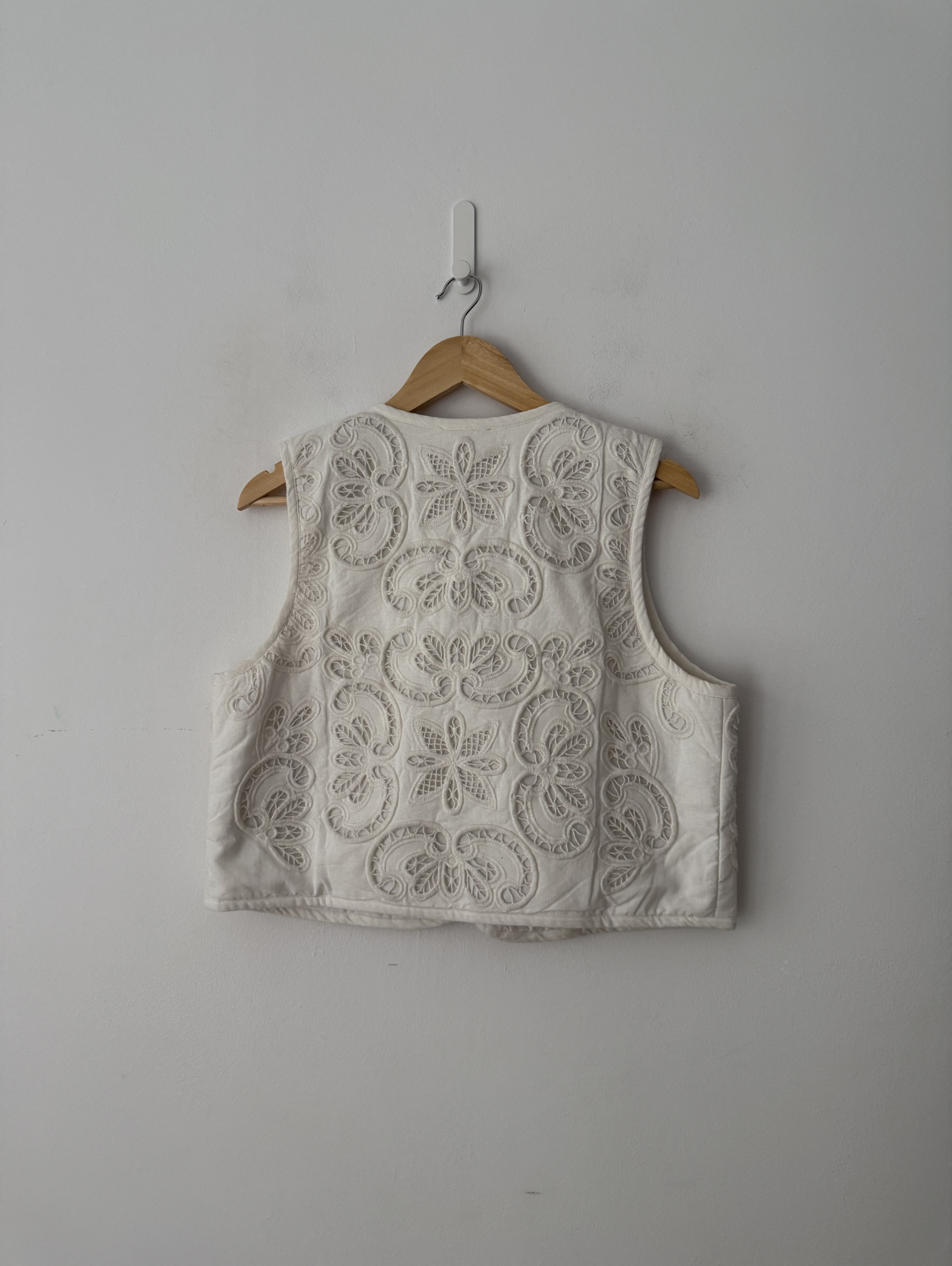 Quilted Vest Jacket with intricate cutwork embroidery and a front tie closure.