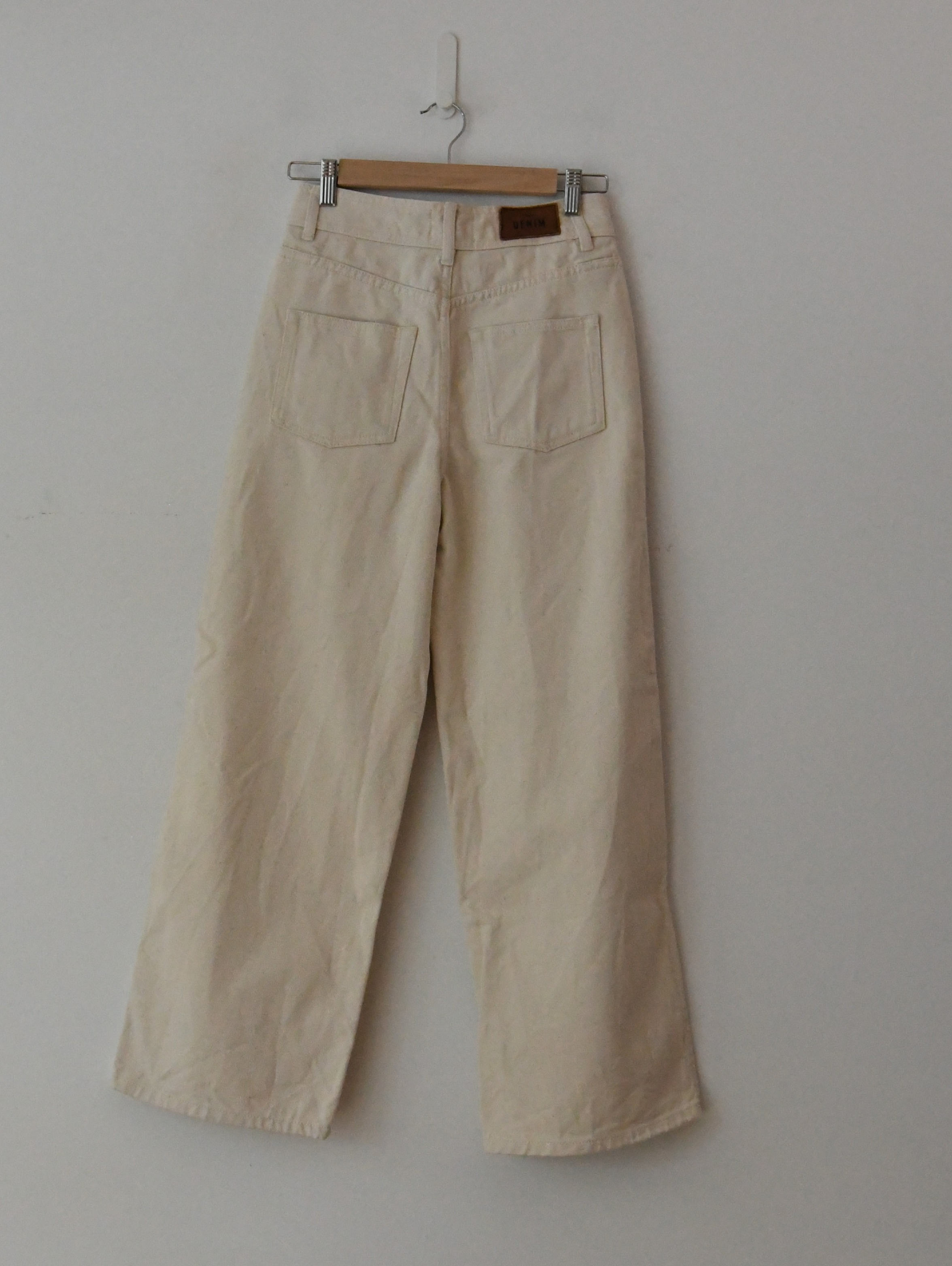 Cream wide leg jean with zip fly and front pockets.