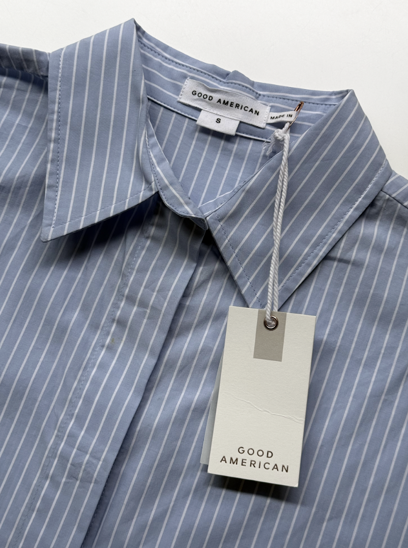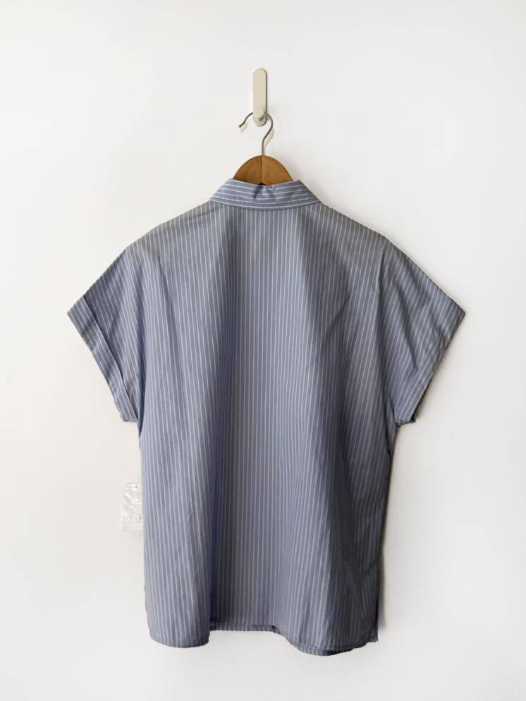 Blue and white, pin-striped, shoot-sleeved cotton shirt in perfect, never worn condition, with hidden buttons. Composition: 100% cotton.