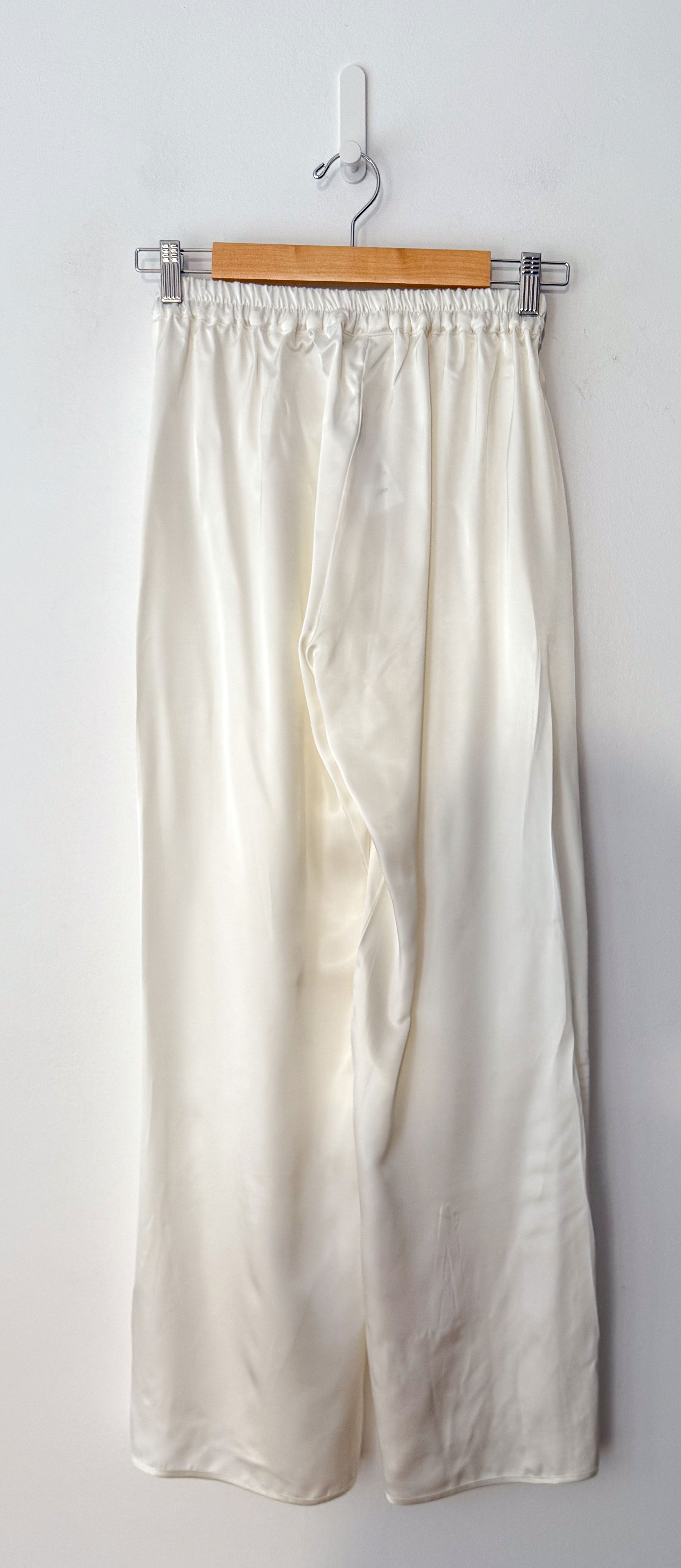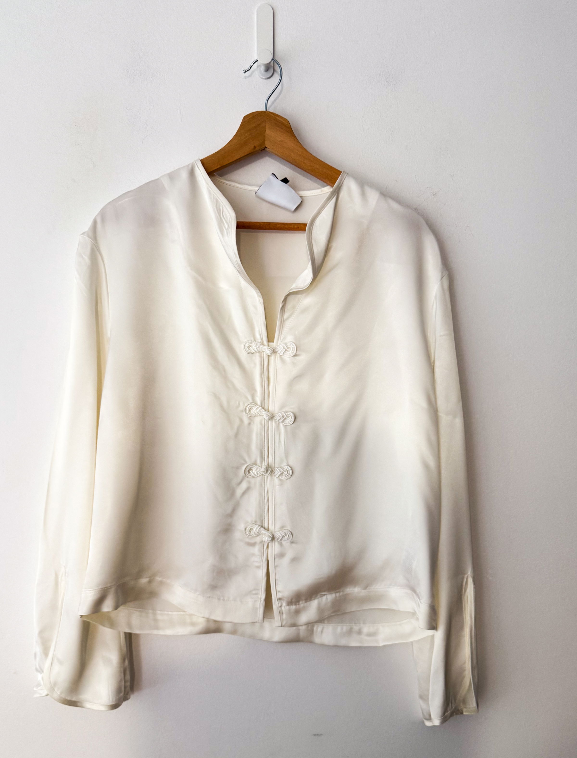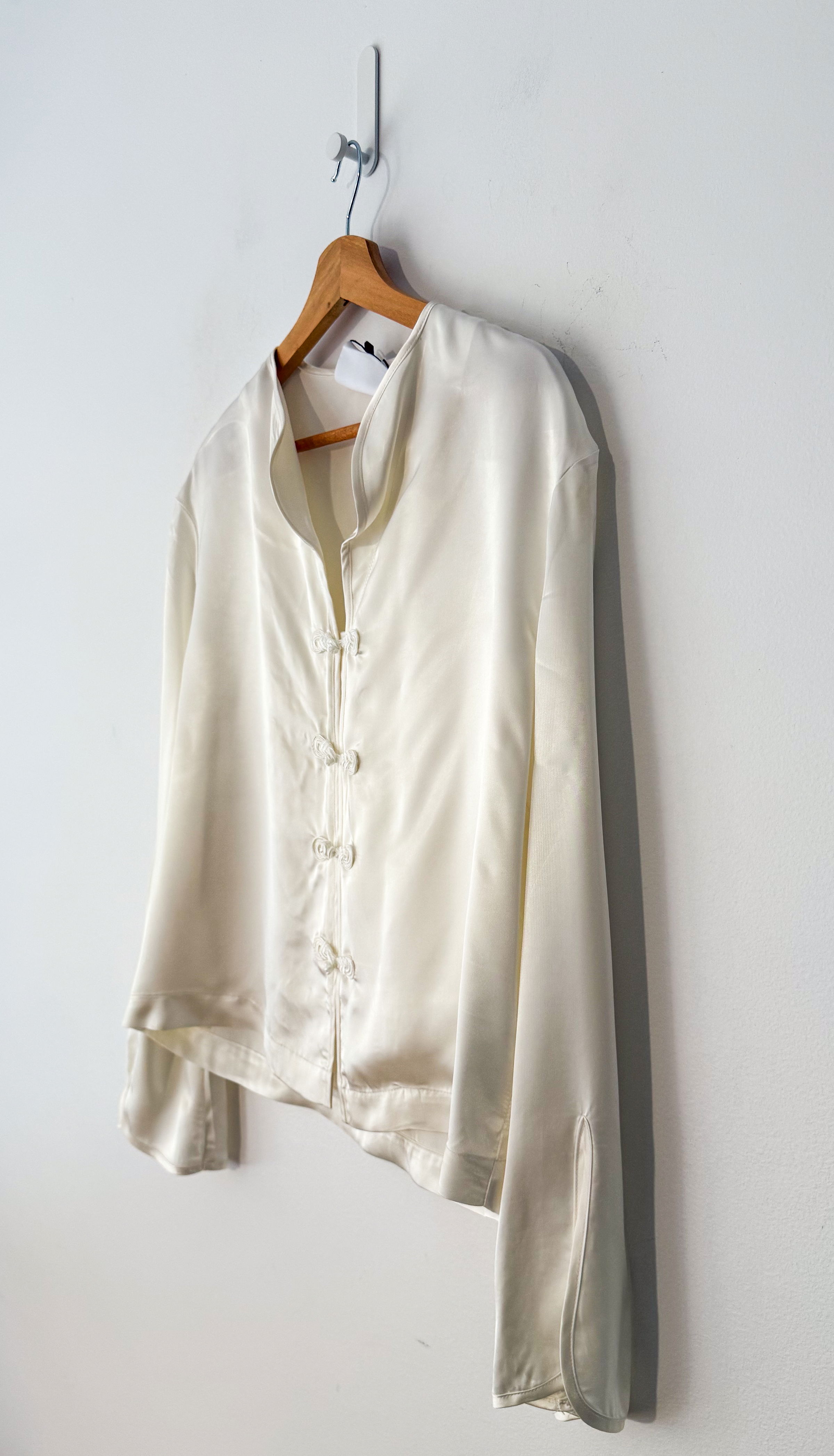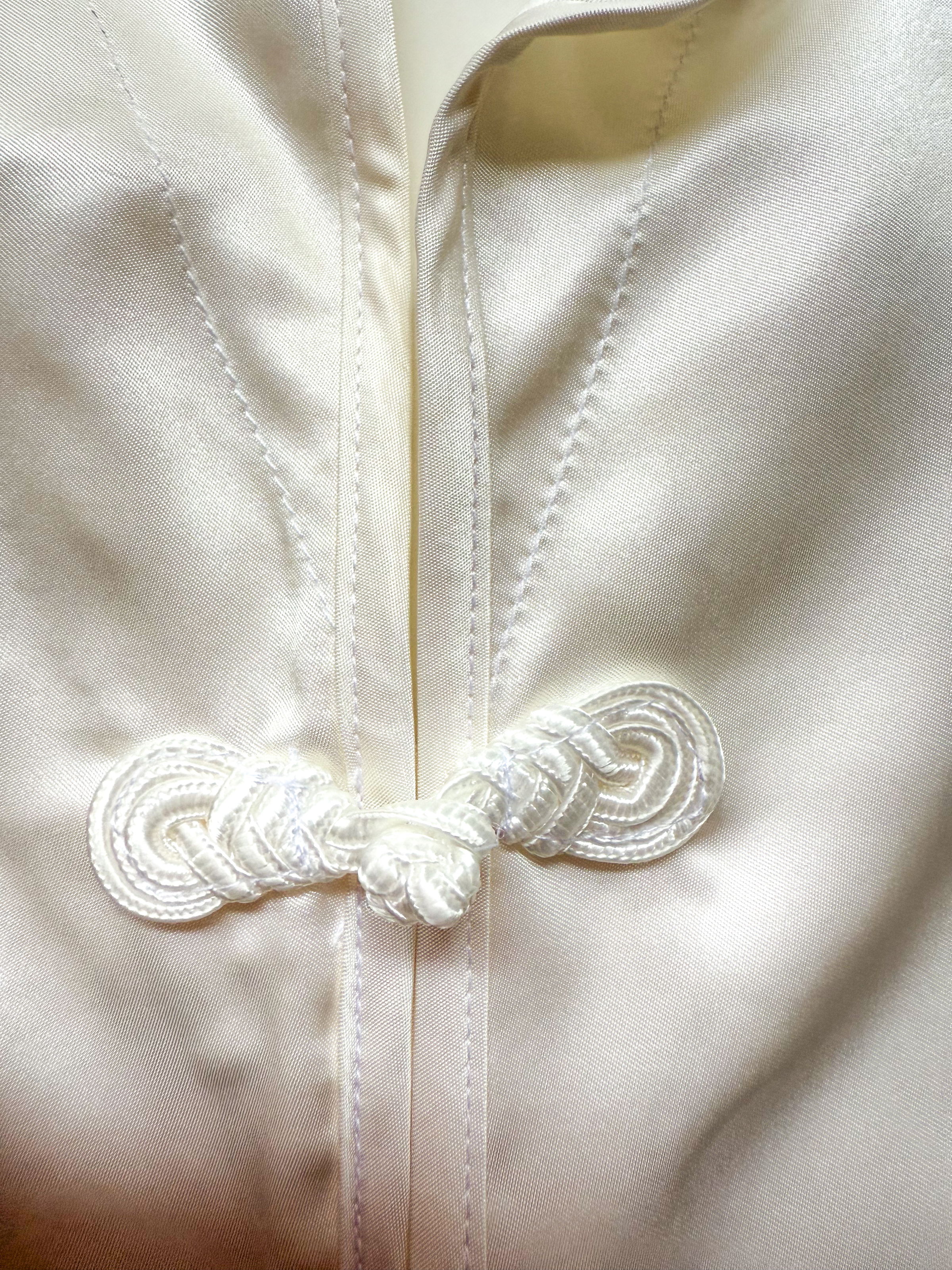 Mandarin-inspired white pajama shirt and pants set in soft, lightweight certified viscose with a subtle shine. The boxy shirt features shawl lapels, handcrafted Chinese frog fasteners at the front, and flared split sleeves with contrast trimming. Elasticated high-waist pants are slightly cropped.