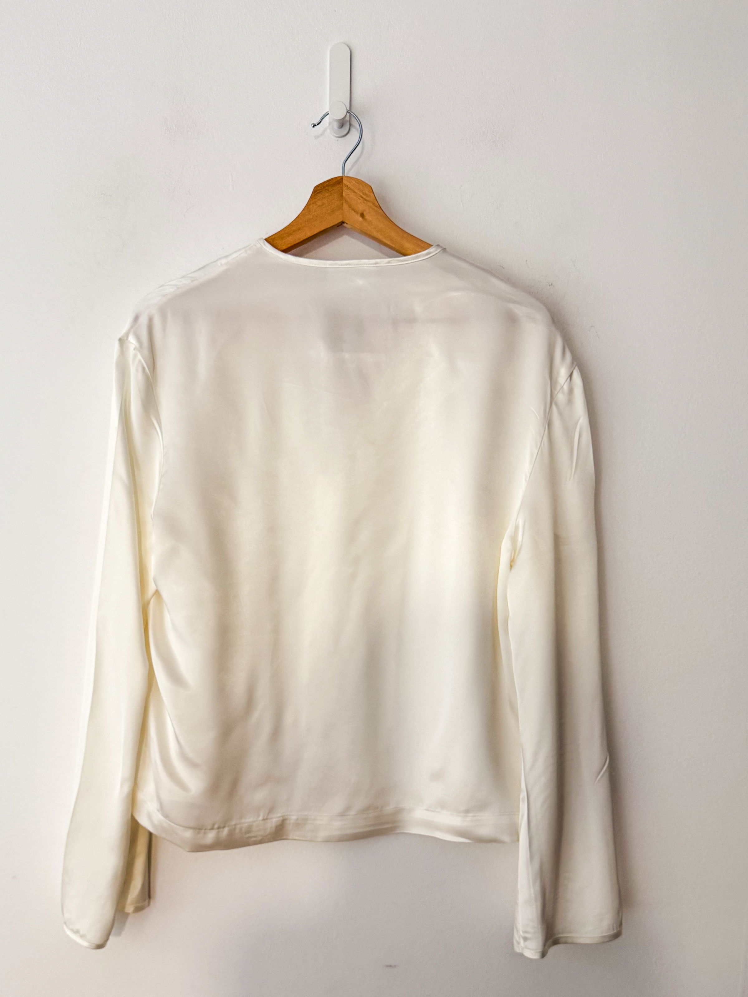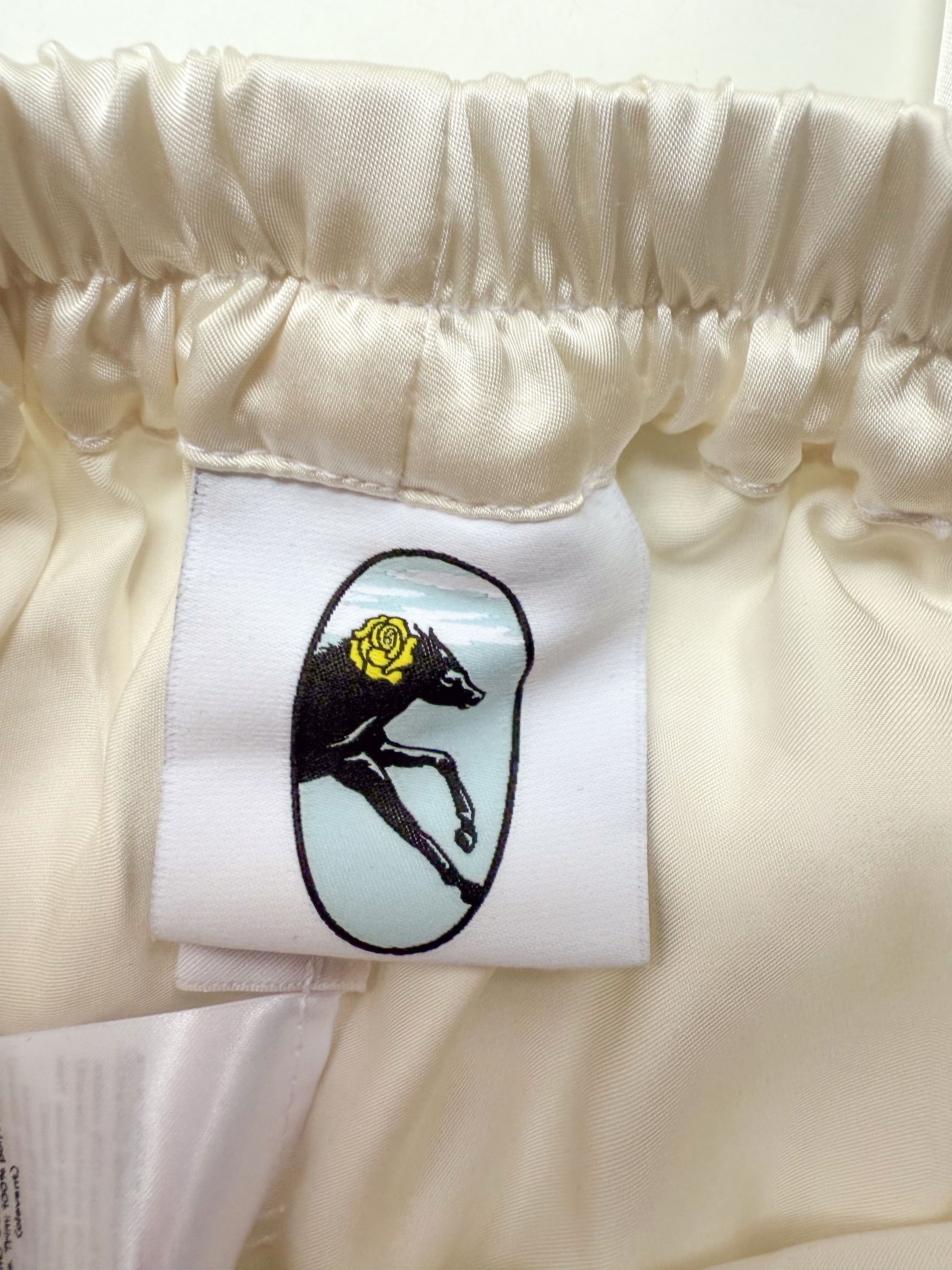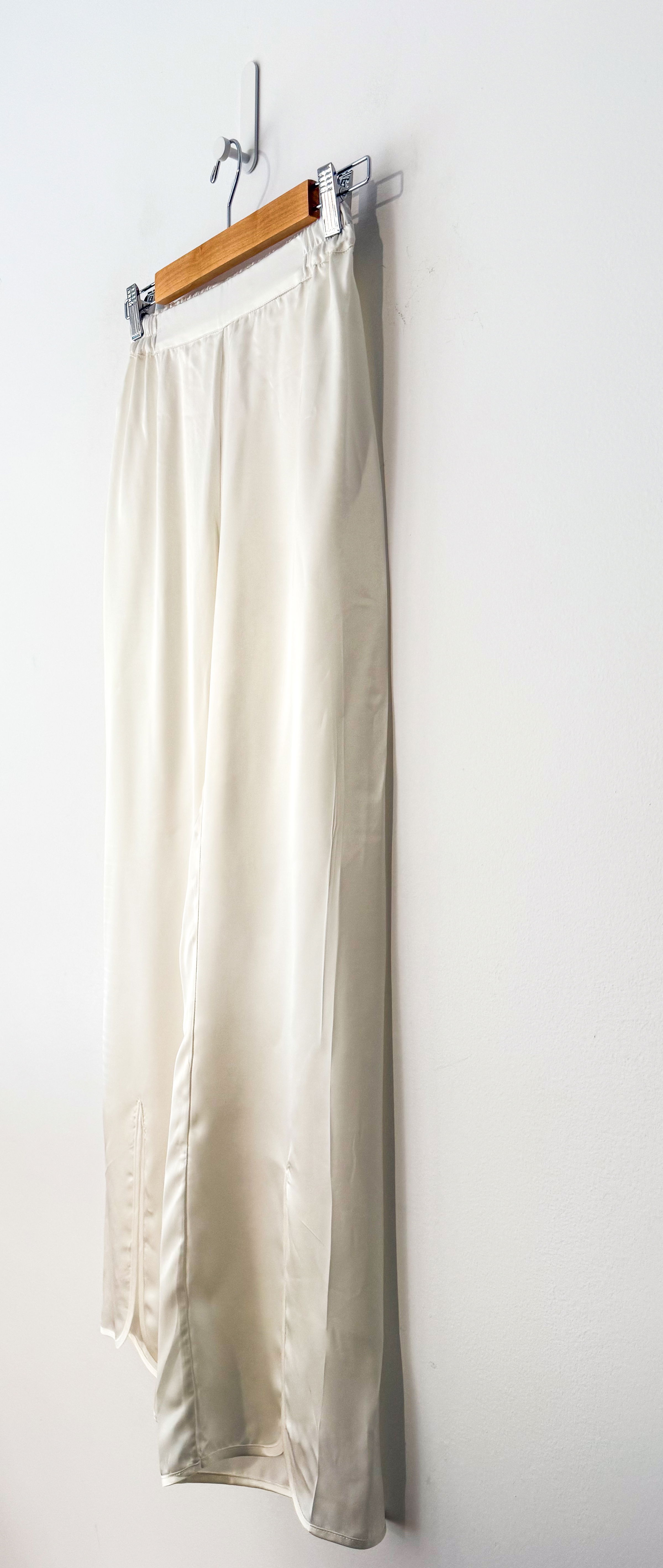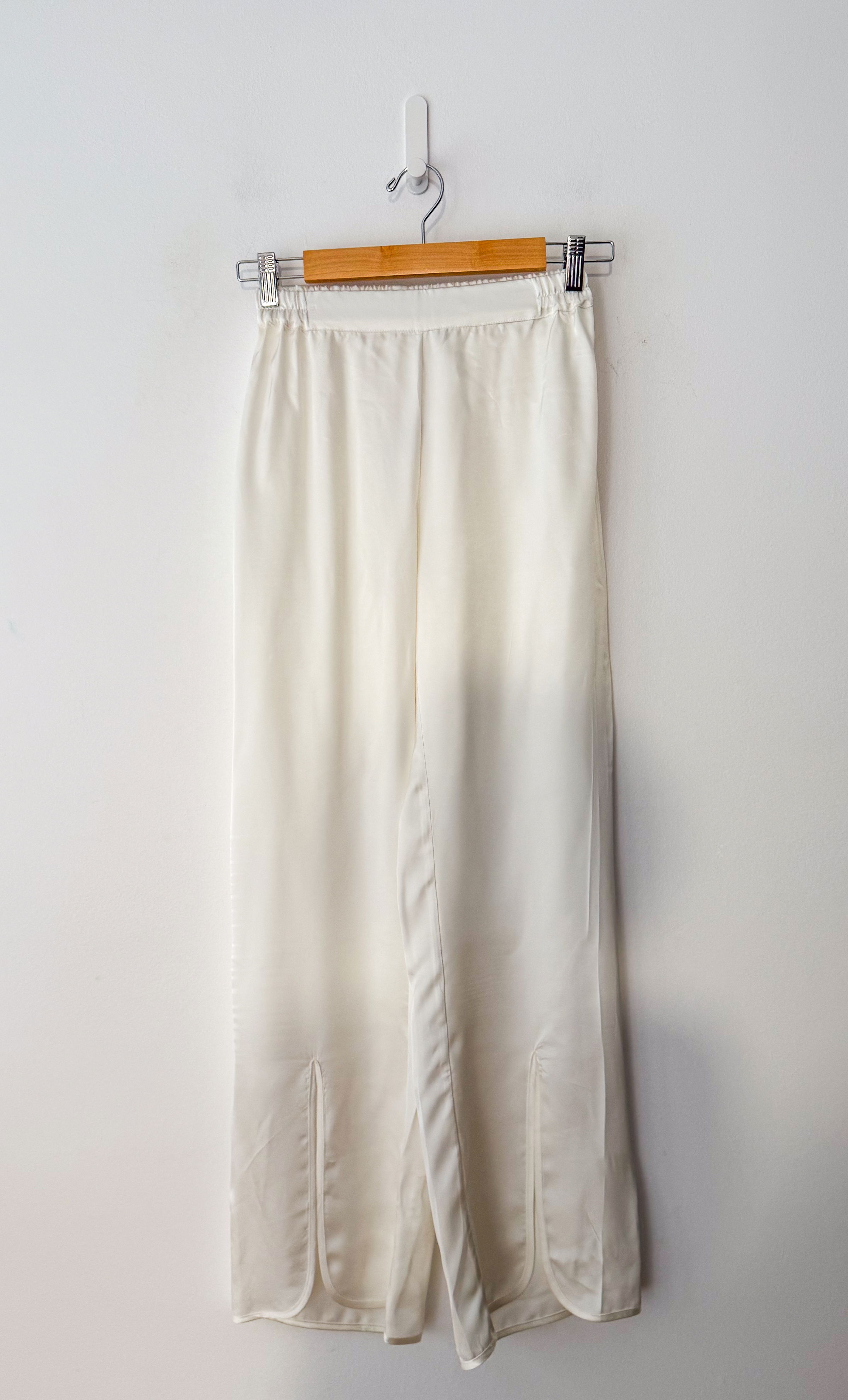 Mandarin-inspired white pajama shirt and pants set in soft, lightweight certified viscose with a subtle shine. The boxy shirt features shawl lapels, handcrafted Chinese frog fasteners at the front, and flared split sleeves with contrast trimming. Elasticated high-waist pants are slightly cropped.