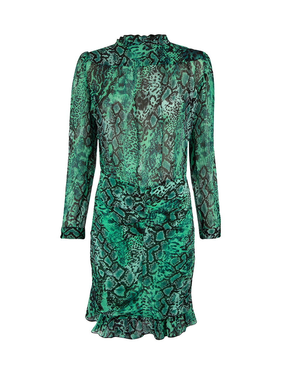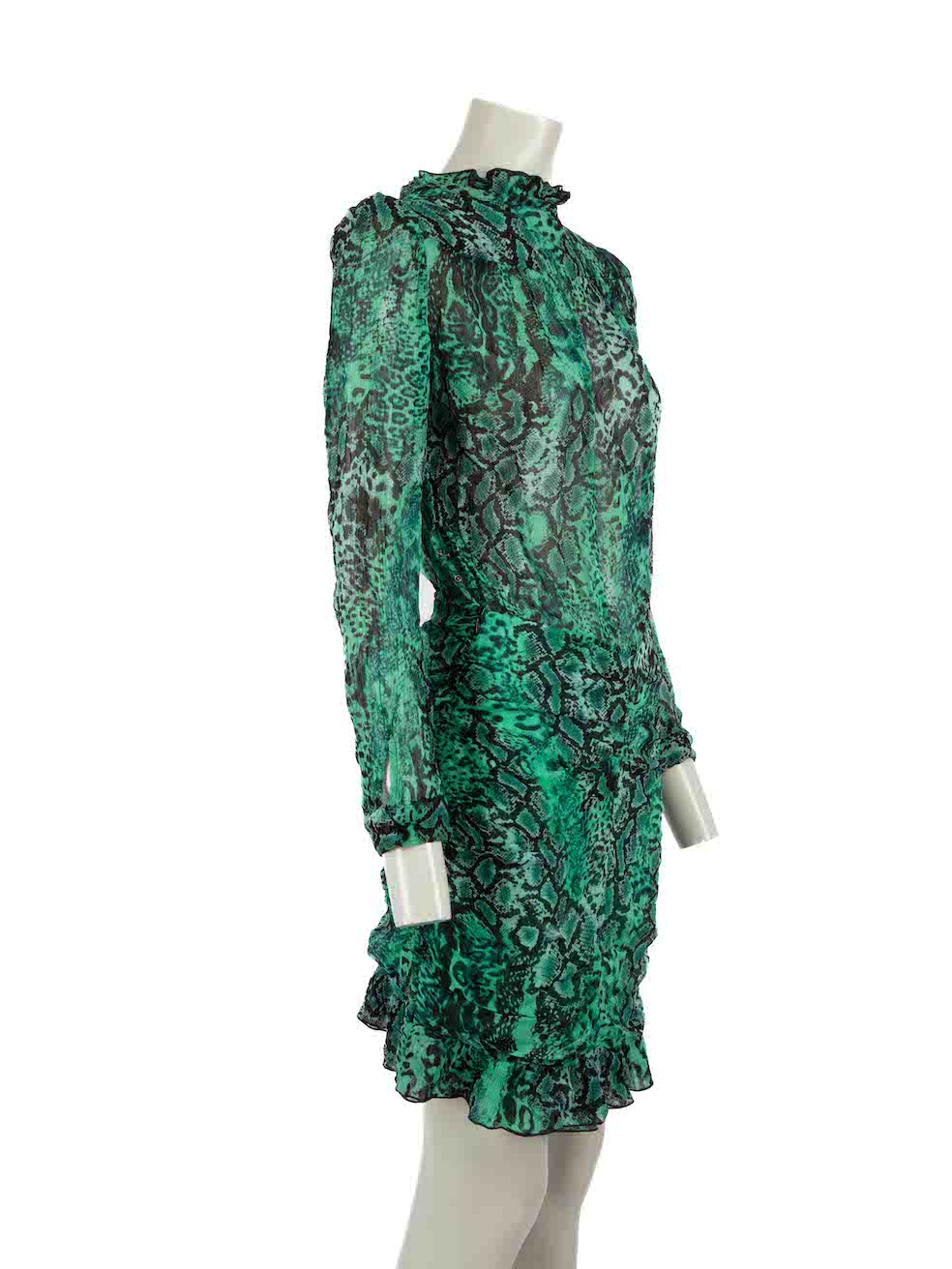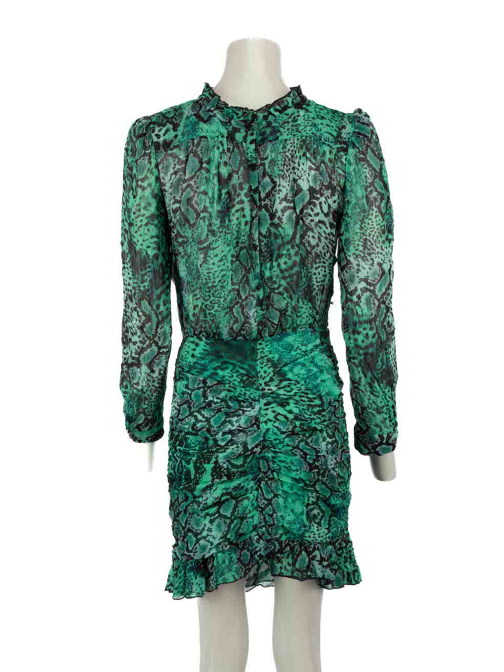 Green mini dress in excellent, pre-loved condition. With snakeskin pattern, sheer, long sleeves, round neck, button up fastening and buttoned cuffs. Composition: 100% Viscose. Hand wash. Shoulders: 35 cm Bust: 46 cm Waist: 32 cm Hip: 44 cmSleeve Length: 58 cm Length: 84 cm