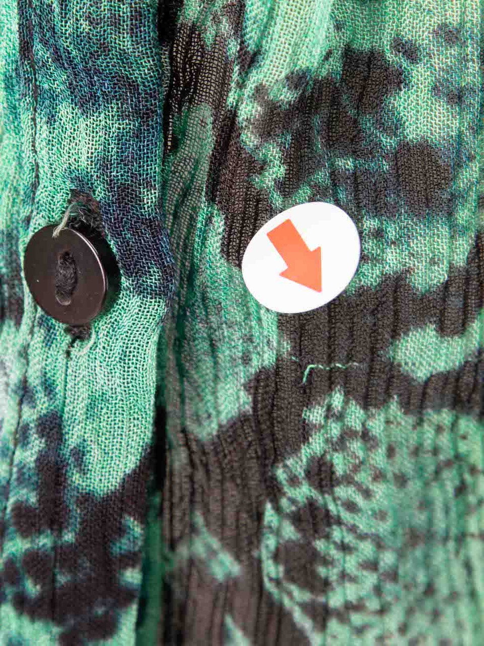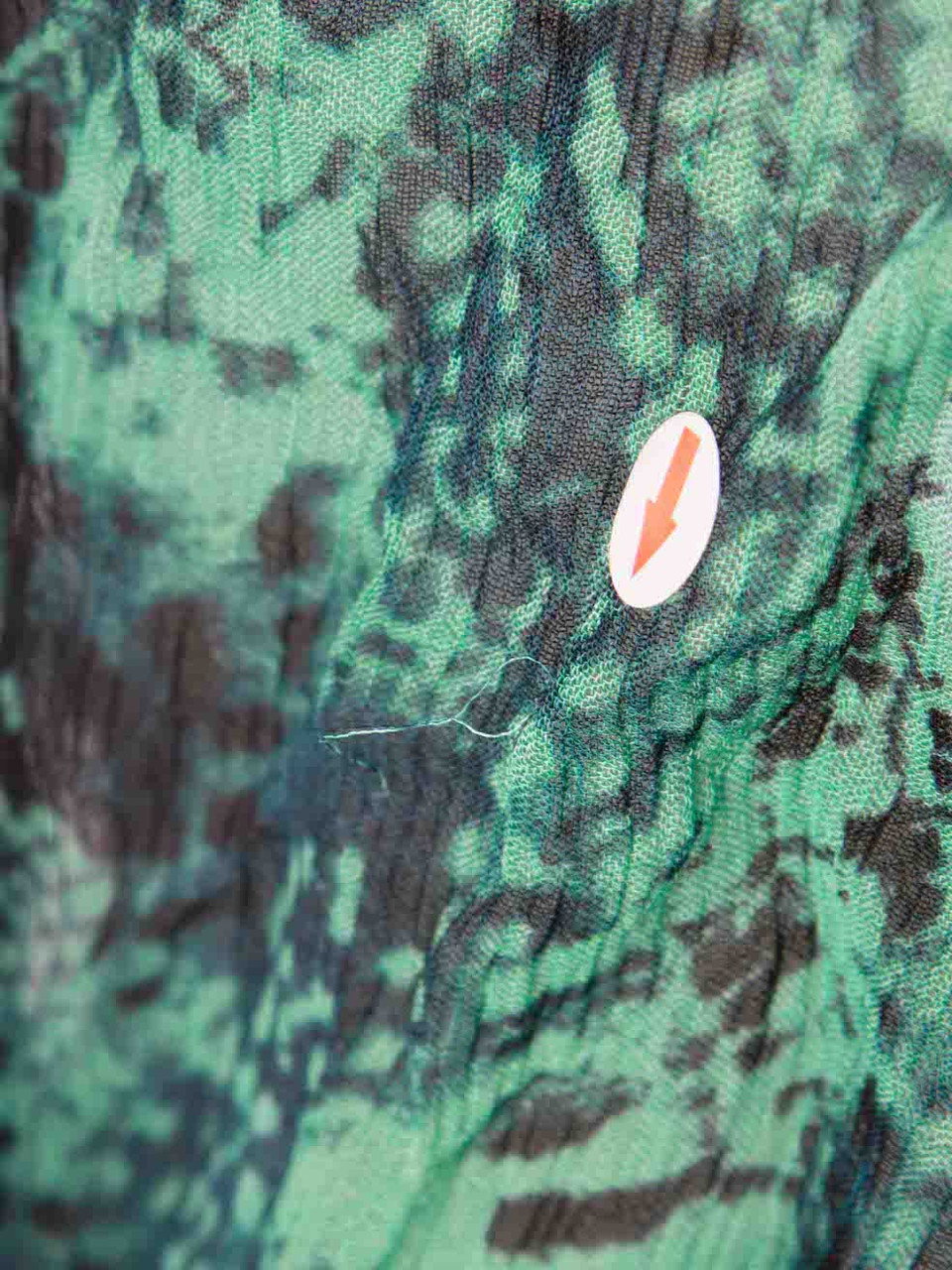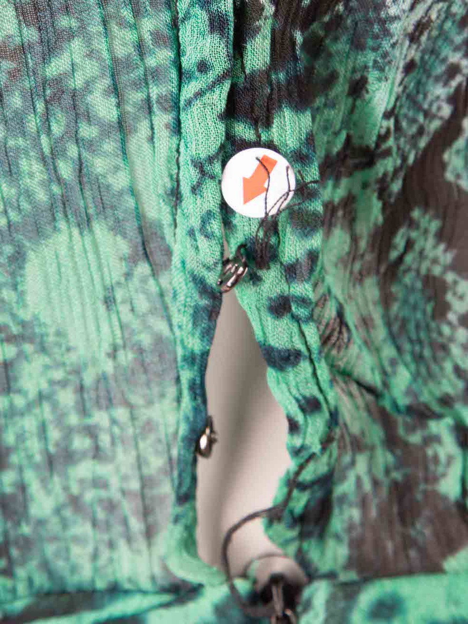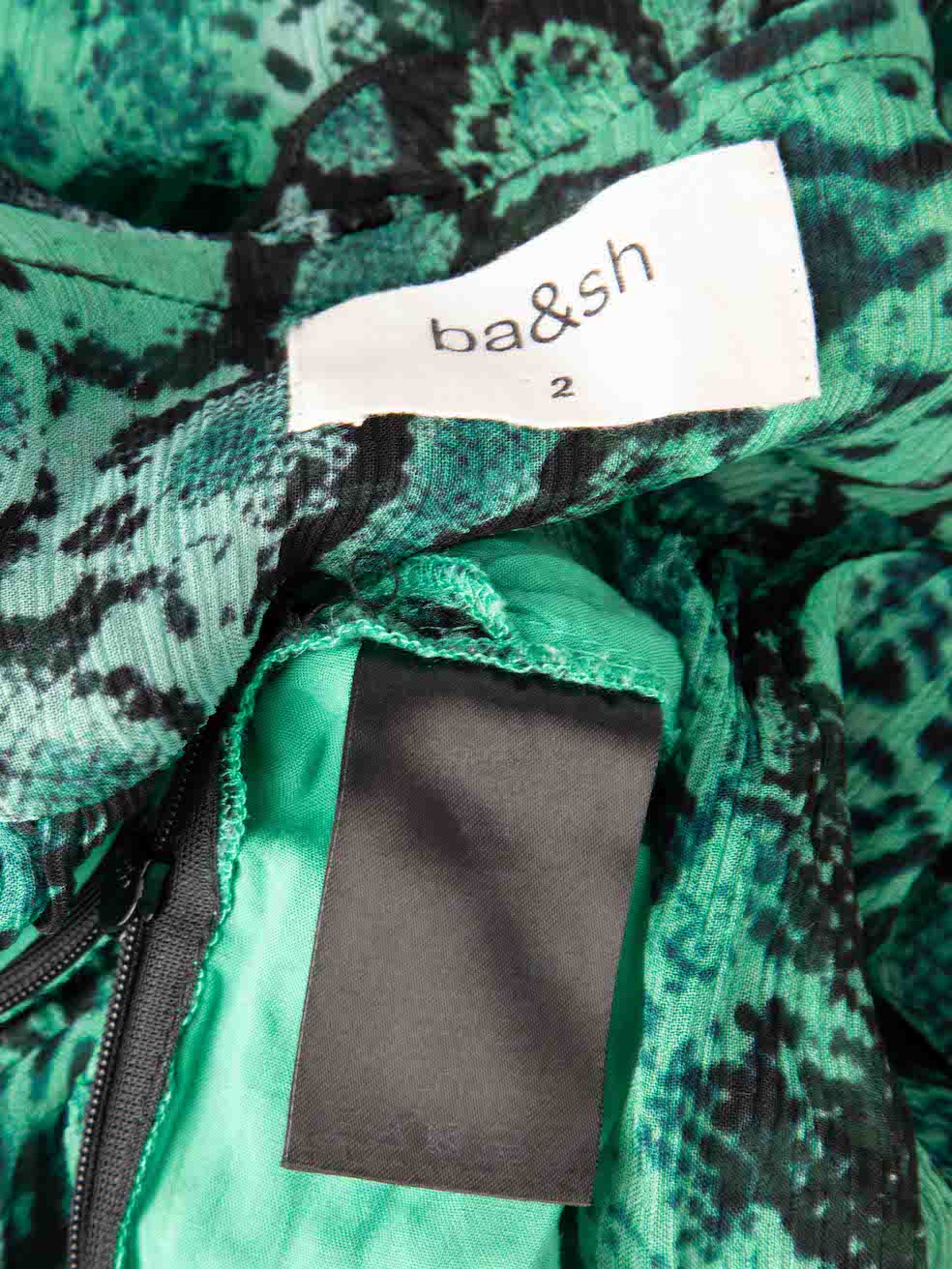 Green mini dress in excellent, pre-loved condition. With snakeskin pattern, sheer, long sleeves, round neck, button up fastening and buttoned cuffs. Composition: 100% Viscose. Hand wash. Shoulders: 35 cm Bust: 46 cm Waist: 32 cm Hip: 44 cmSleeve Length: 58 cm Length: 84 cm