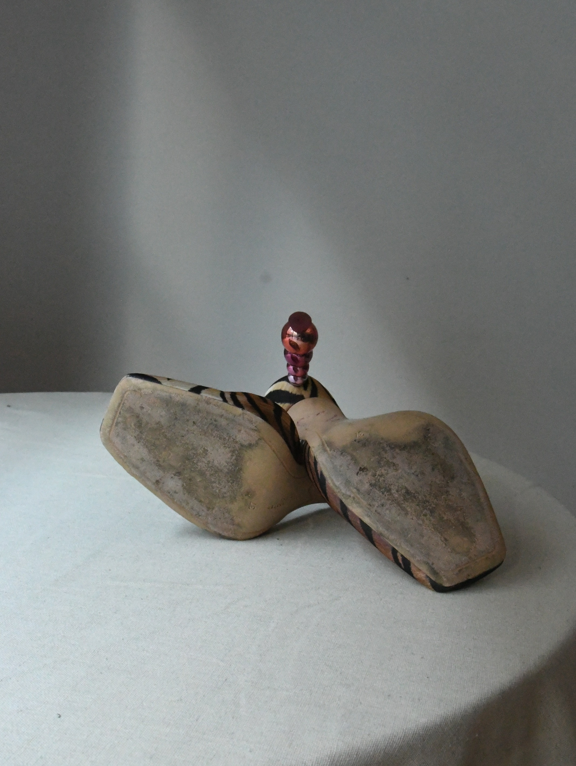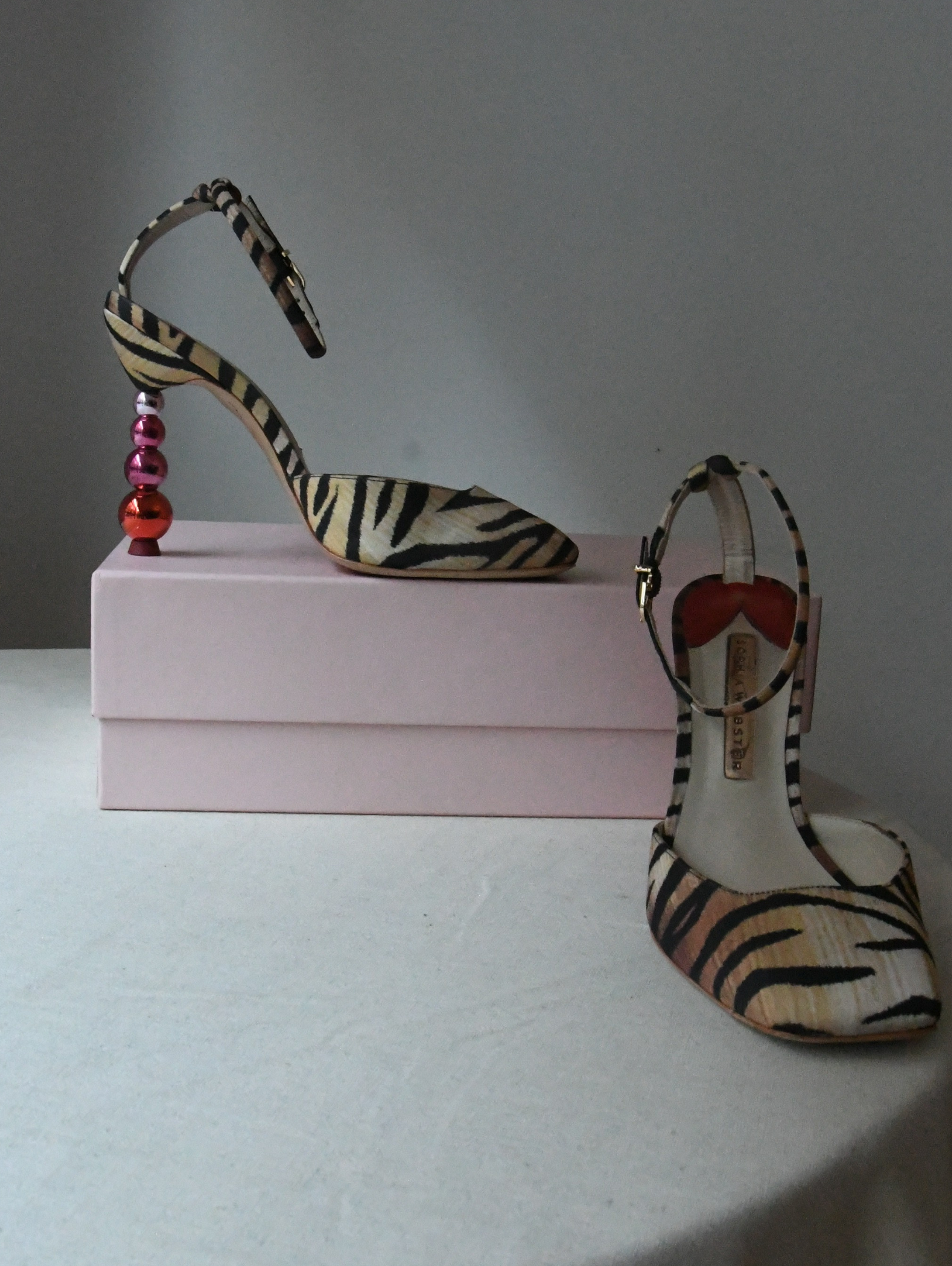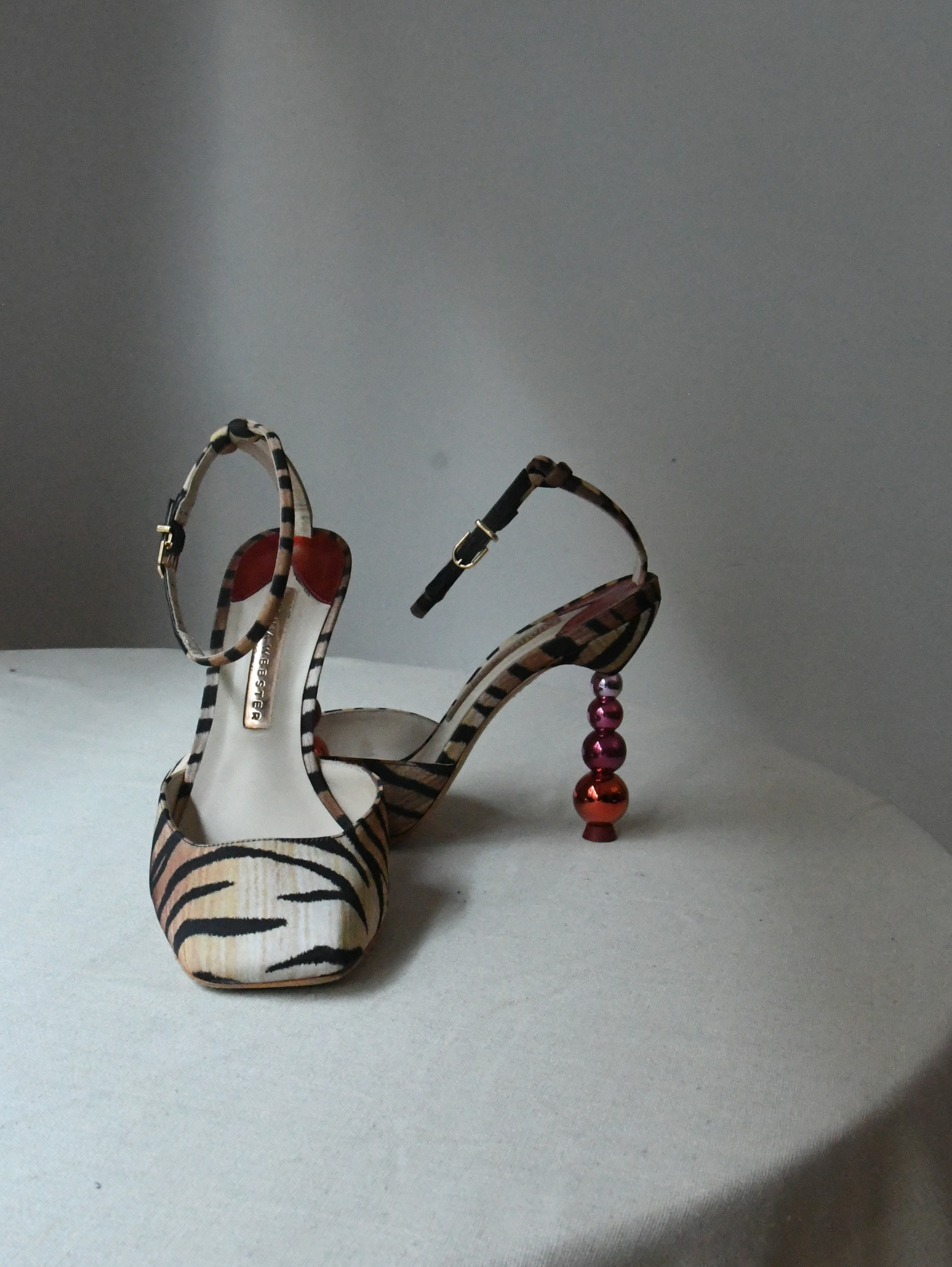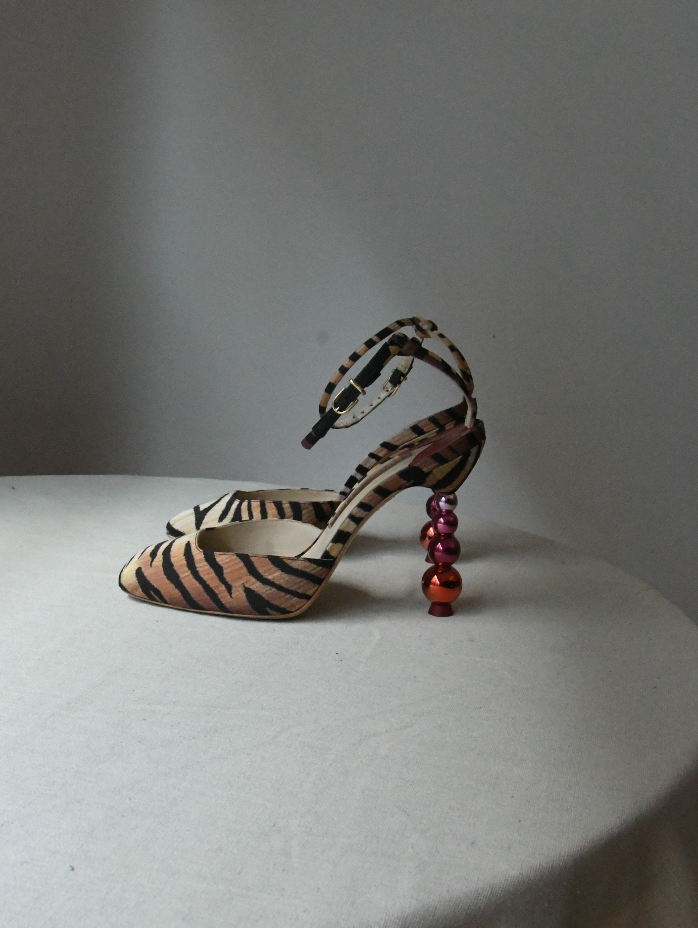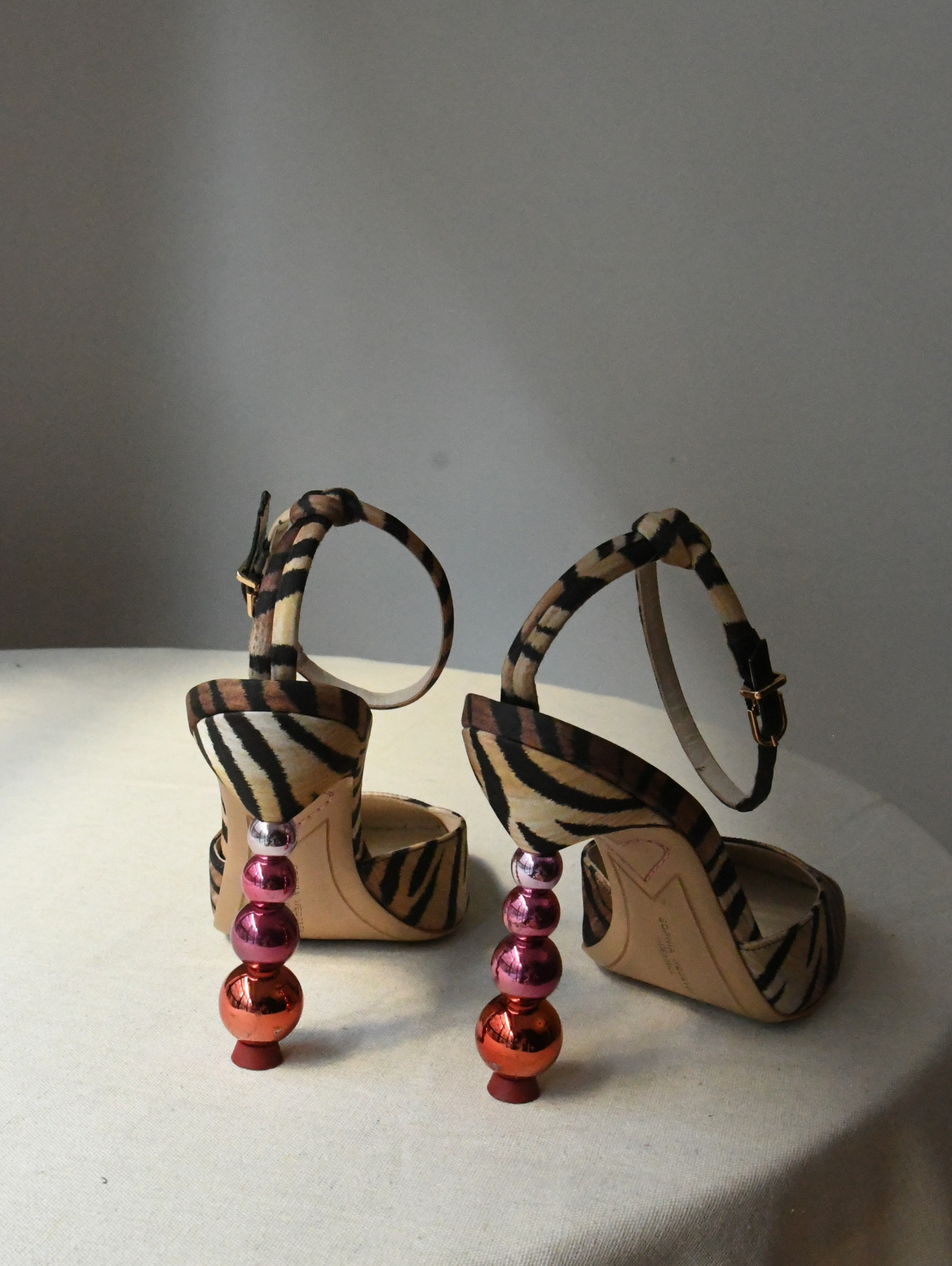 Tiger print square toe, stiletto heel with multi coloured sphere shape heel.