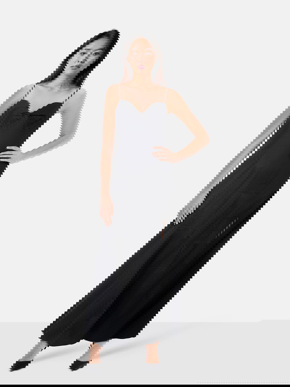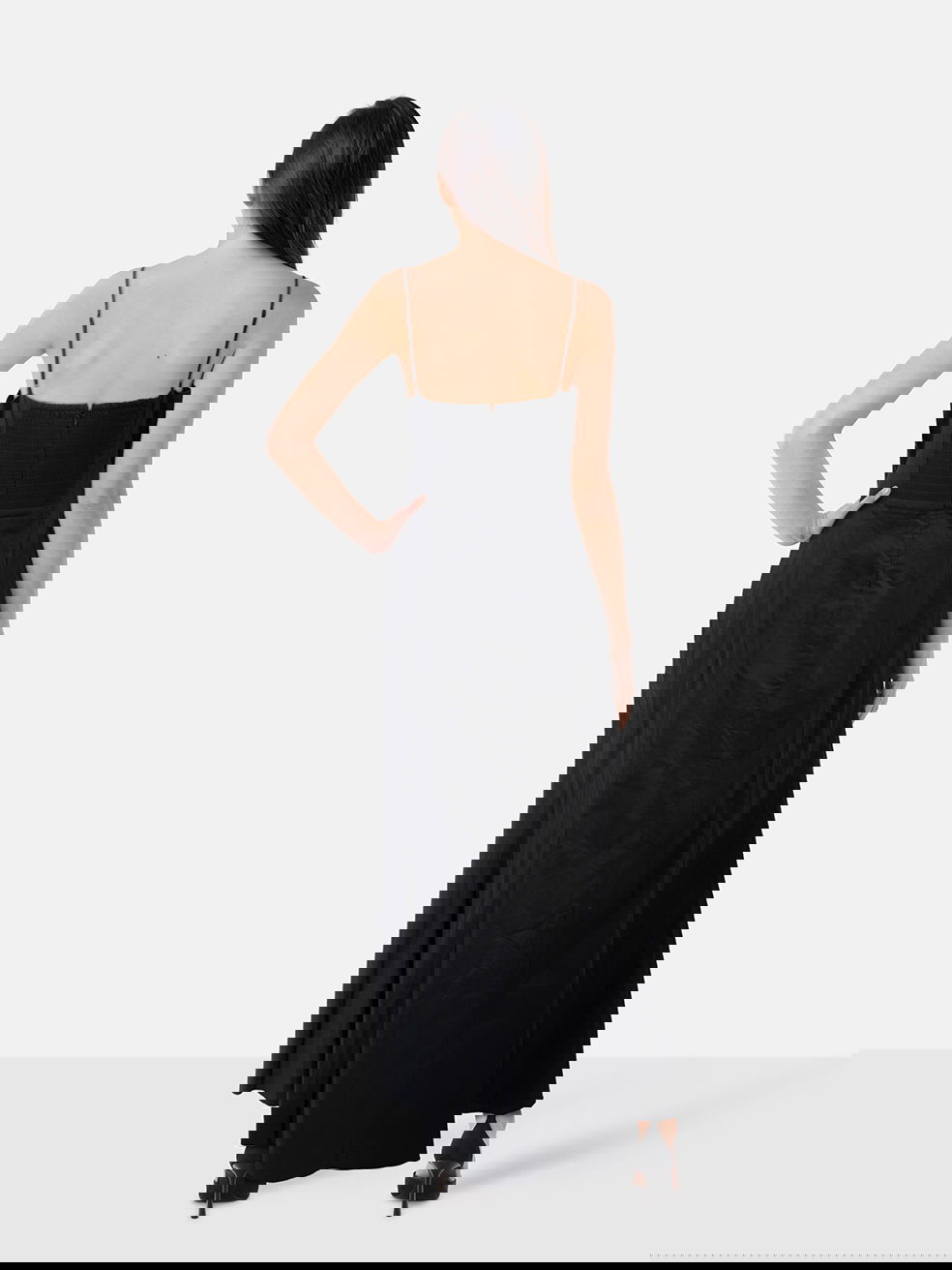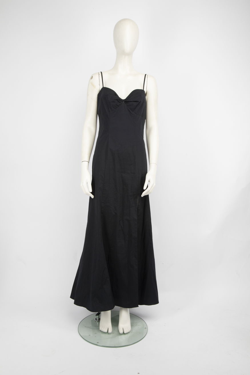 Strappy black maxi dress in excellent, pre-worn condition with adjustable straps, elastic bag and zip and hook fastening. Composition: 98% cotton, 2% spandex. Dry clean only. Length: 144cm.