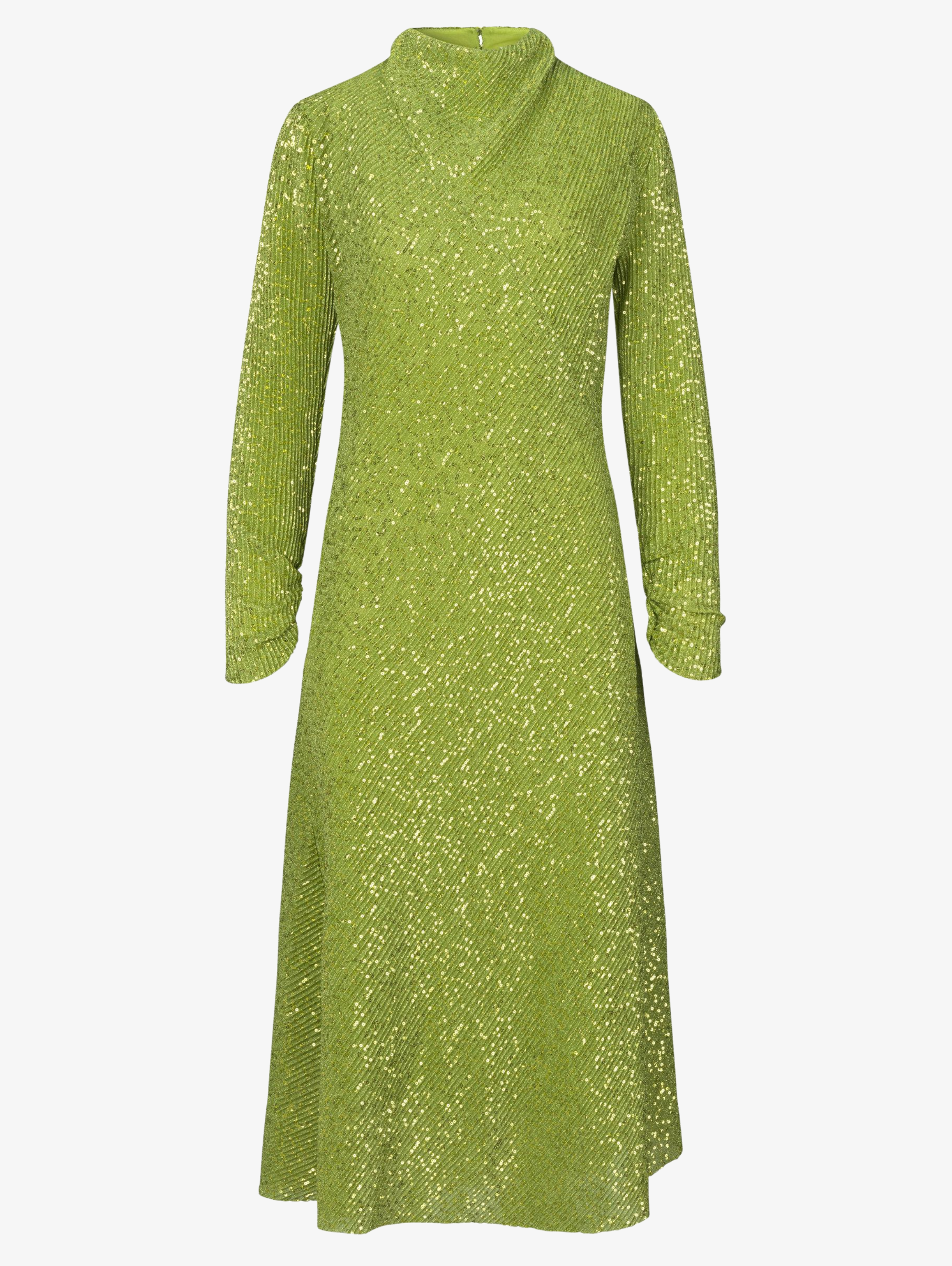 Green, long-sleeved, sequinned dress in excellent, pre-worn condition. Composition: 50% metallic, 50% polyester.