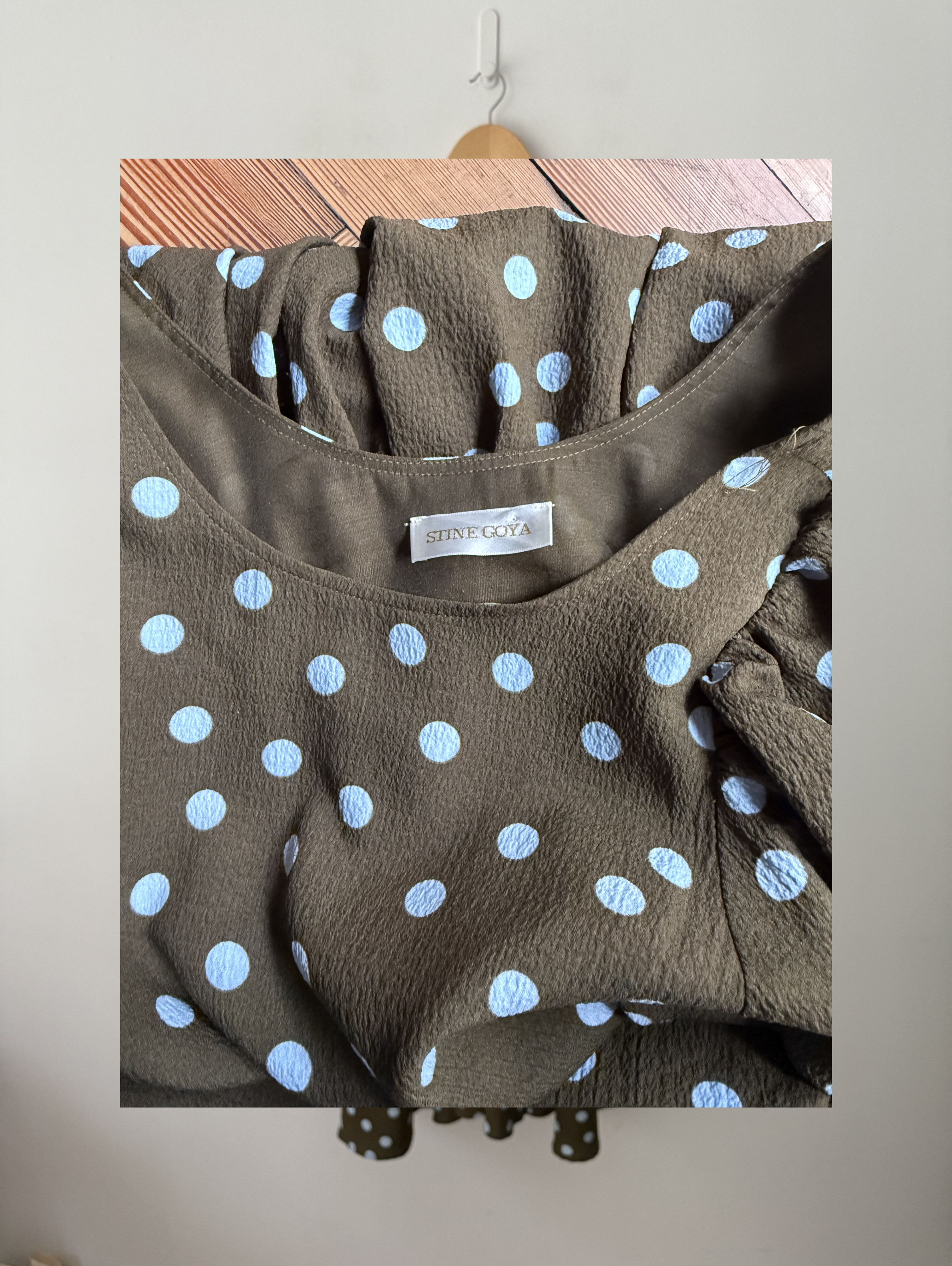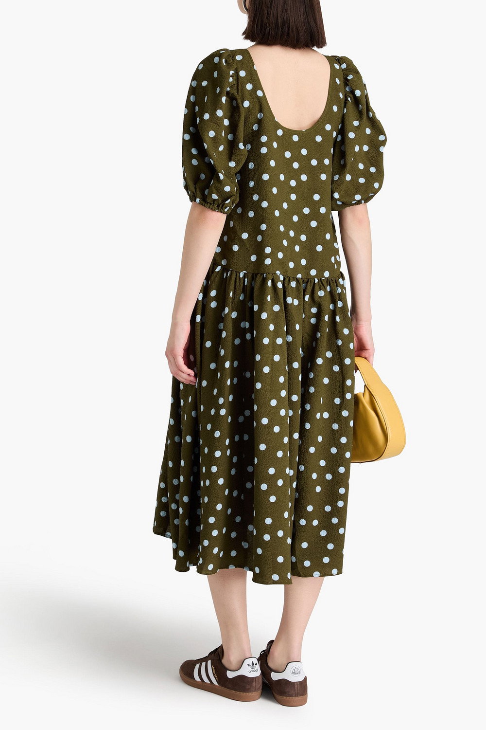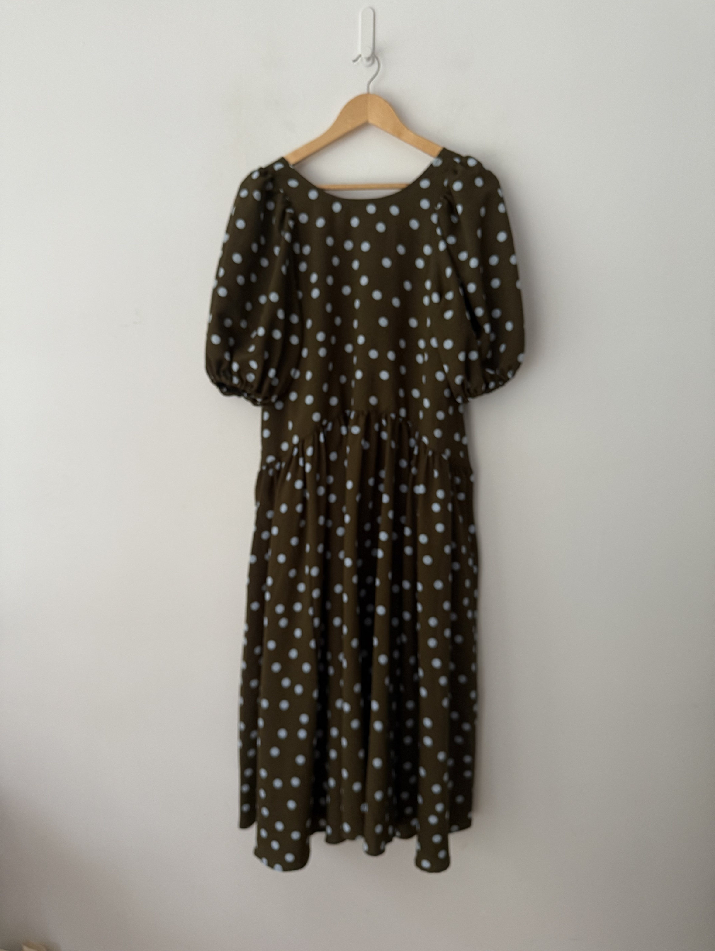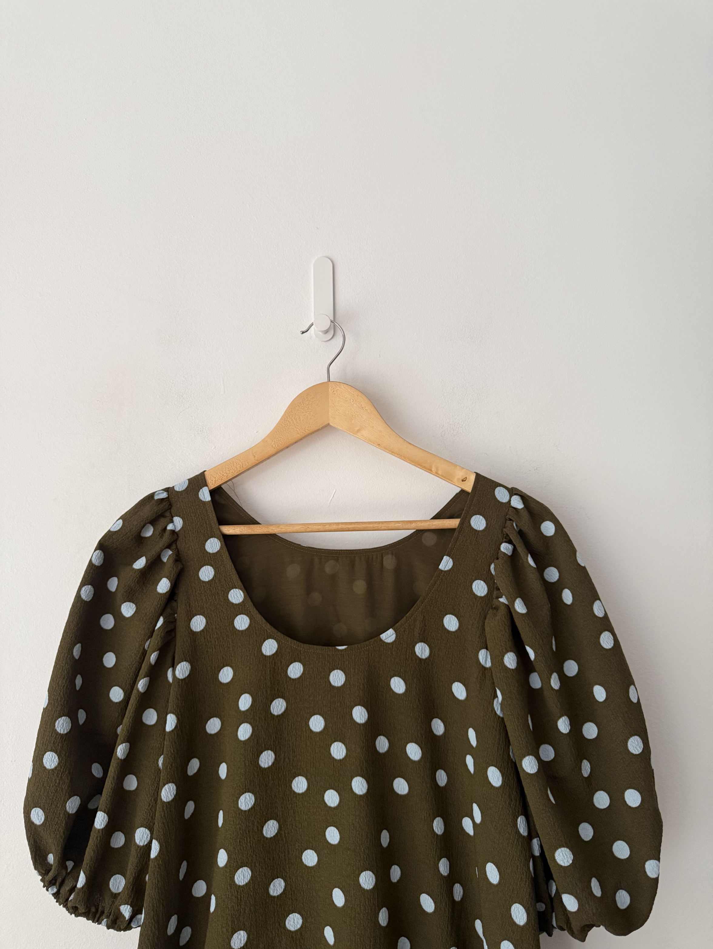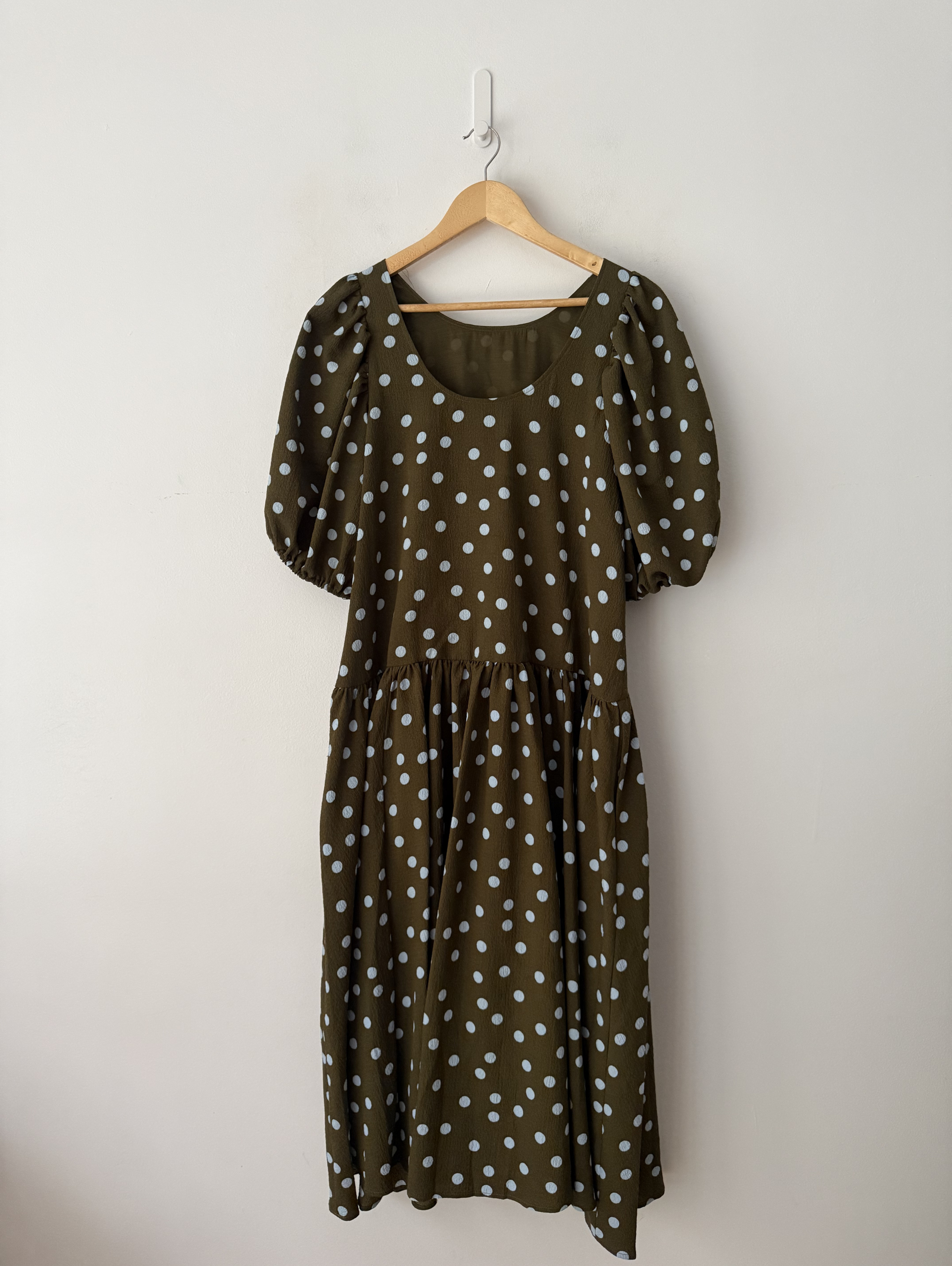 Dress, Polka-dot, Crepe, Crinkled, Gathered, Elasticated cuffs, Two side slit pockets, Slips on, Partially lined, Mid-weight, slightly stretchy fabric.