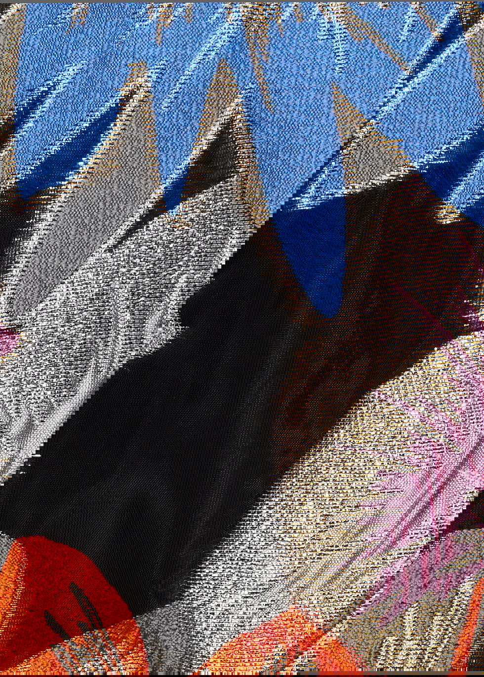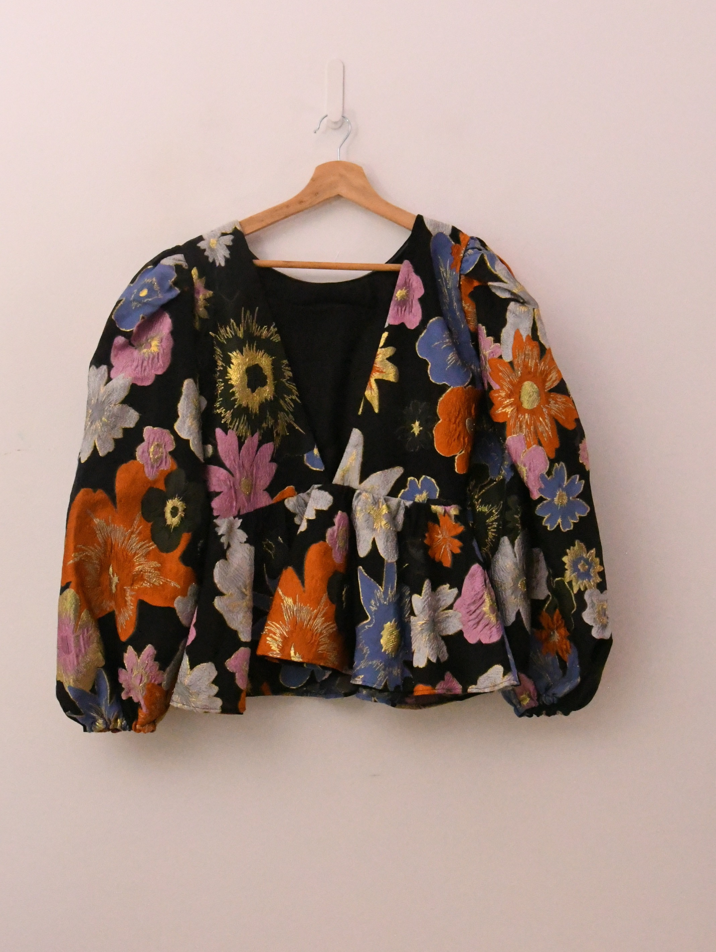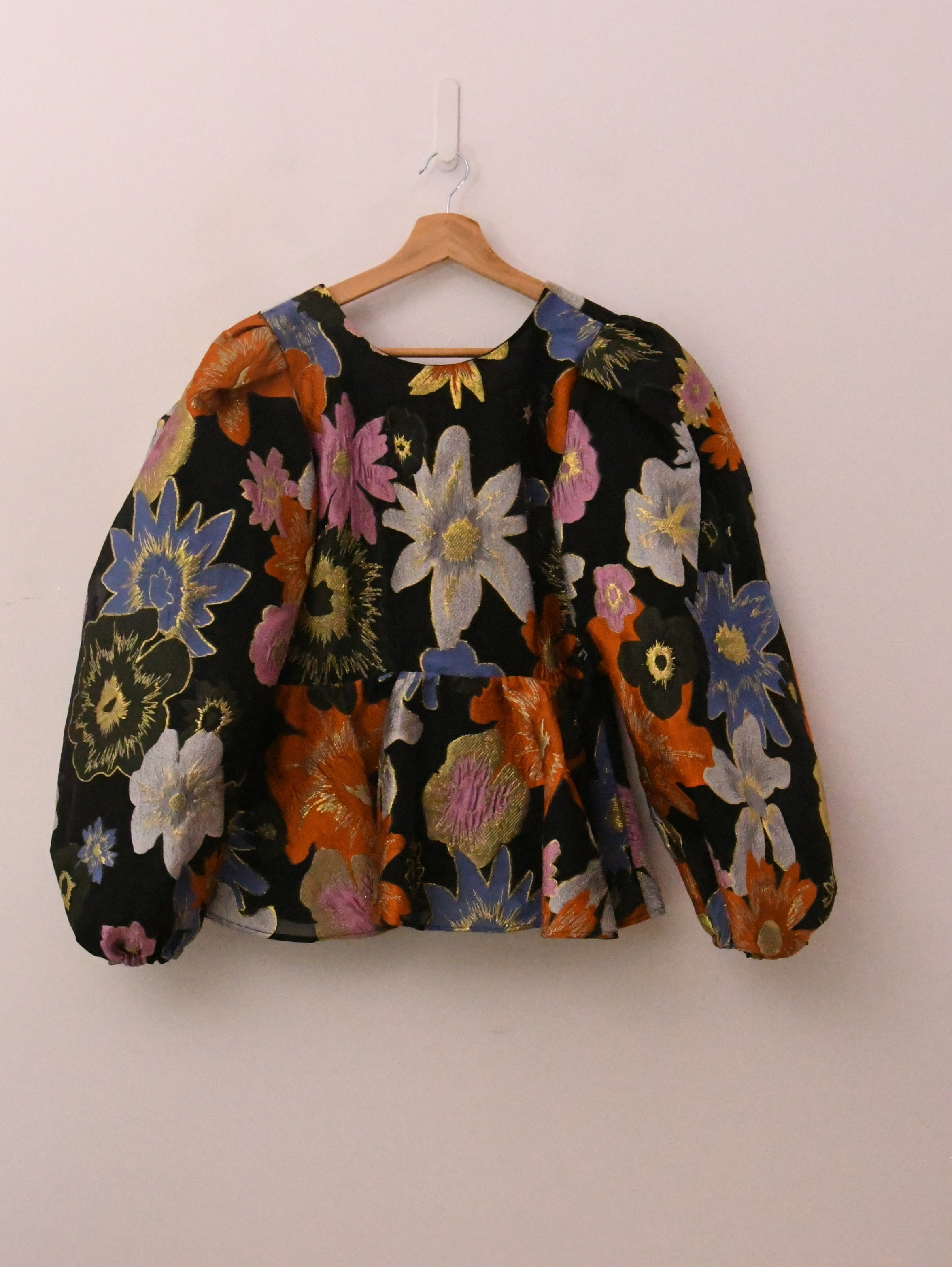 Stine Goya black organza top. Multicoloured floral brocade with gold metallic weave, round-neck, balloon sleeves, low back, fully lined. Concealed zip fastening at side.