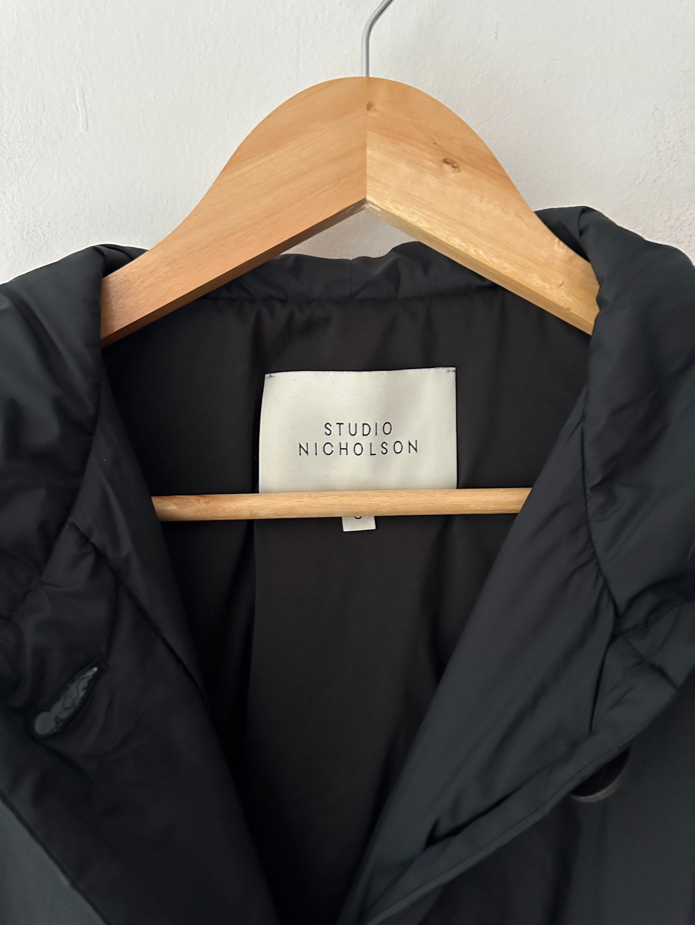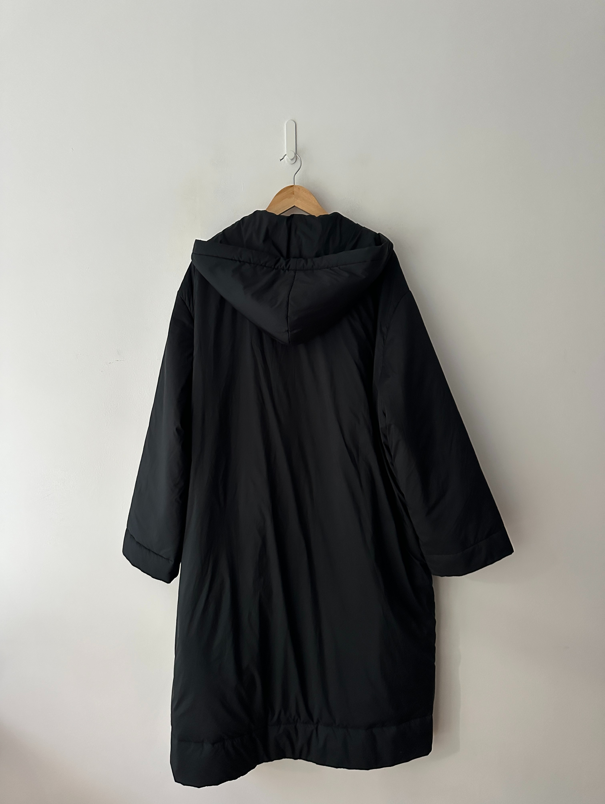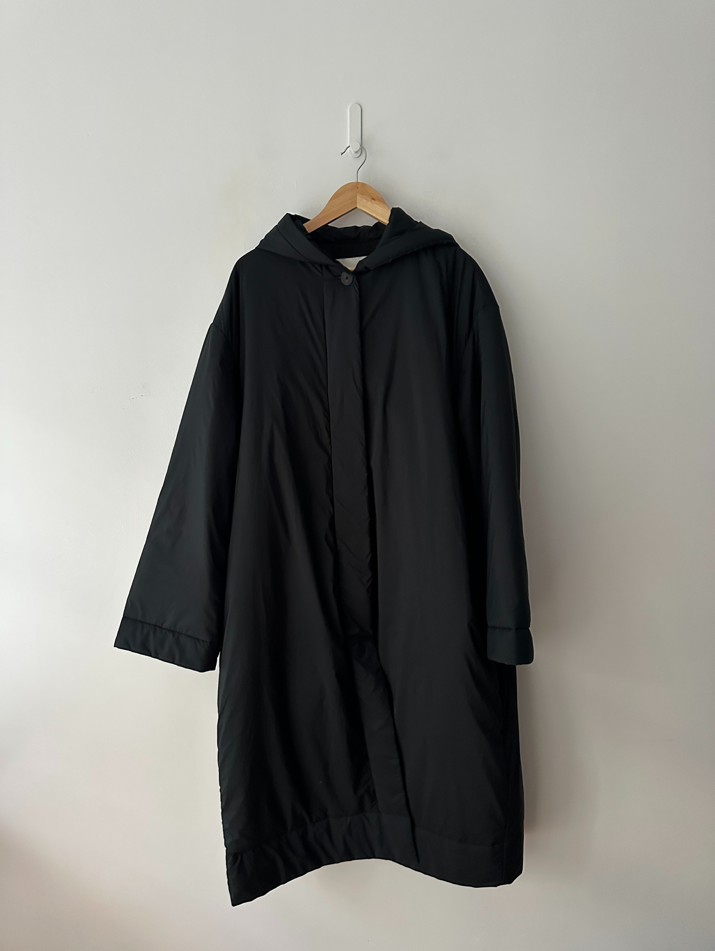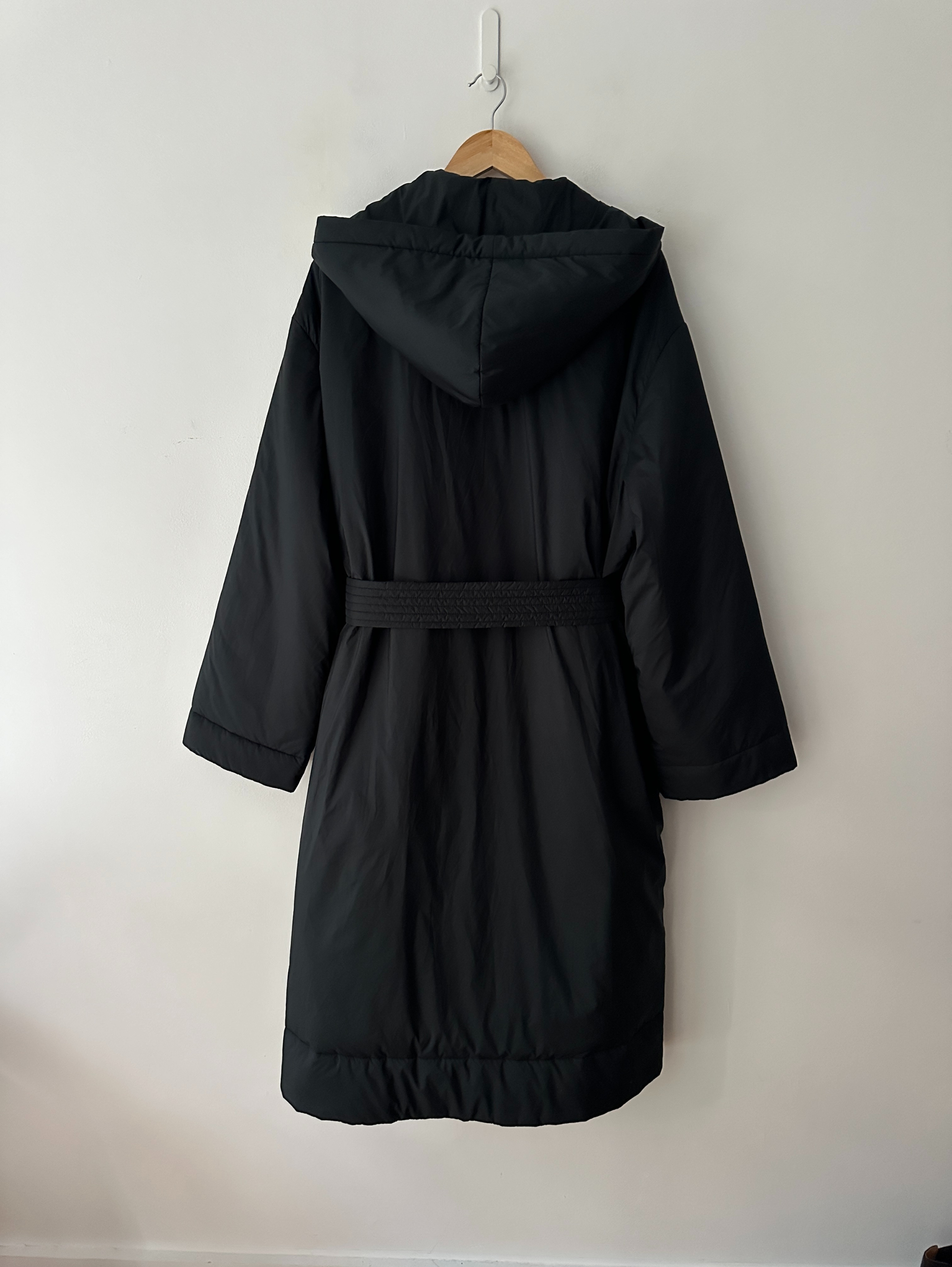 Kariba coat is constructed from a powder-coated parachute nylon, and filled with Ecodown fibres for superior heat retention. Its design diverges from typical down jackets in the inclusion of a hood and a belt.