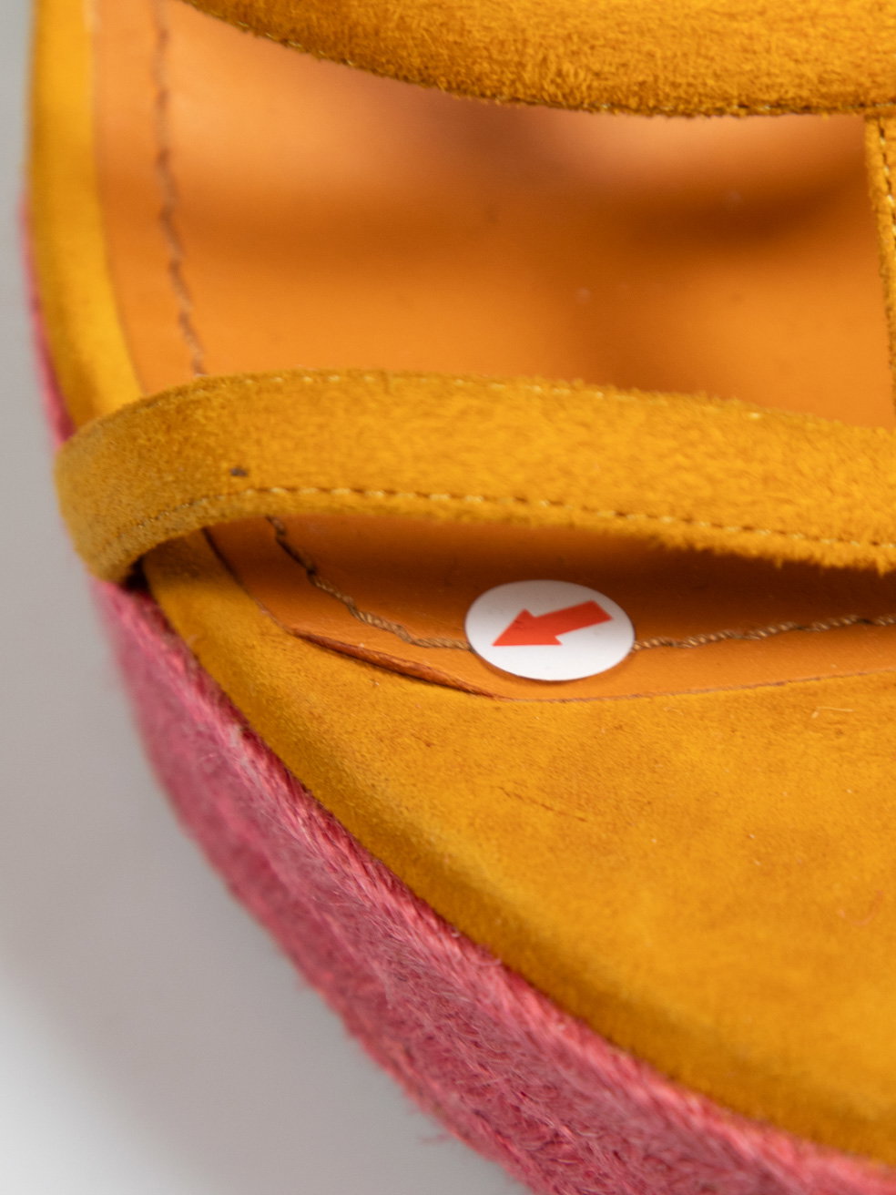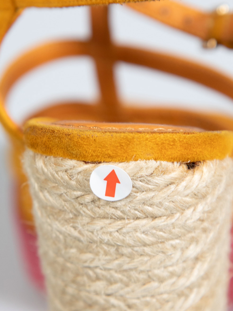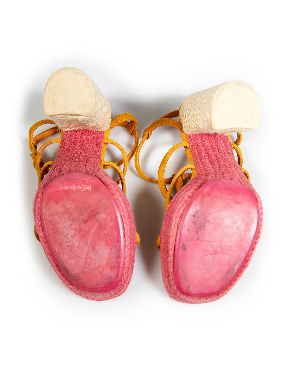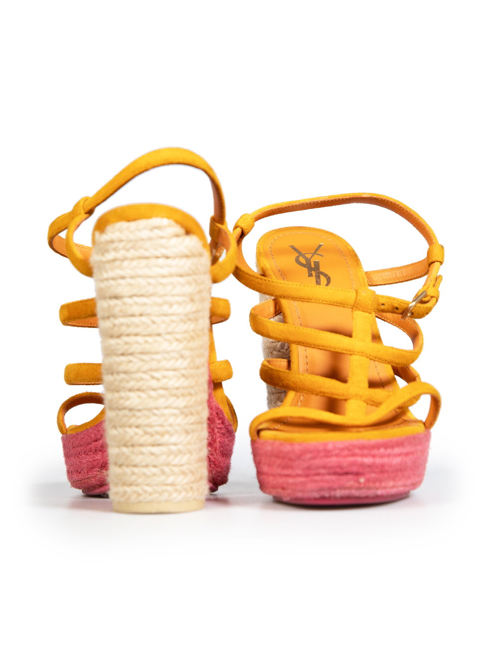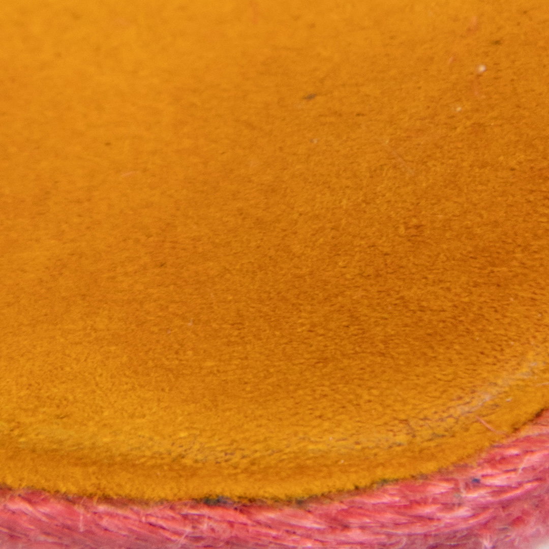Orange suede rope woven heels. Minor discolouration to orange suede on both heels. Discolouration mark on left shoe strap at top. Leather sole on right shoe is starting to peel away. Composition Exterior: Suede. Interior: Leather. Measurements: Platform Height: 38mm Heel Height: 152mm Soles: 215mm