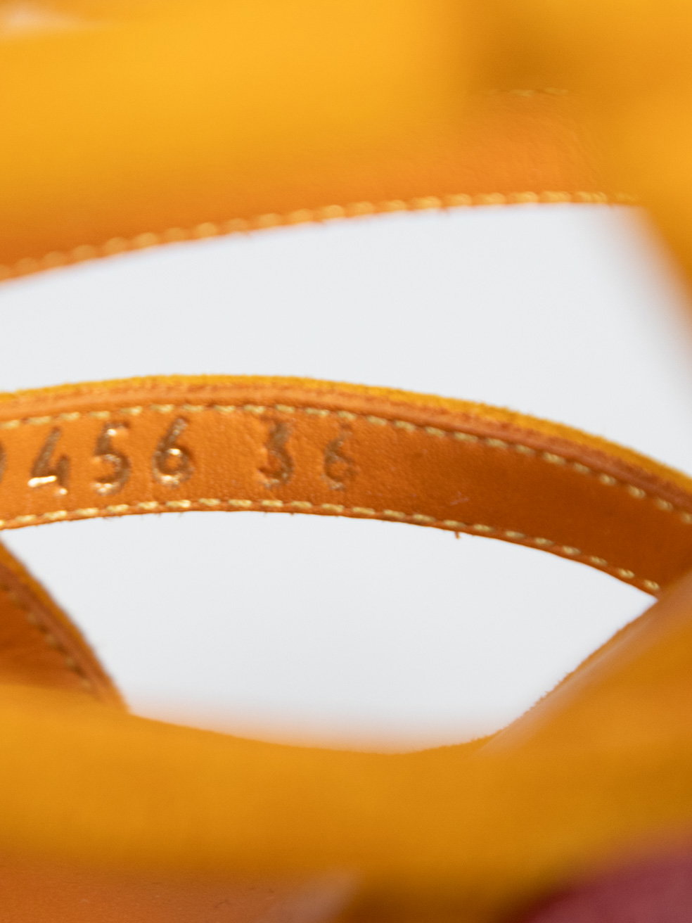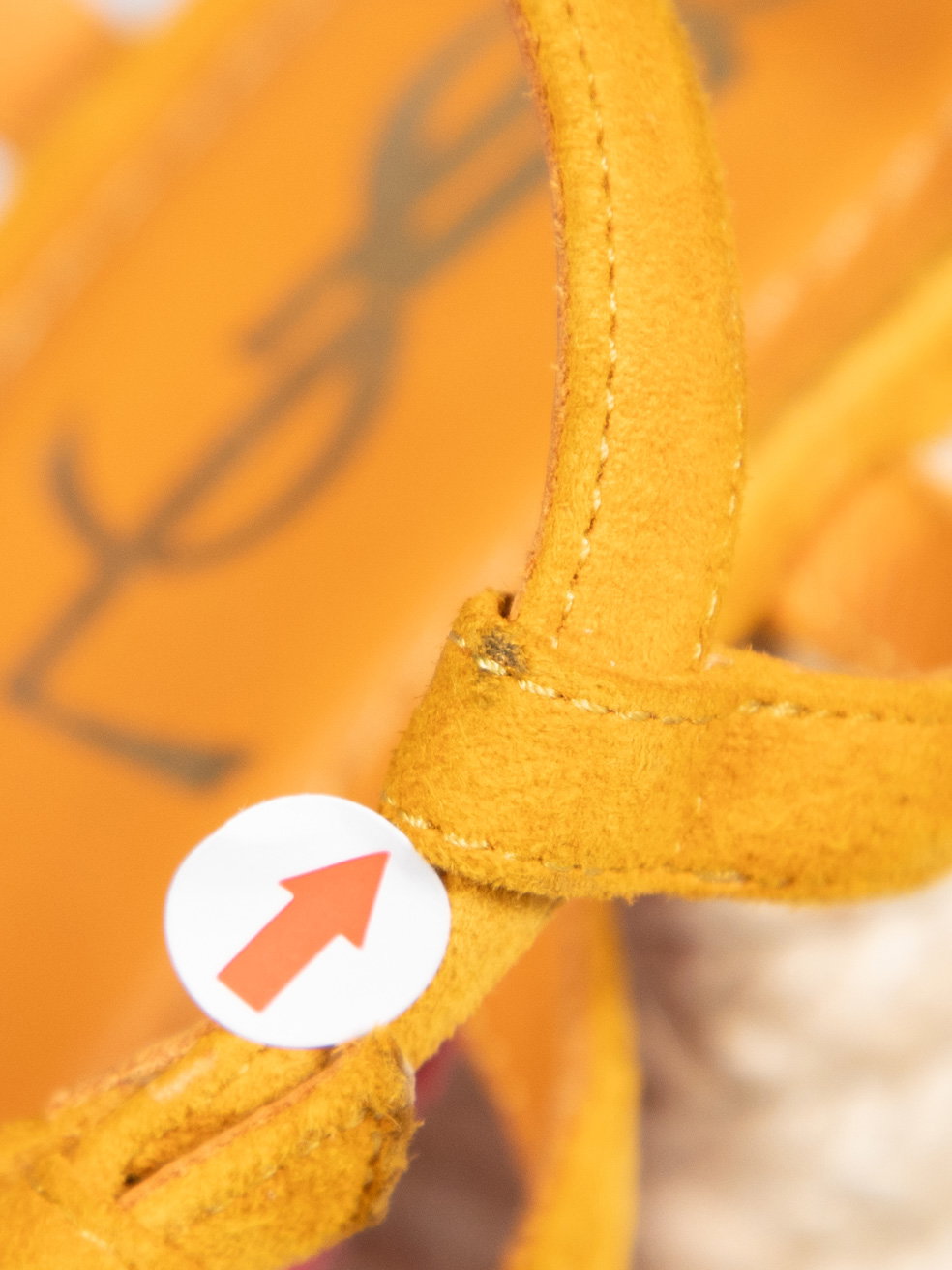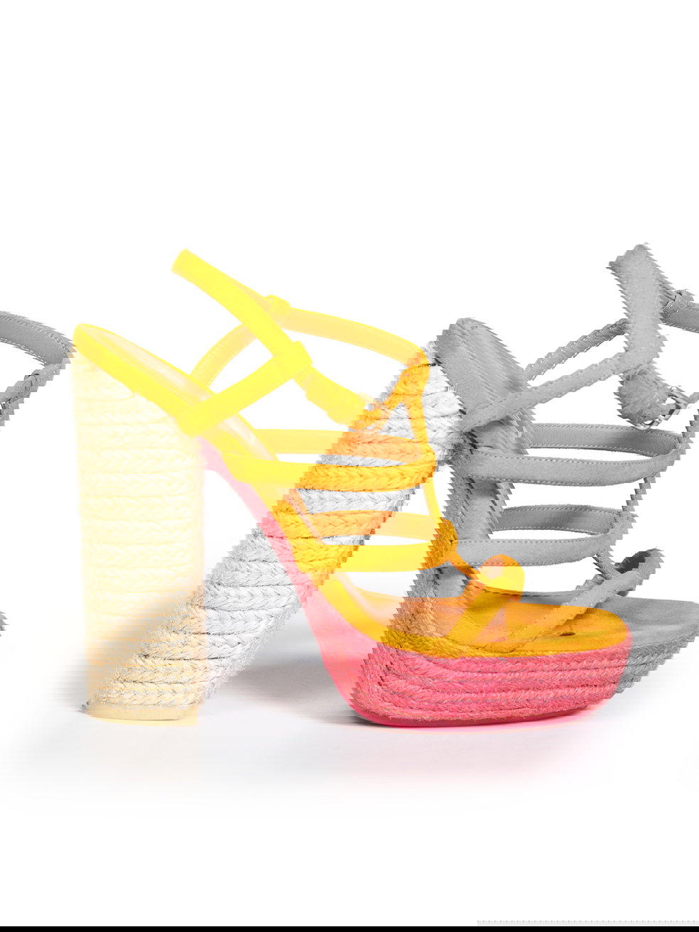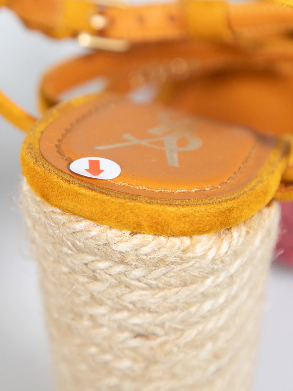 Orange suede rope woven heels. Minor discolouration to orange suede on both heels. Discolouration mark on left shoe strap at top. Leather sole on right shoe is starting to peel away. Composition Exterior: Suede. Interior: Leather. Measurements: Platform Height: 38mm Heel Height: 152mm Soles: 215mm