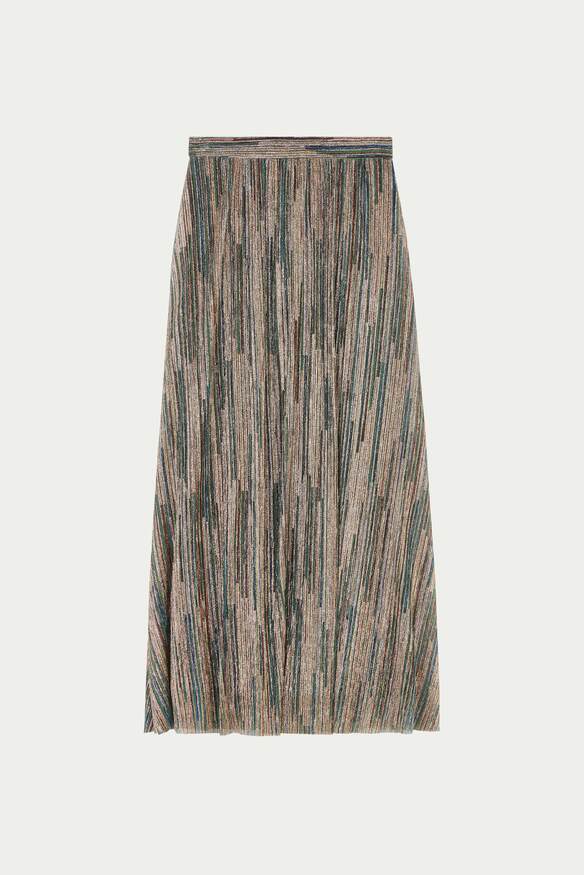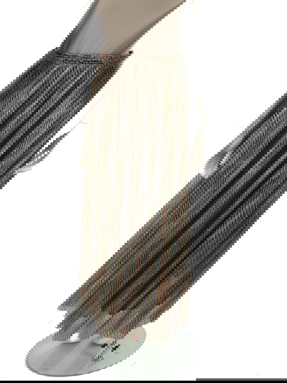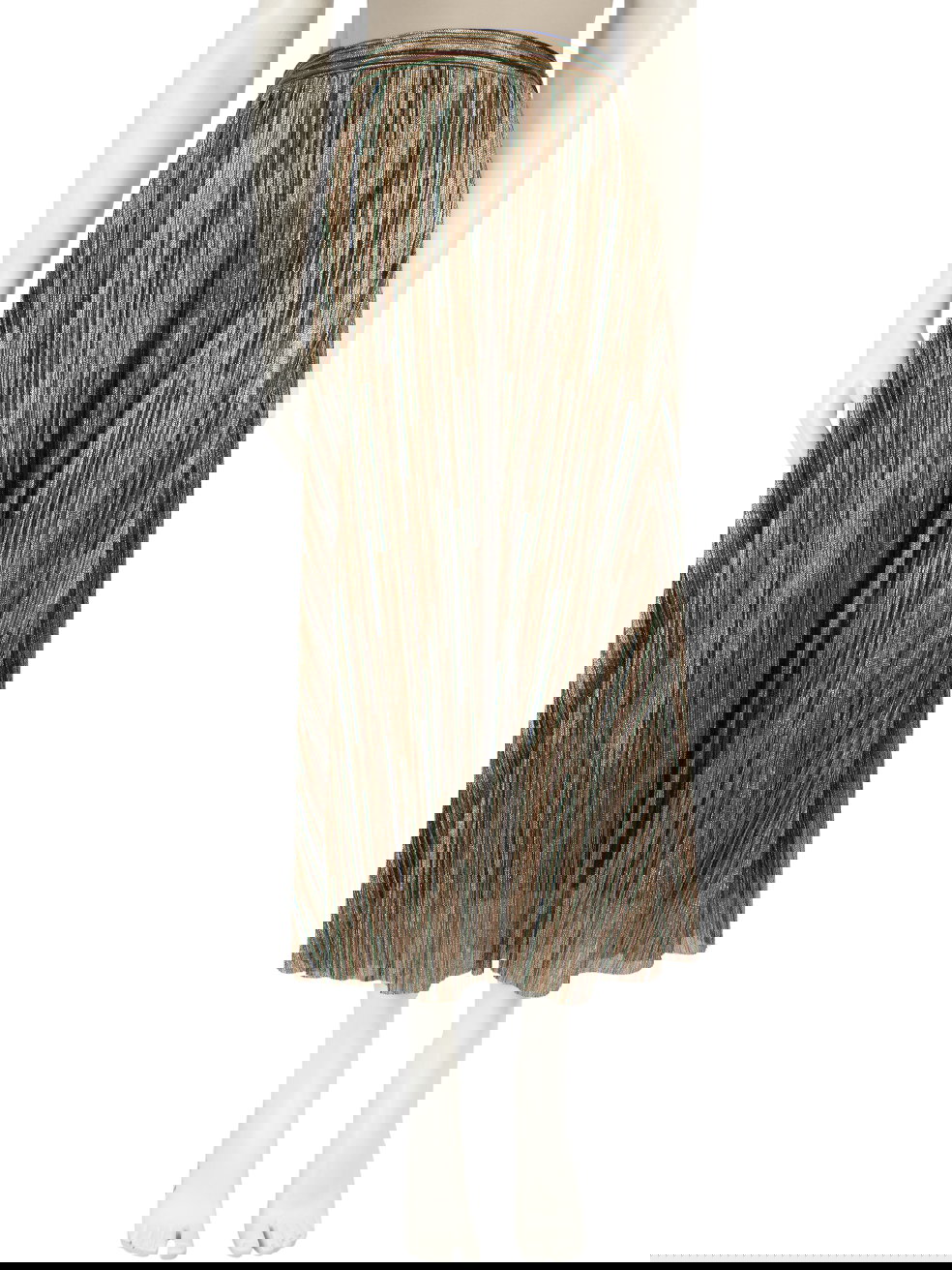 Multicolour metallized fiber midi skirt in excellent, pre-loved condition. With striped pattern, elasticated waistband and side zip fastening. Composition: 53% Metallized fiber, 47% Polyester. Hand wash only. Waist: 35 cm Hip: 57 cm Length: 92 cm